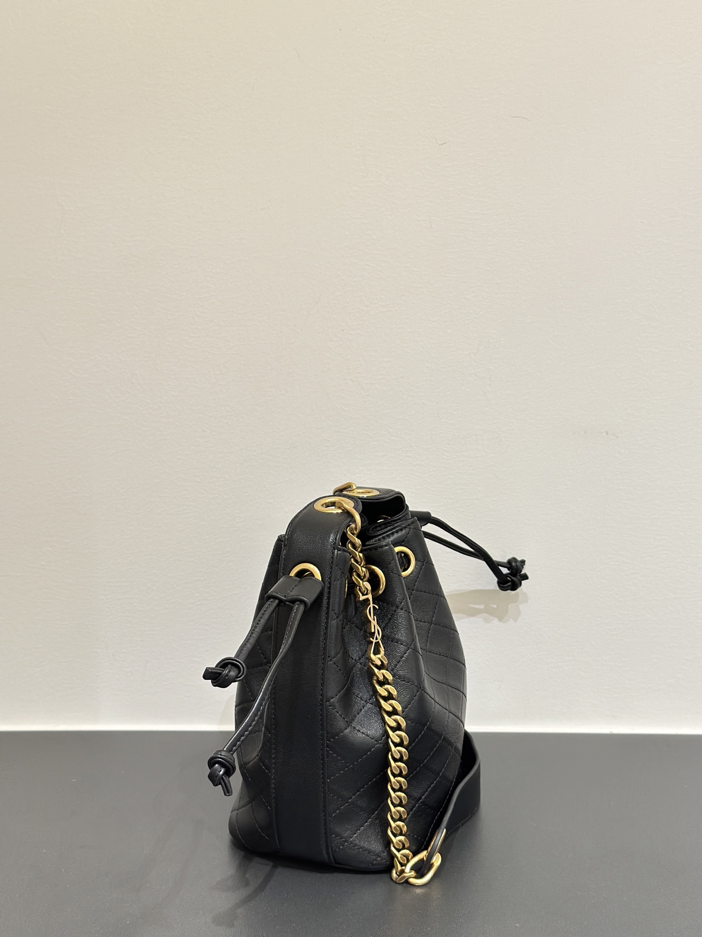 索繩開合設計搭配復古鏈條與皮質肩帶,背起來不僅舒適輕盈,還能自然地襯托出氣質與品味。