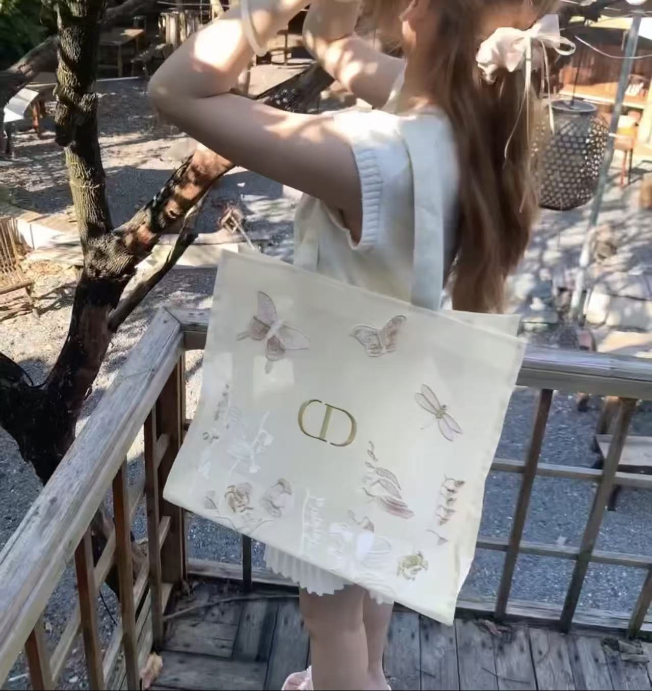 蝴蝶始終象徵著優雅與蛻變。這次分享的 蝴蝶刺繡網紗托特包,將品牌最具標誌性的刺繡工藝融入輕盈的網紗材質中。設計核心聚焦於包身上躍然紙上的蝴蝶立體刺繡,細膩的針綴在半透明的網紗基底上,營造出如同裝置藝術般的穿透感與高級感。