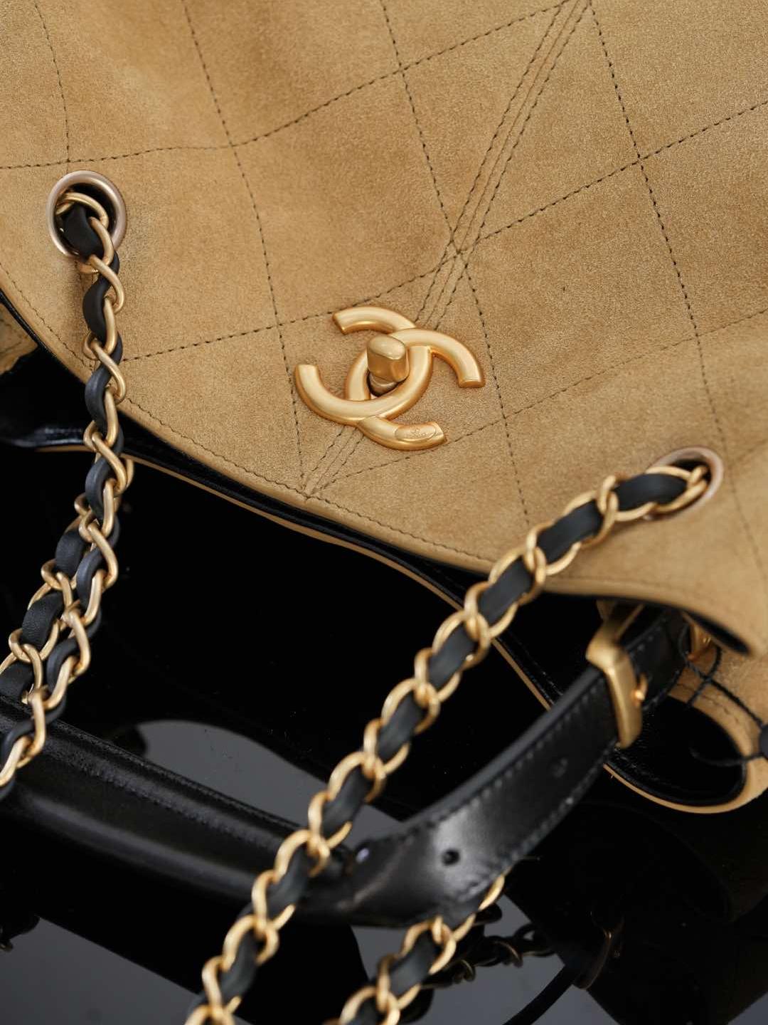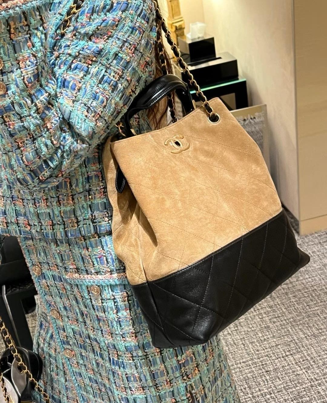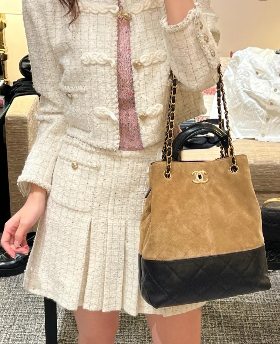 這款麂皮杏色水桶包,真的可以說是本季最令人驚豔的焦點單品之一,從材質選擇、拼接設計到工藝細節,每個環節都精緻得讓人愛不釋手。一亮相就擄獲時尚迷的目光,可謂經典與創新的完美交融。