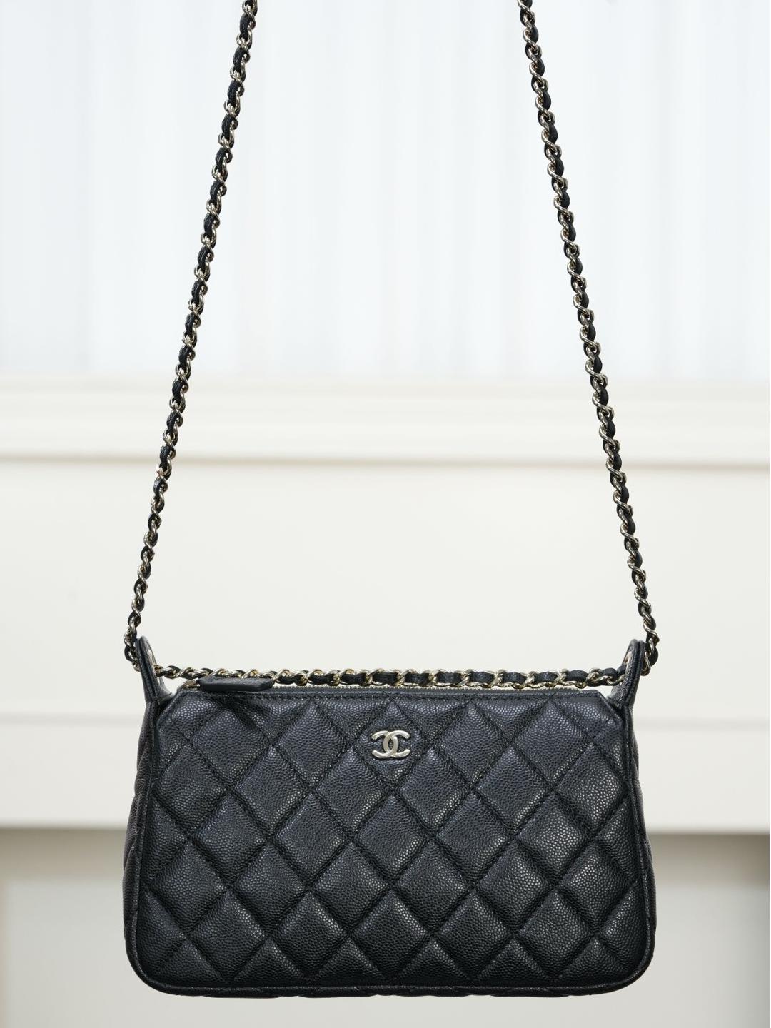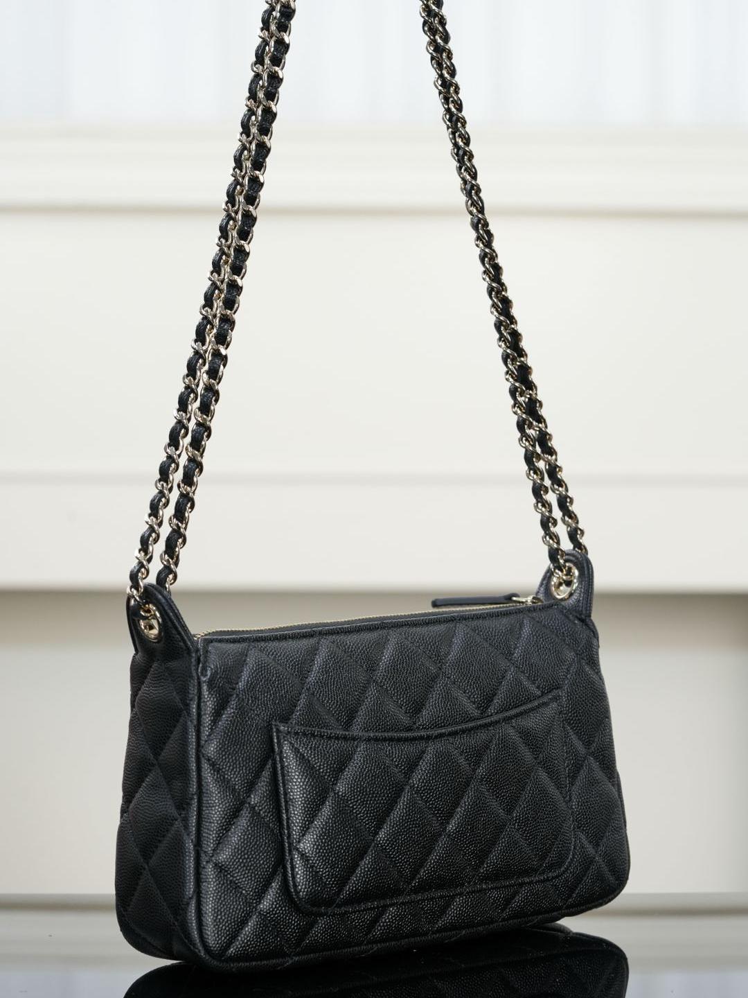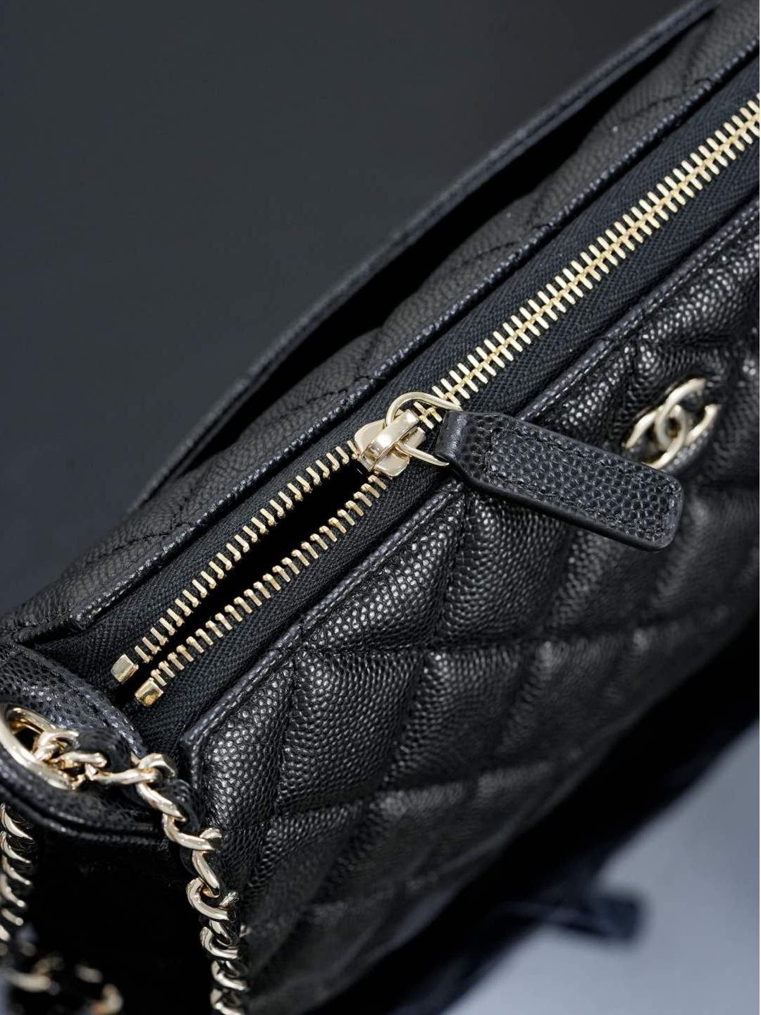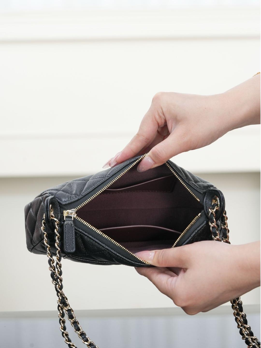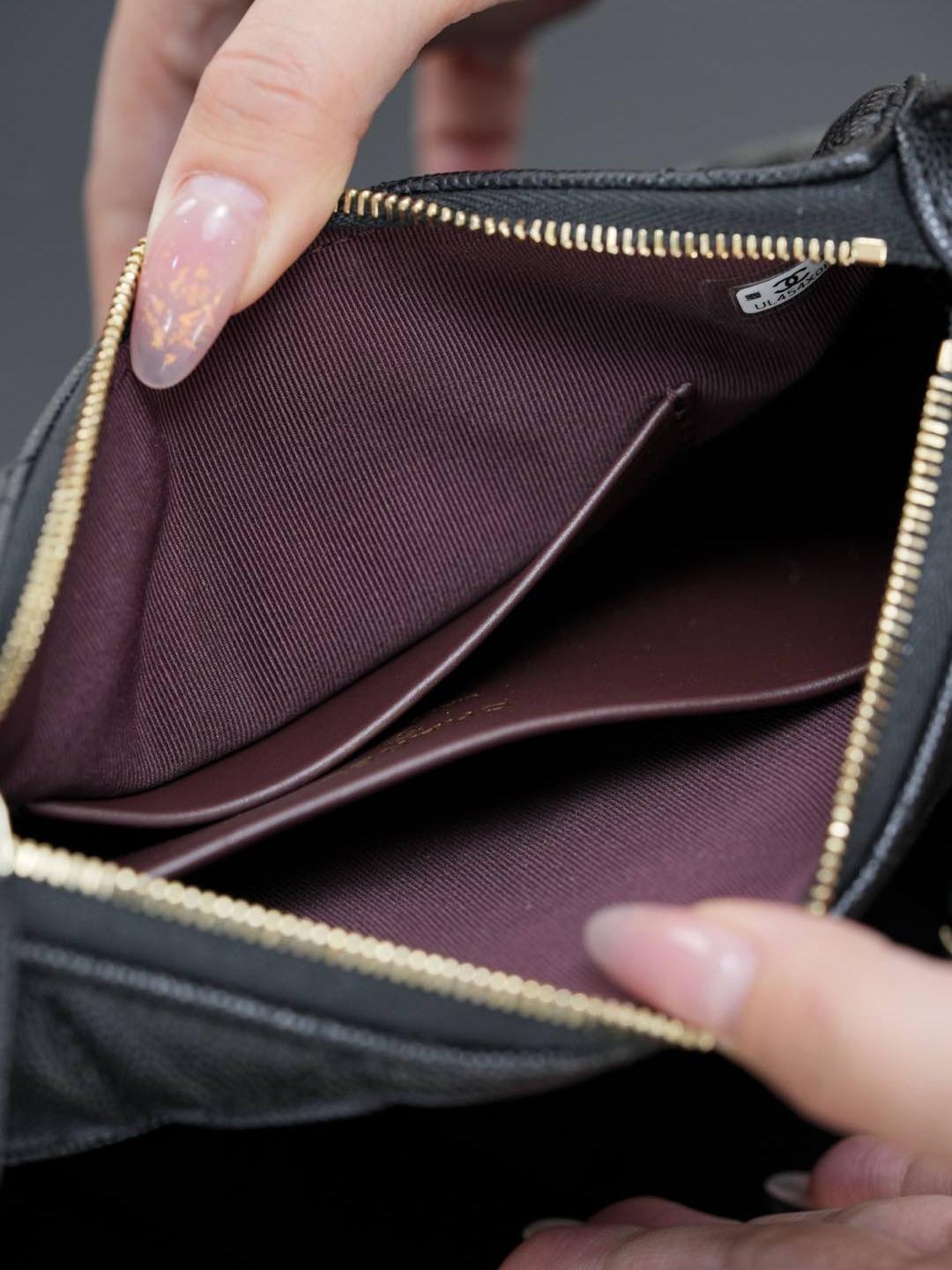 包款搭配純銅製作的香檳金五金件,經過精細打磨處理,鏈條與雙 C 標誌、雞眼配件都帶有光滑鏡面質感,細節處展現出低調卻極致的奢華。拉鍊滑順流暢,開闔之間盡顯細緻工藝。