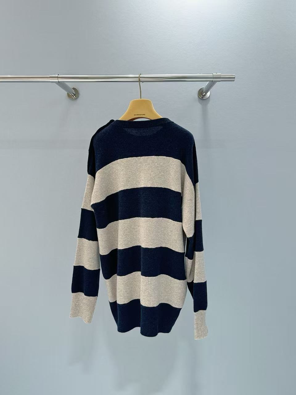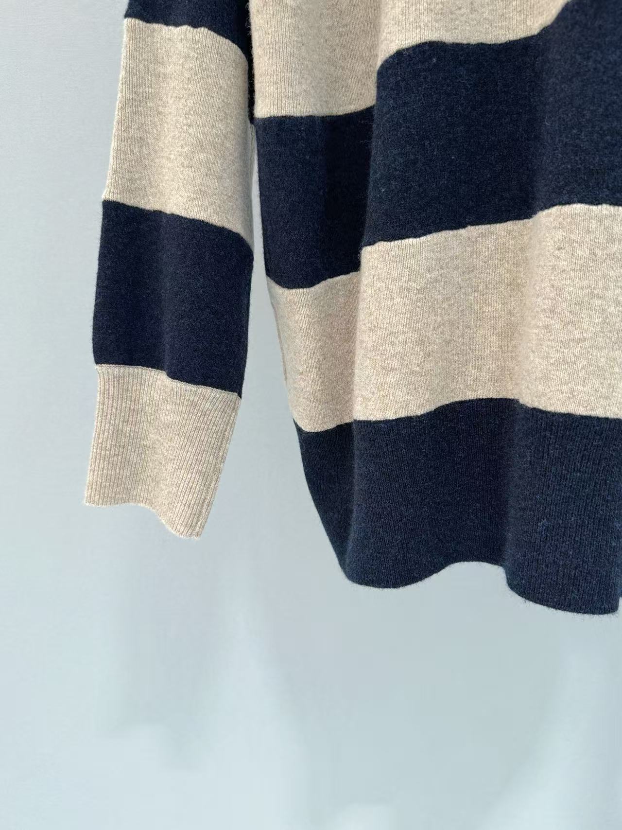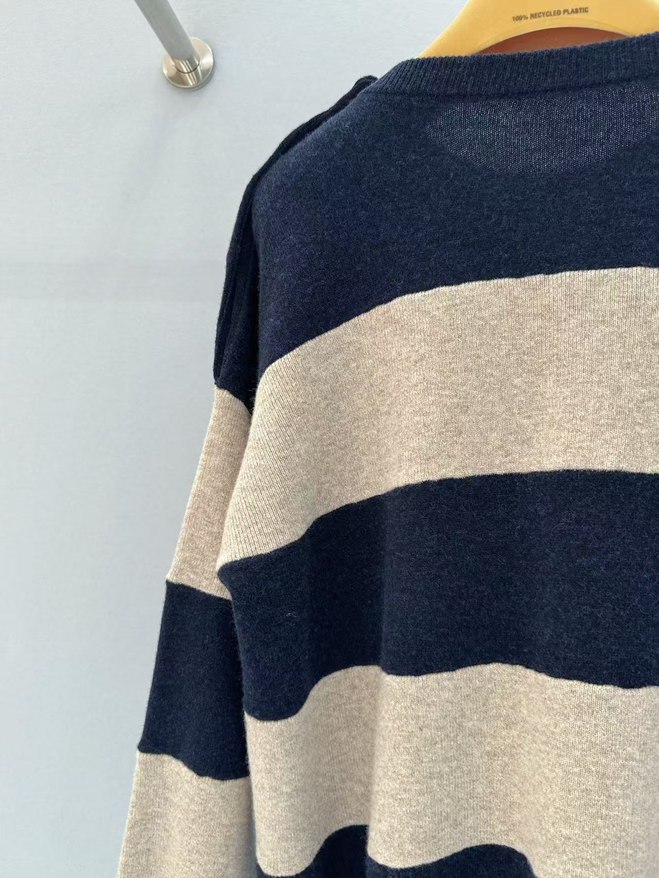 這件毛衣以經典撞色條紋為主角,搭配寬鬆落肩廓形,完美平衡休閒與時尚感。肩部紐扣開合設計增添一抹復古趣味,羅紋針織袖口與下擺讓整體線條乾淨俐落,同時又不失舒適感。