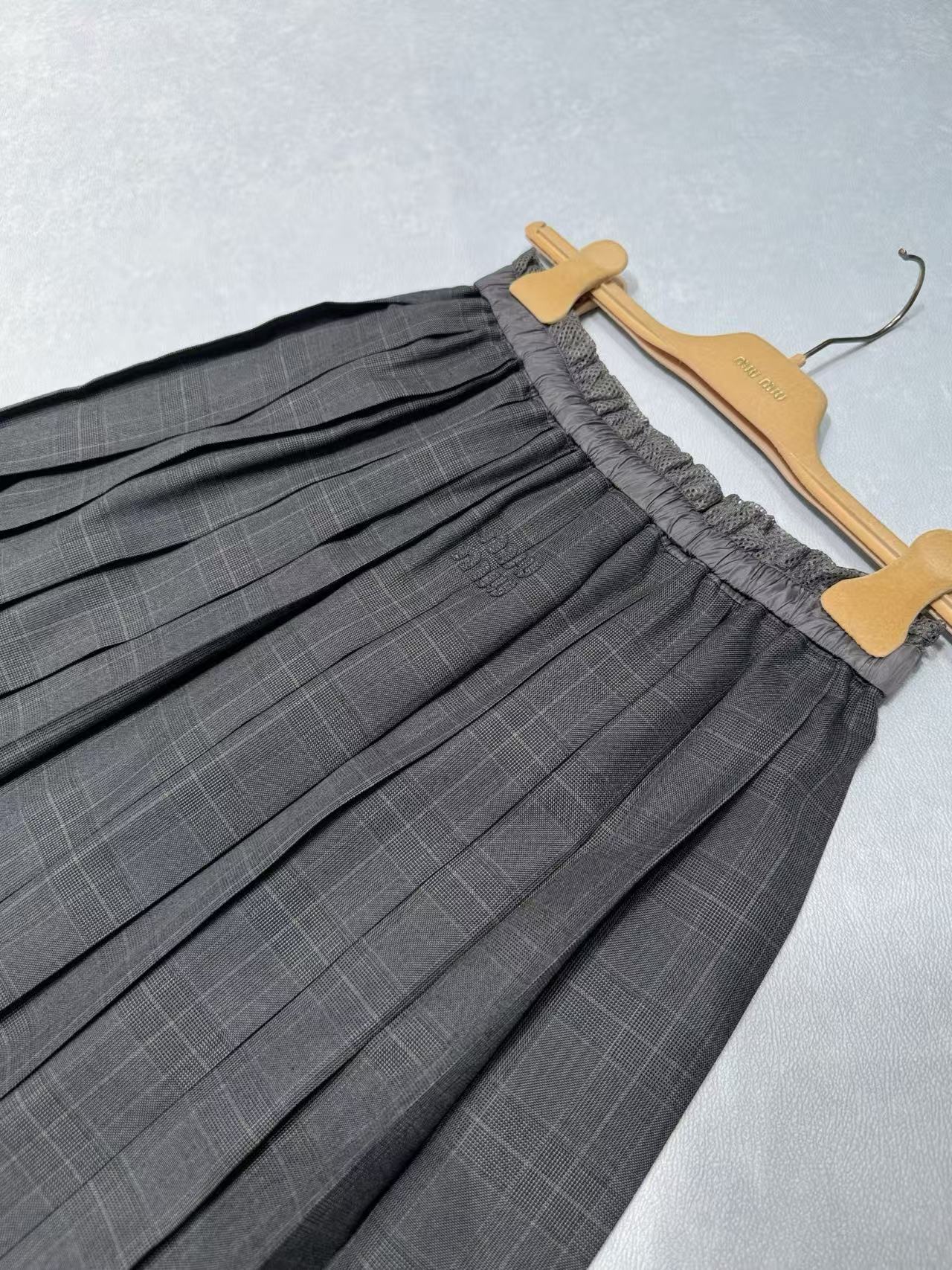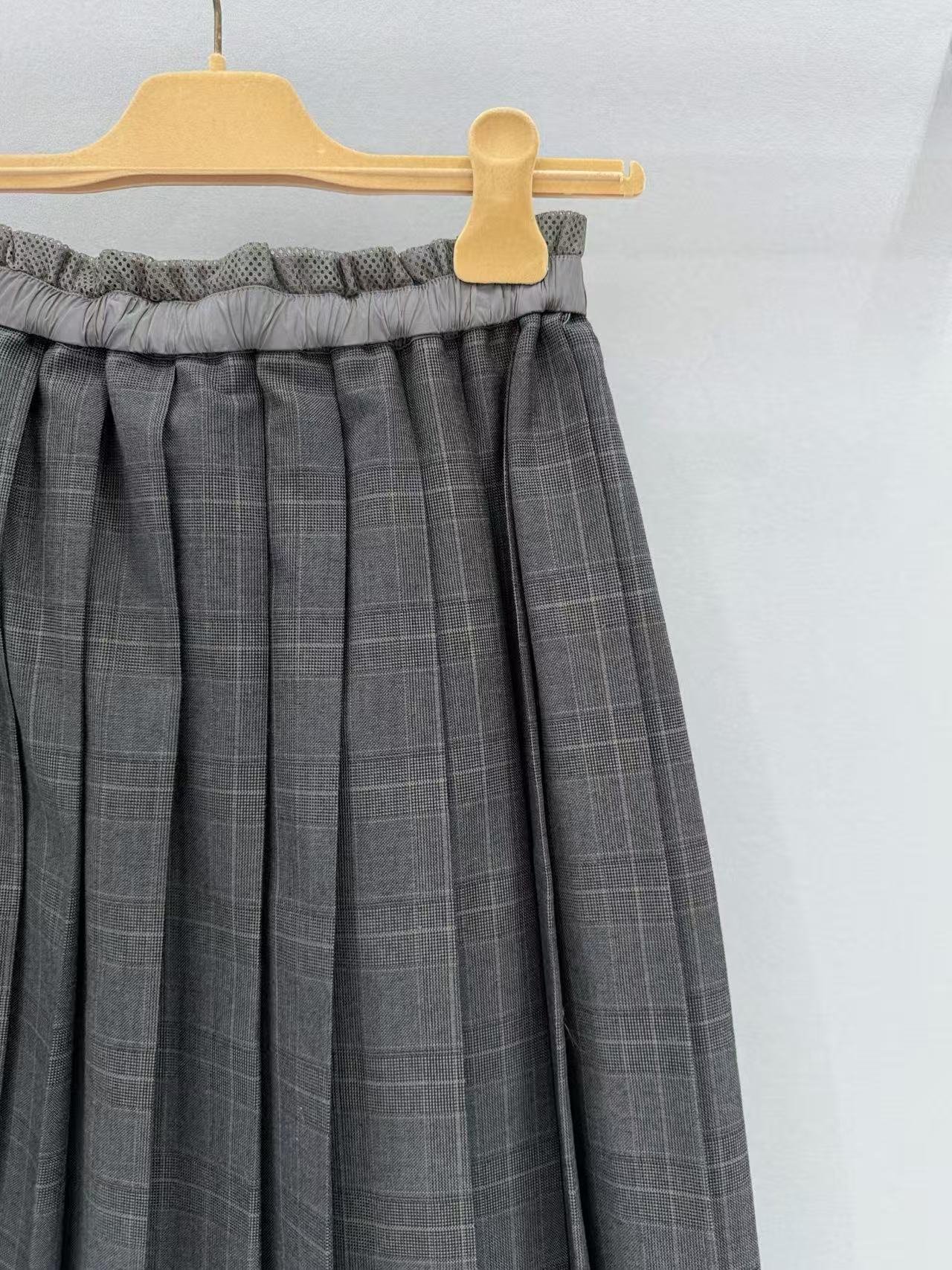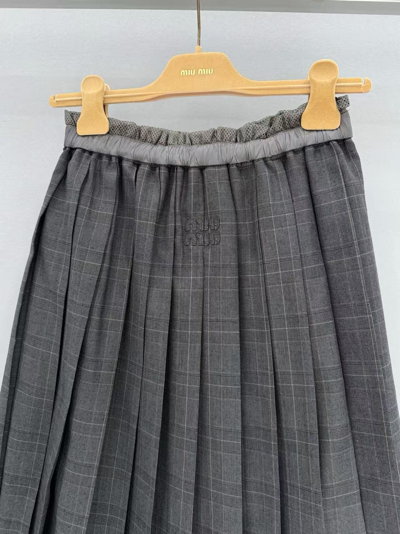 2025春夏 MIU家 拼接格紋中長款百褶半身裙