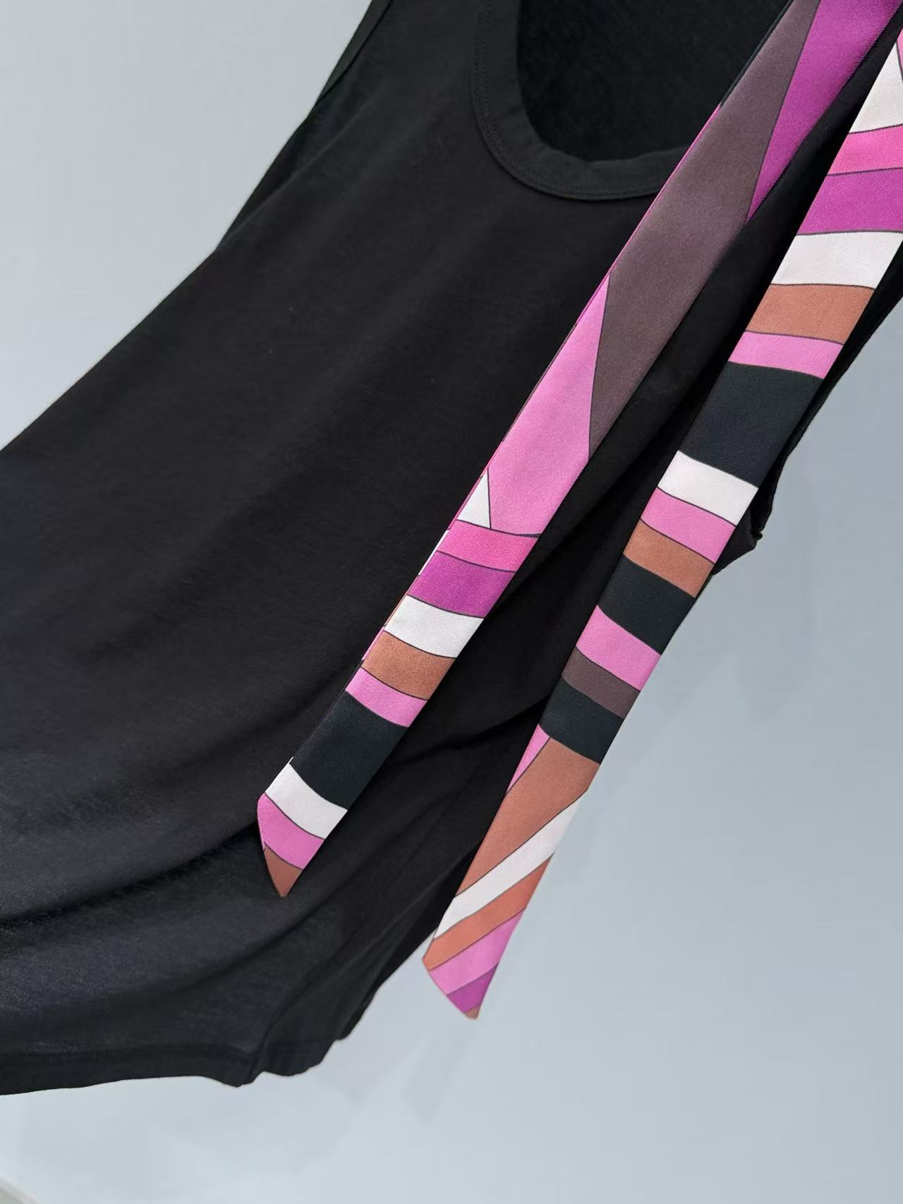 特性: 棉質部分親膚吸汗,真絲飄帶則帶有高級的絲滑光澤,異材質拼接讓層次感更豐富
