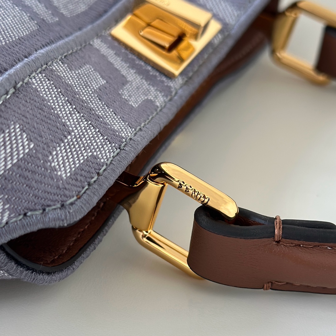 主體以牛仔提花製作,紋理清晰、耐看又有設計感。搭配品牌標誌性 FF 元素與流蘇裝飾,既經典又不失玩味。金屬扣件則採用全鋼材質,光澤細緻,提升了包款的高級氛圍與耐用度。