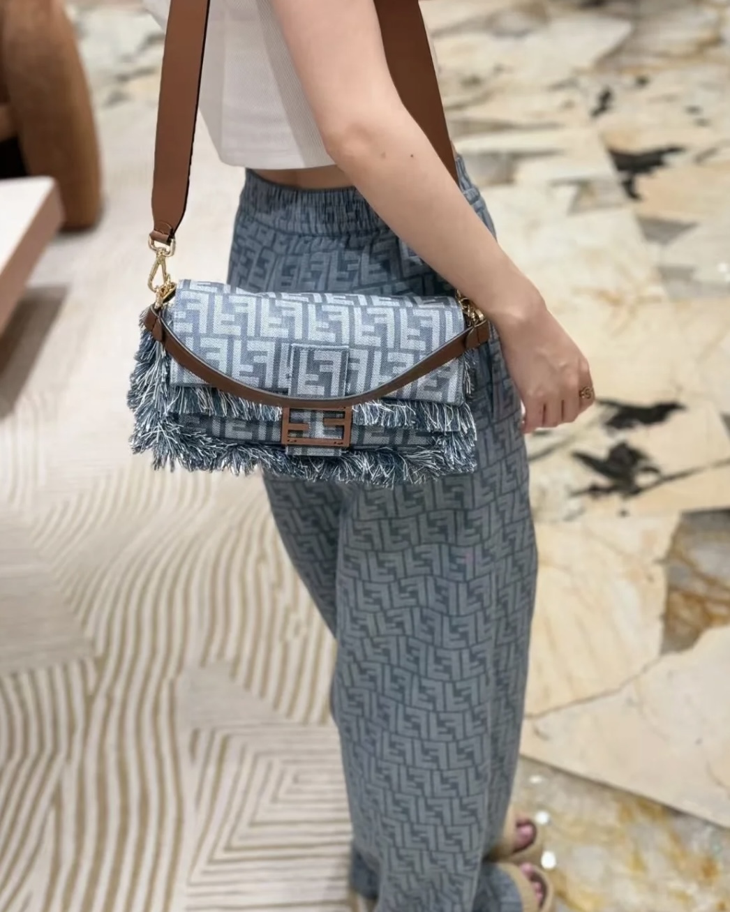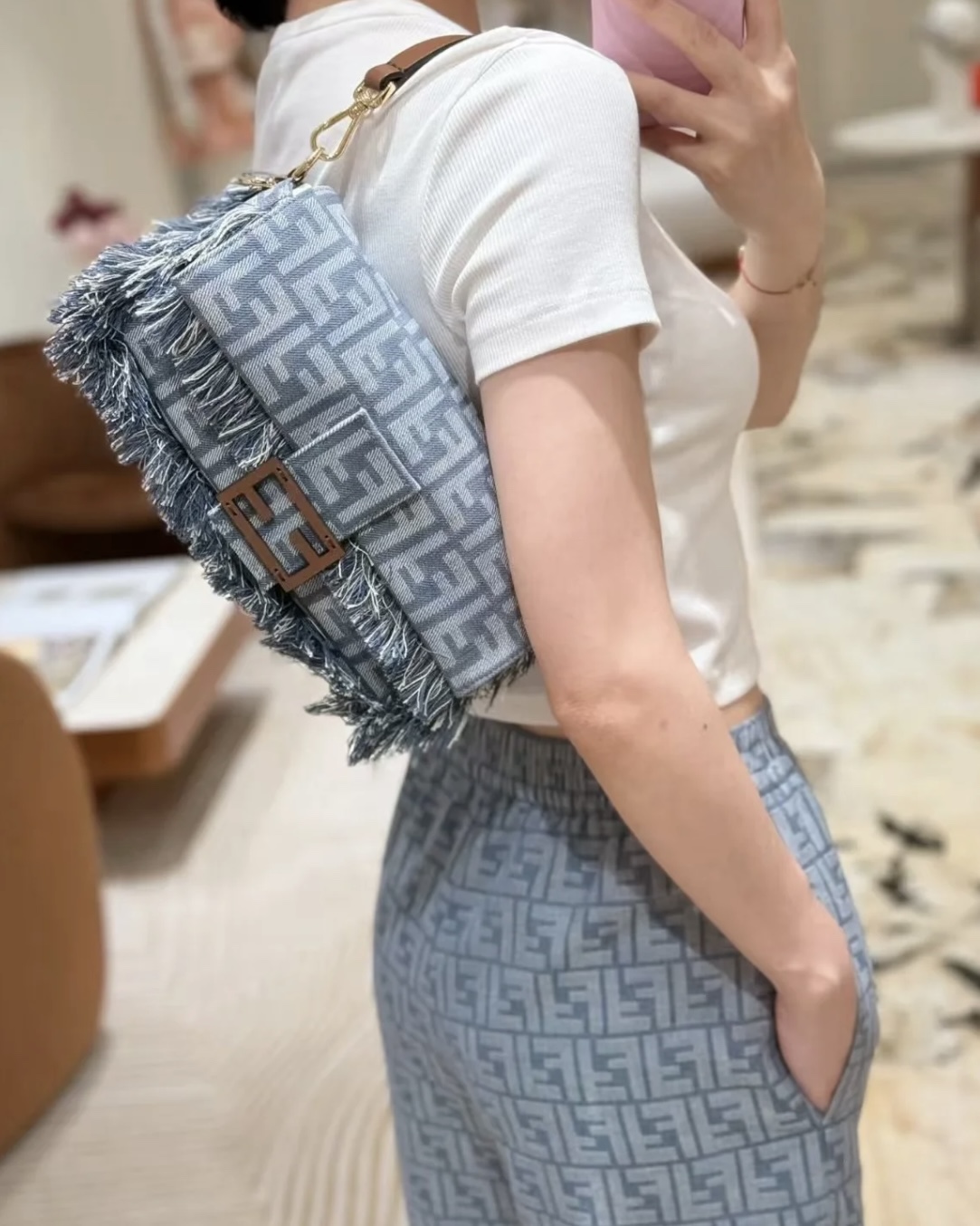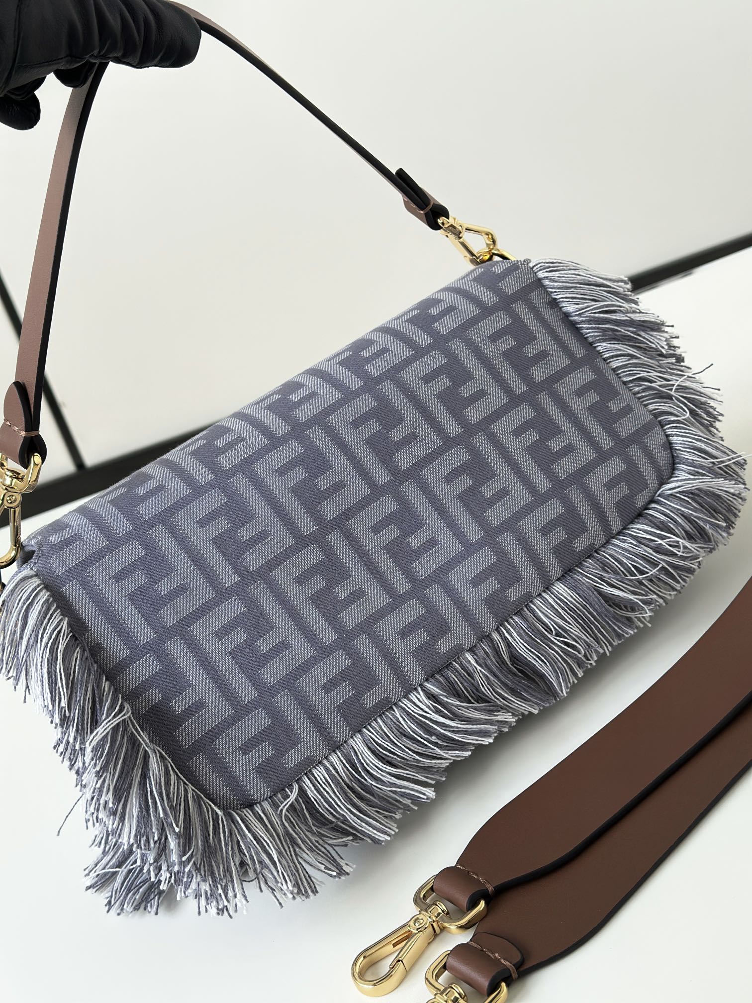 採用高質感牛仔提花材質,紋理清晰、層次感豐富,觸感挺實且耐用。搭配經典 FF monogram 元素,結合流蘇裝飾,展現品牌獨有的精緻與玩心。