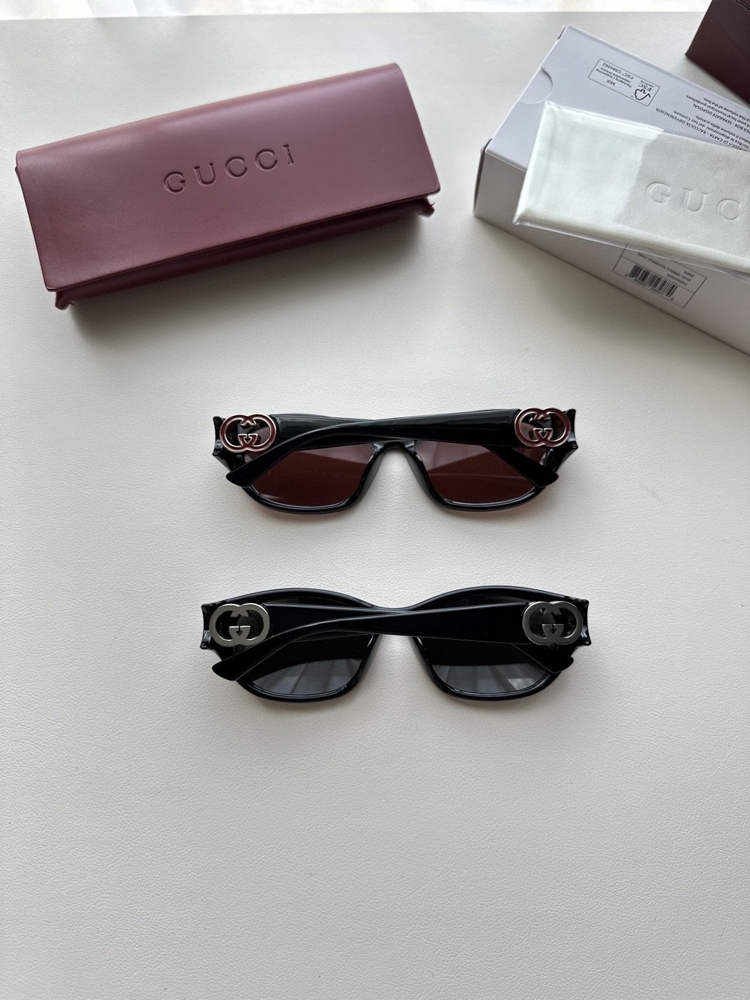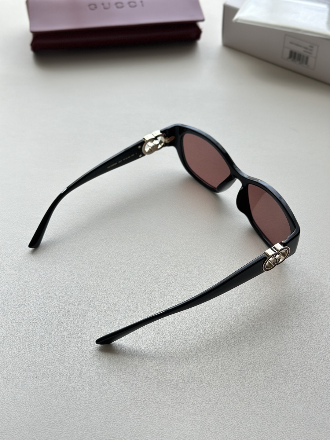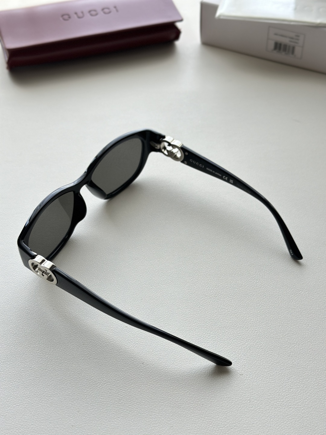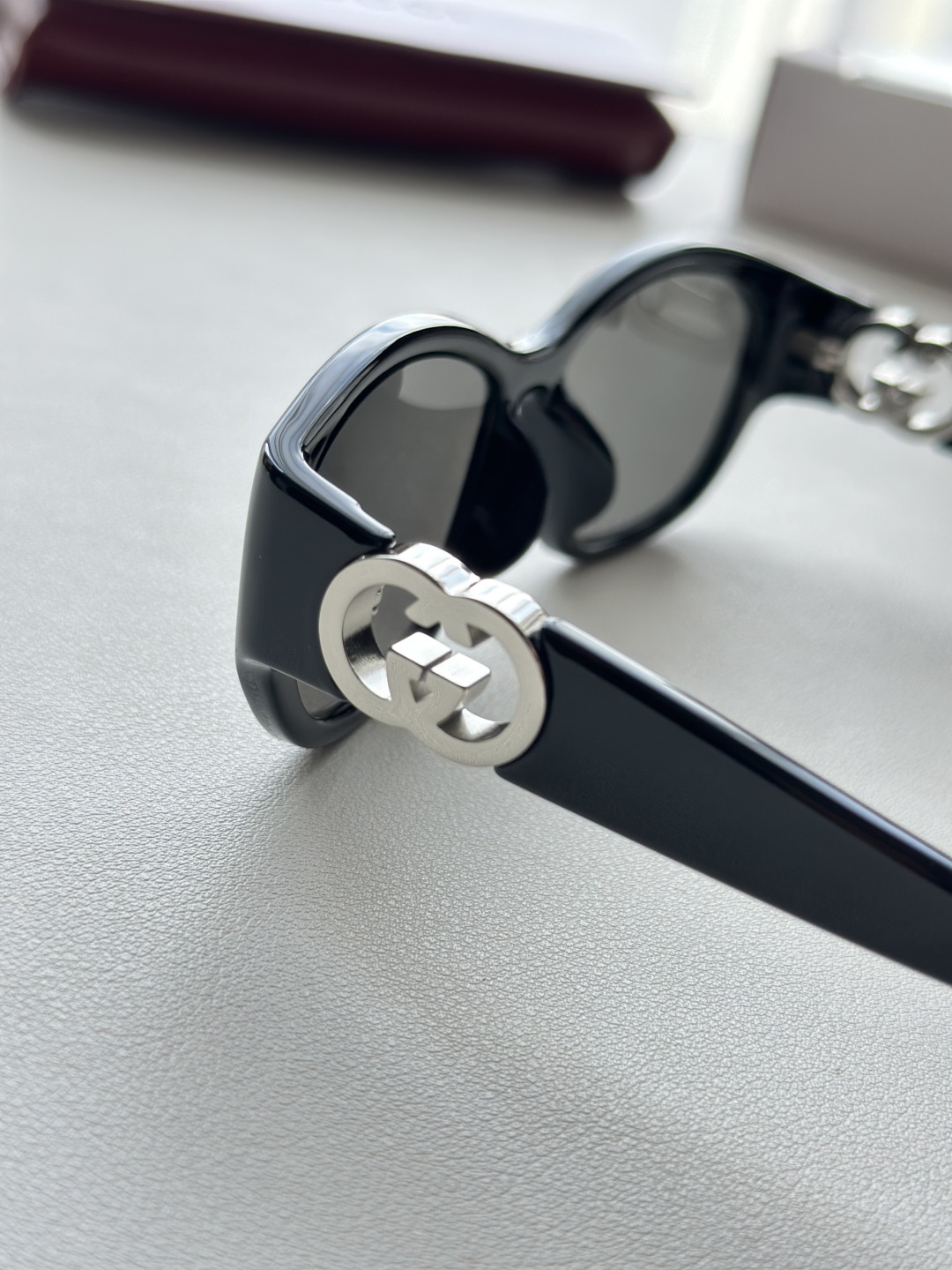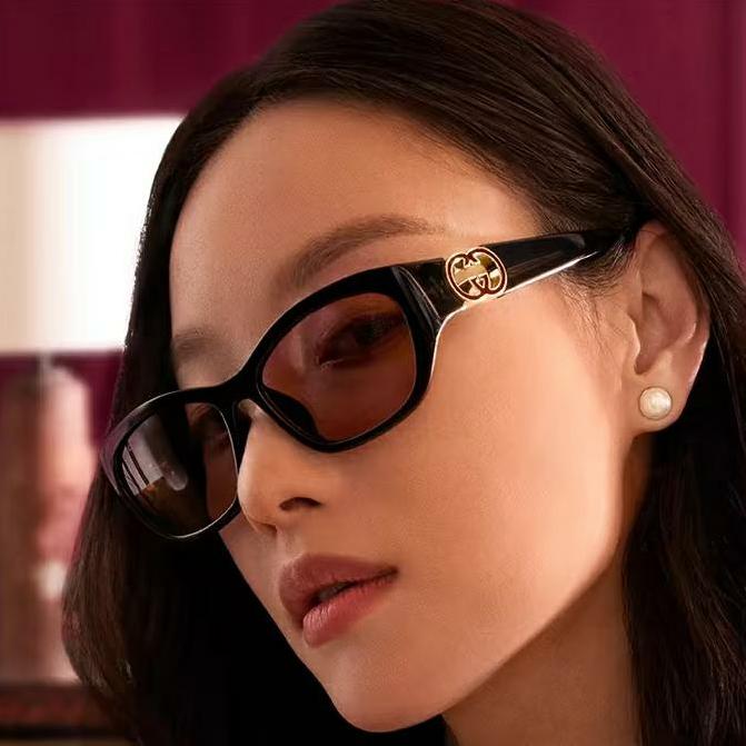 整體鏡框以柔和的貓眼造型呈現,展現出女性輪廓的線條之美,復古中又帶有現代洗鍊感。鏡腿部分採用標誌性雙G互鎖標識,搭配鏤空設計與手工鑲嵌的珐瑯細節,細緻奢華不浮誇,從側面看也能感受到工藝的堅持與高雅質感。