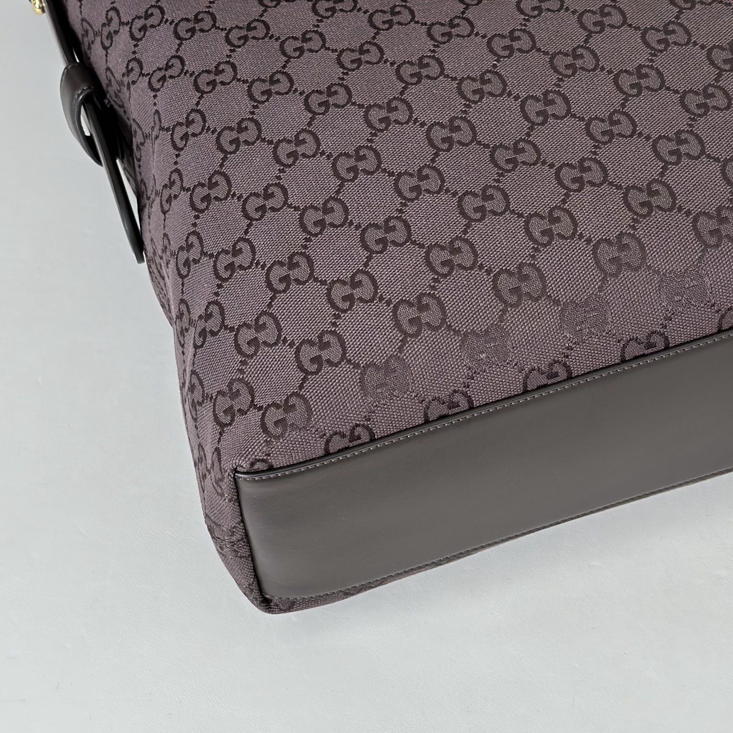 主體採用經典GG花紋帆布,質地堅韌耐磨,搭配細緻牛皮邊飾,整體更添高級層次。金色調五金件則為整體注入一抹溫潤亮點,讓整體設計更顯精緻與立體感。
