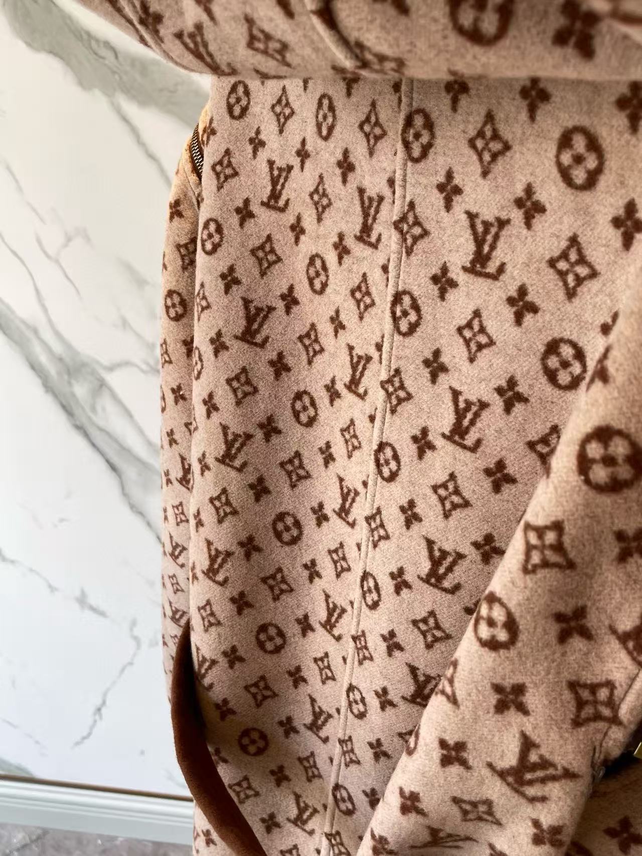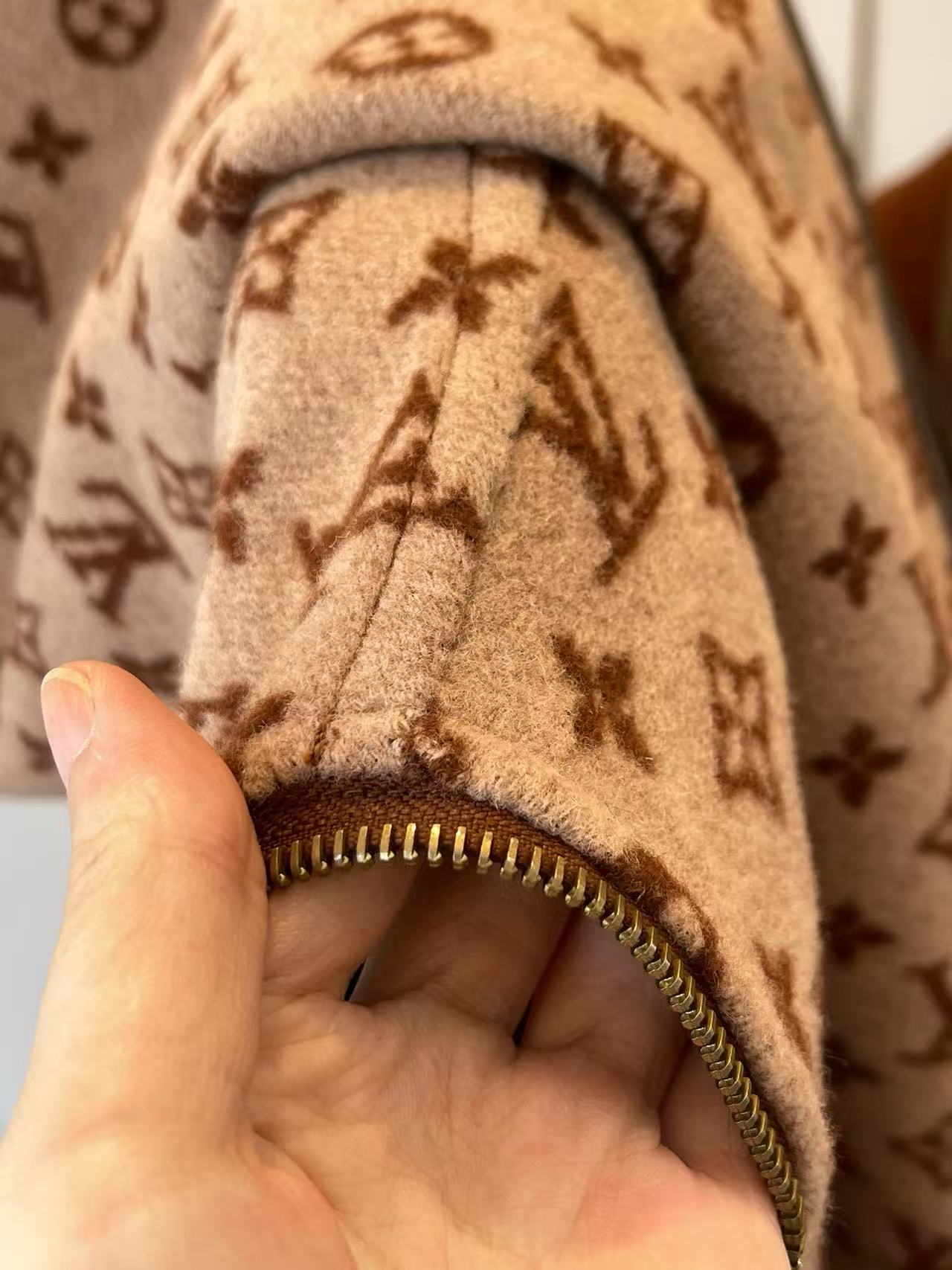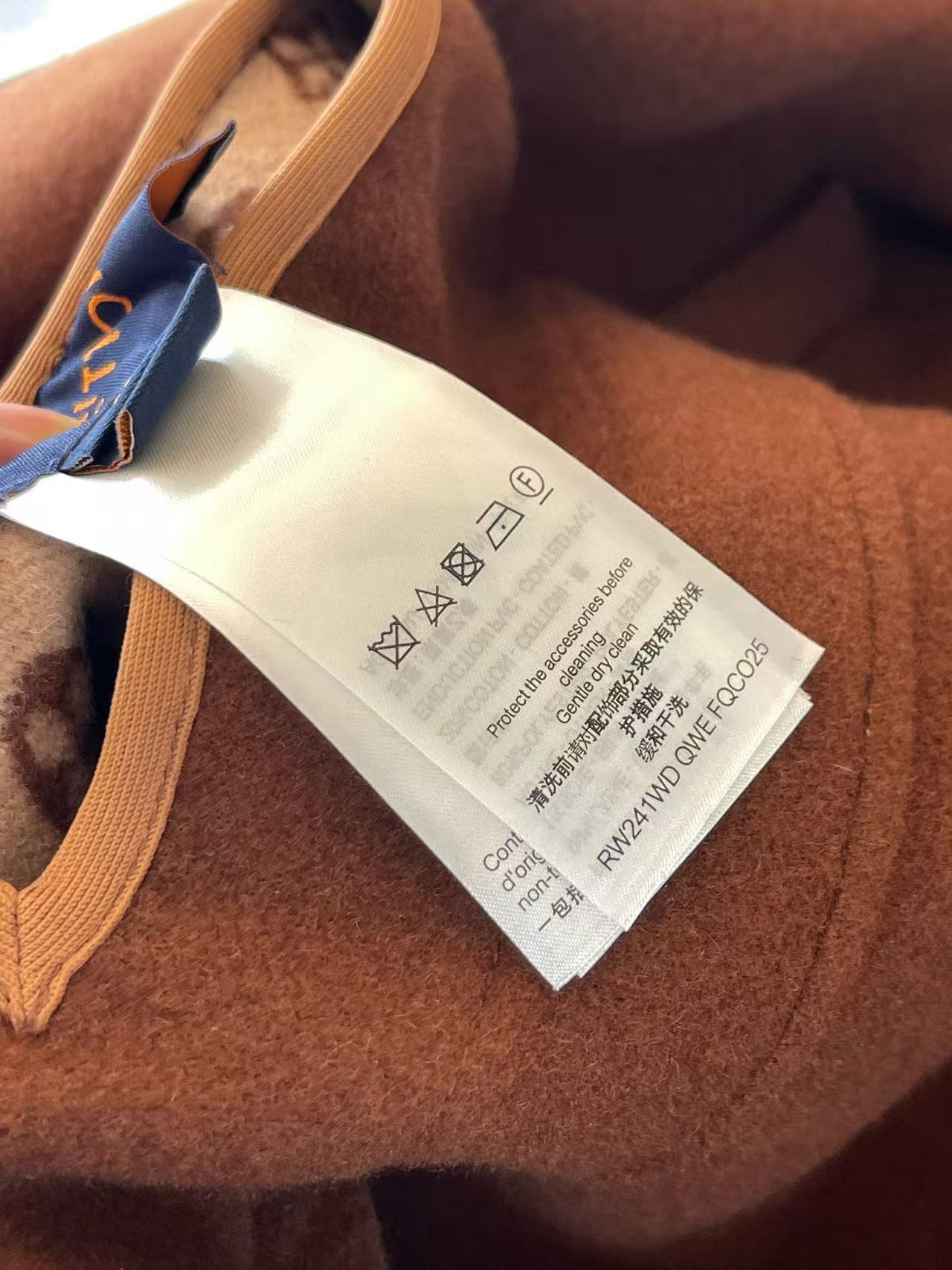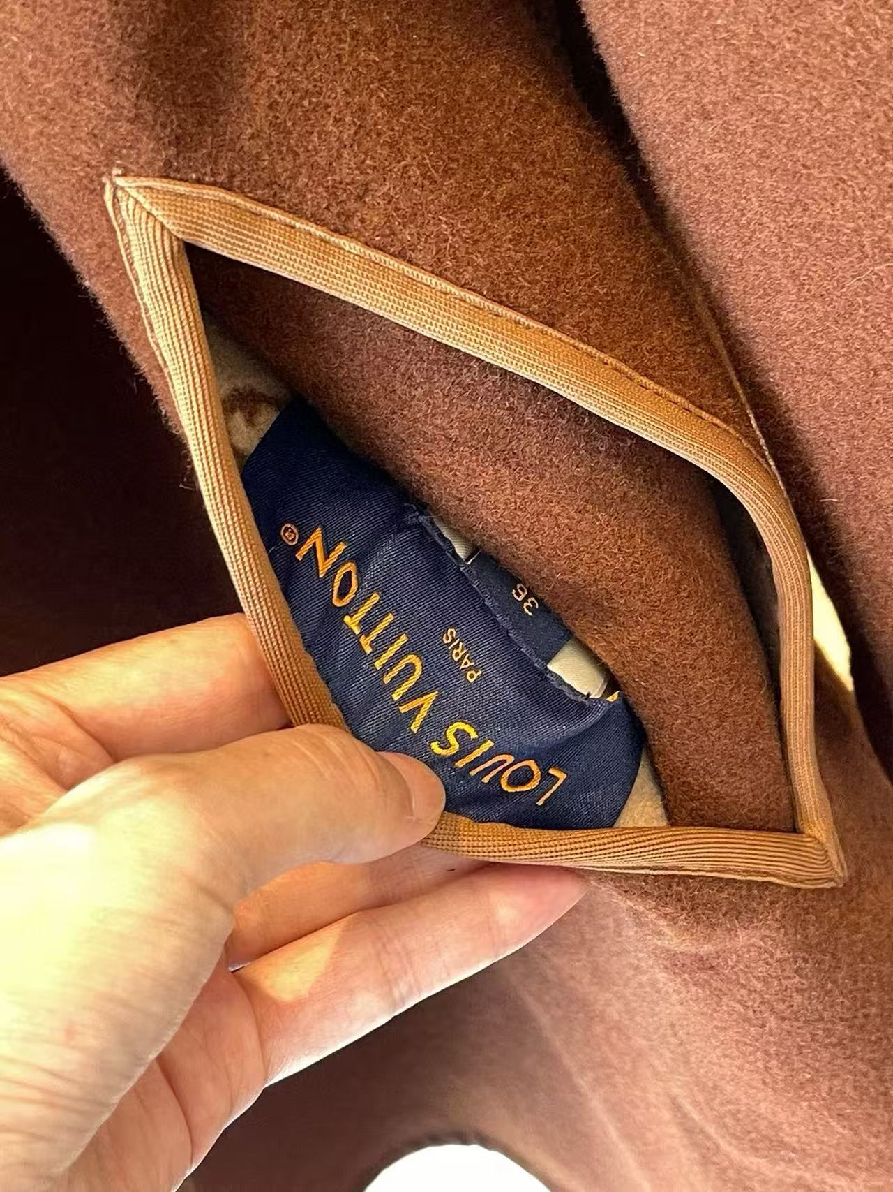 這款大衣的材質真的非常講究,使用了雙面 Monogram 絲毛混紡,主材料是 99%的綿羊毛和1%的桑蠶絲。摸起來柔軟、滑順又保暖,完全是那種頂級精品的奢華觸感。內裡的老花小 Logo 提花更是清晰又精緻,完全不是市面上那種模糊不清的普通貨色,每一個細節都完美對標專櫃!