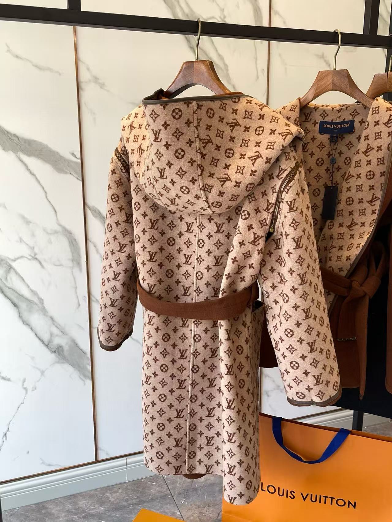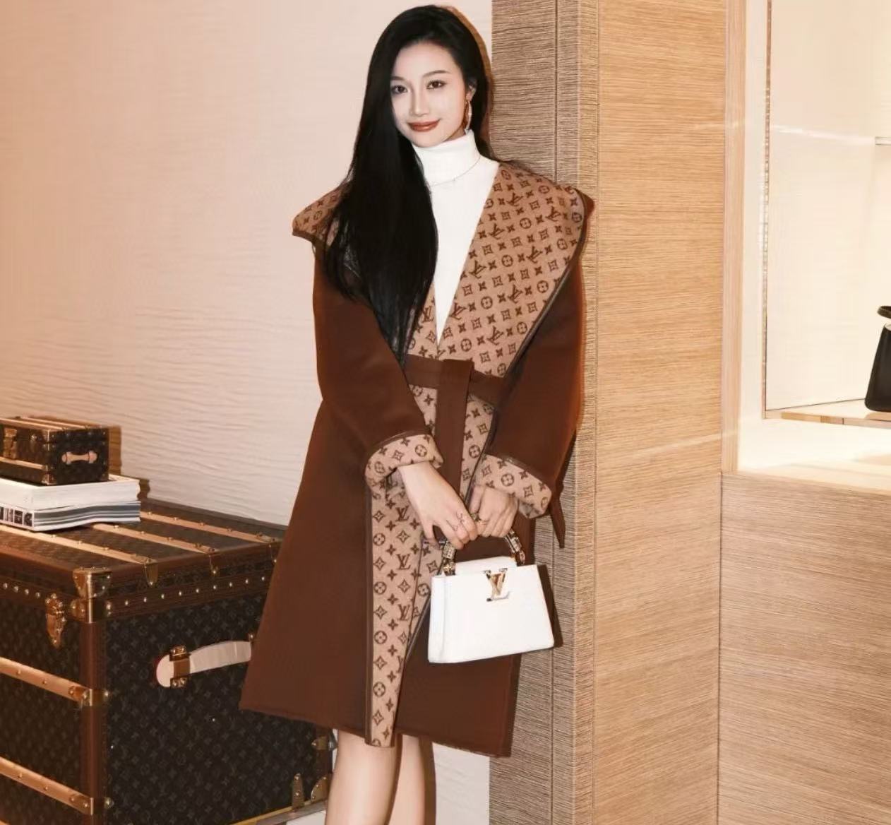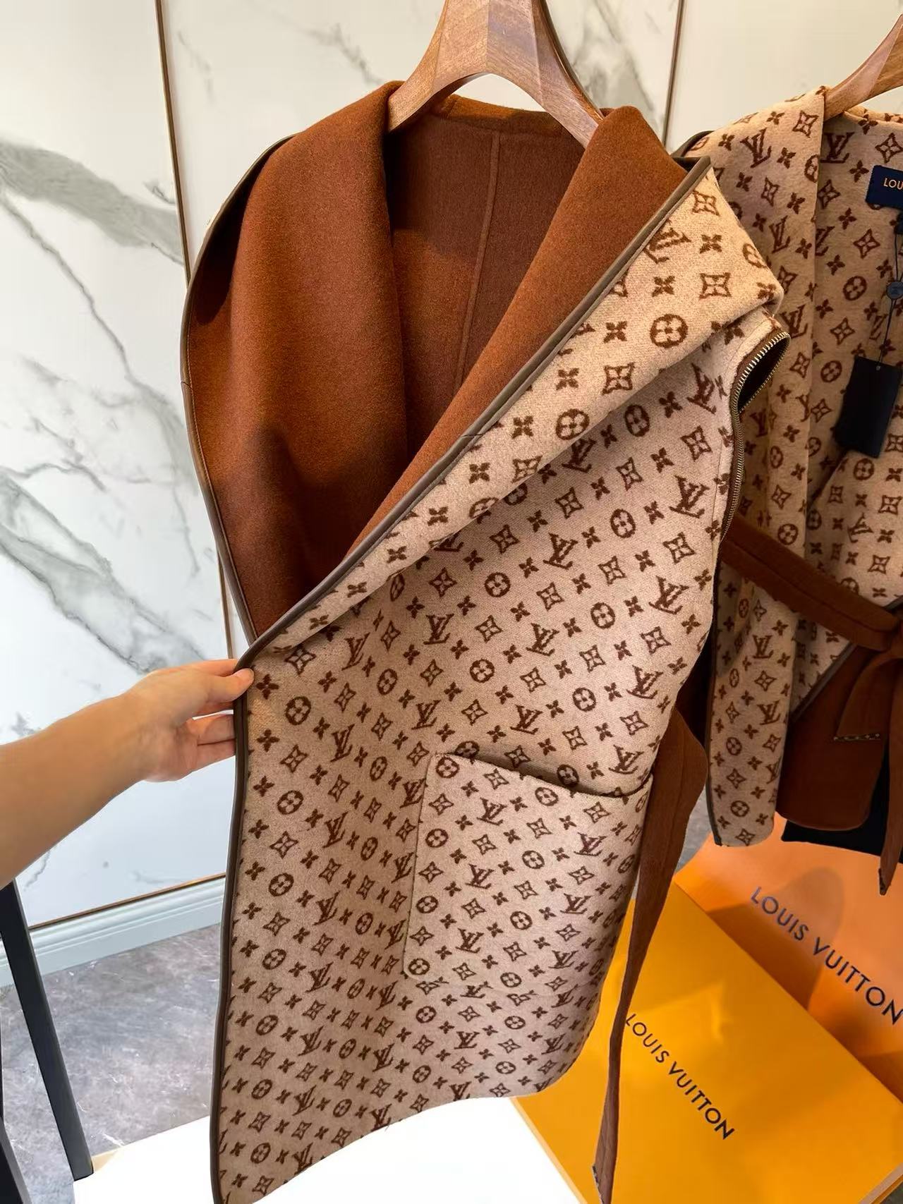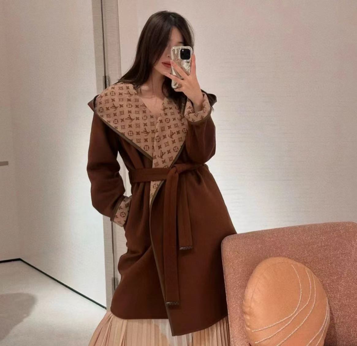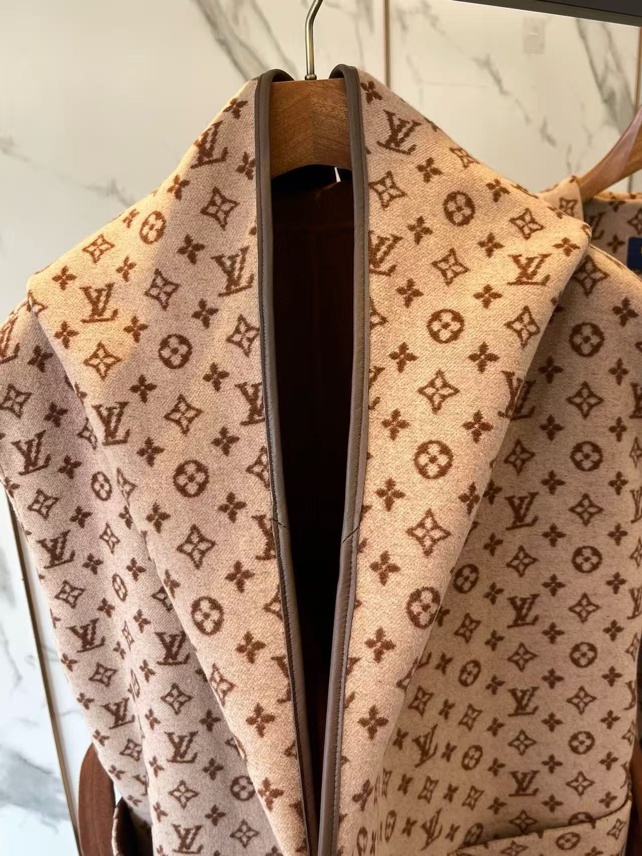 這款大衣的材質真的非常講究,使用了雙面 Monogram 絲毛混紡,主材料是 99%的綿羊毛和1%的桑蠶絲。摸起來柔軟、滑順又保暖,完全是那種頂級精品的奢華觸感。內裡的老花小 Logo 提花更是清晰又精緻,完全不是市面上那種模糊不清的普通貨色,每一個細節都完美對標專櫃!