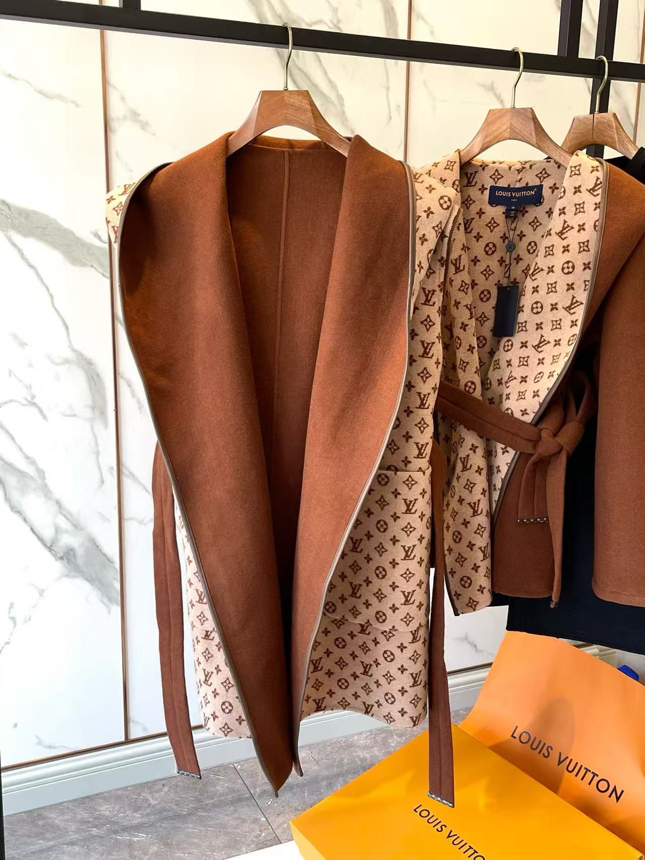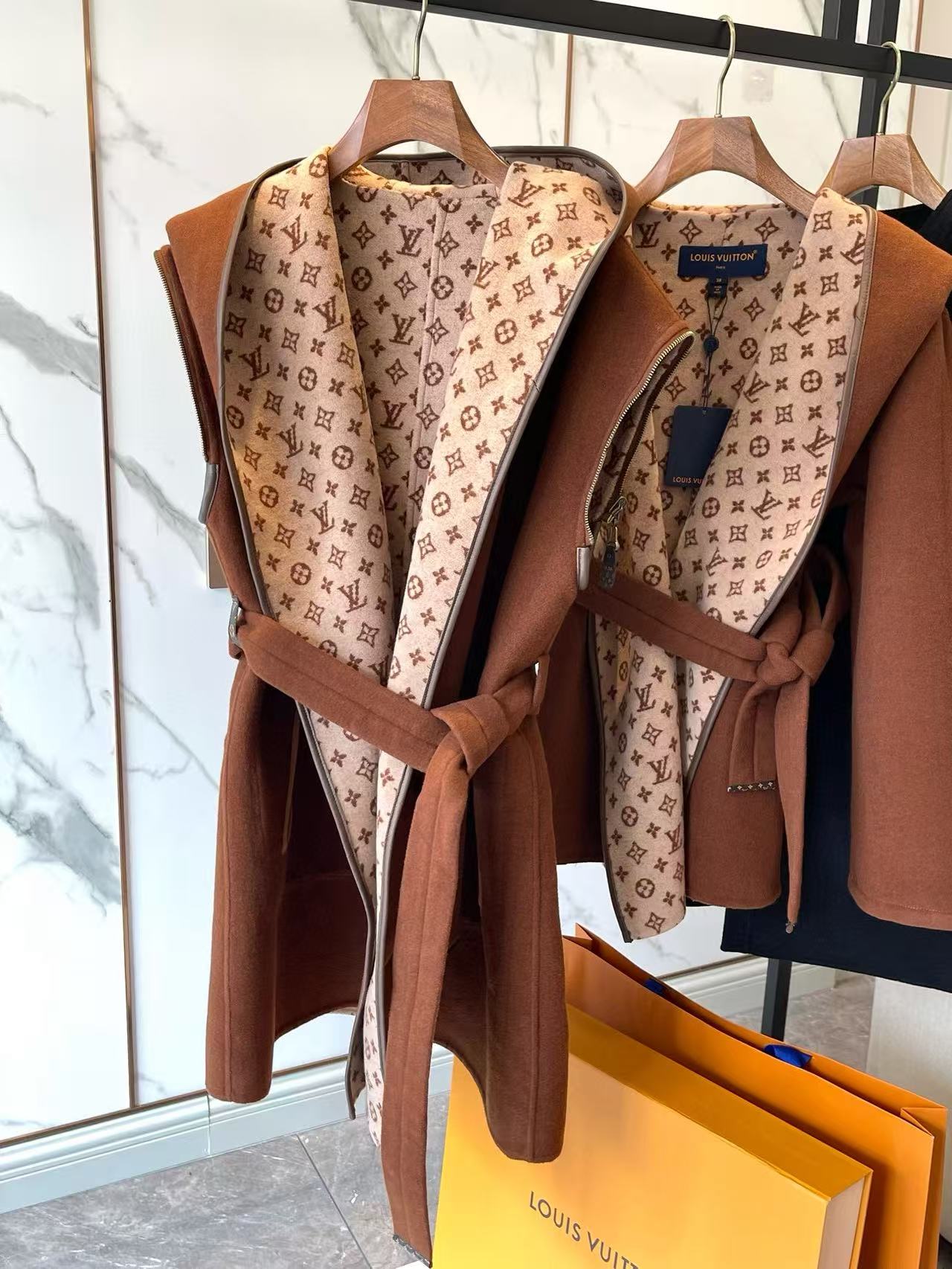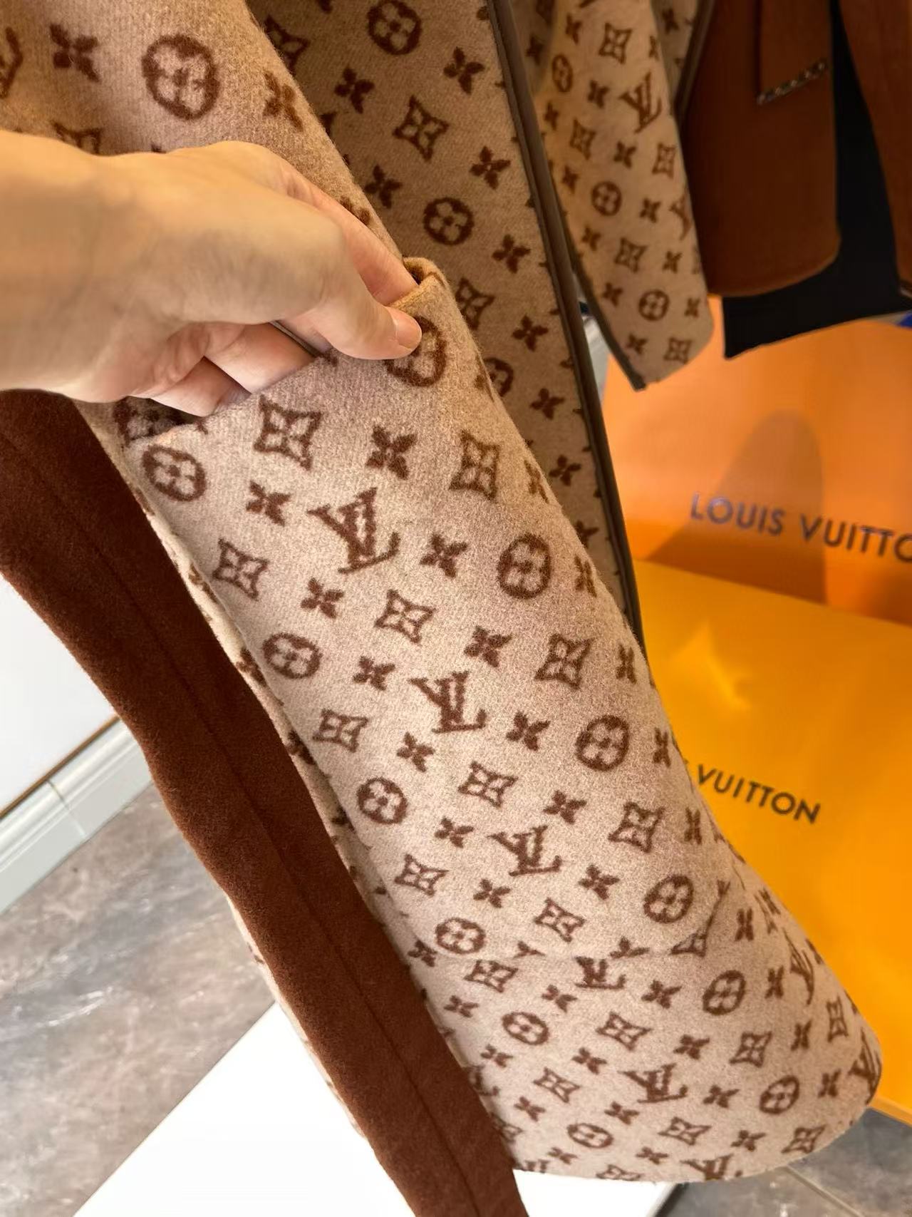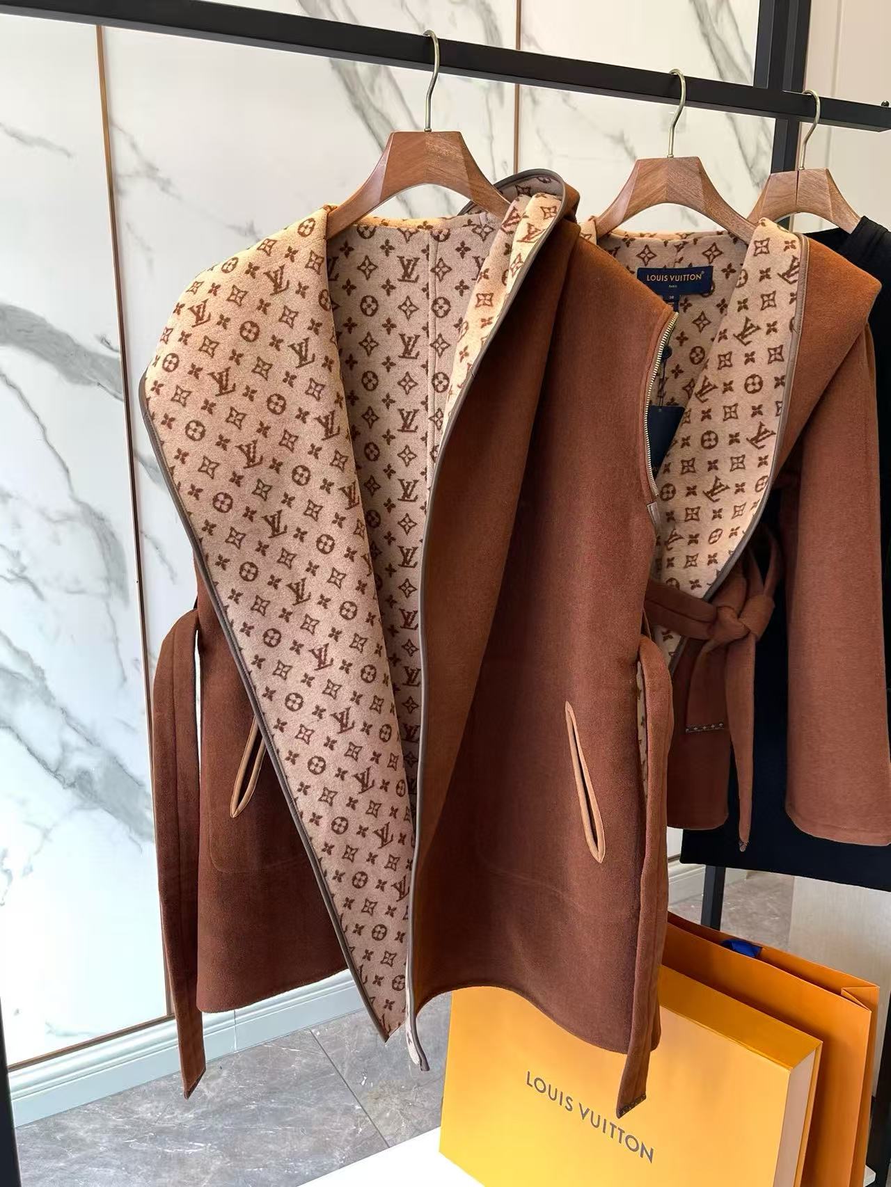 這款大衣的材質真的非常講究,使用了雙面 Monogram 絲毛混紡,主材料是 99%的綿羊毛和1%的桑蠶絲。摸起來柔軟、滑順又保暖,完全是那種頂級精品的奢華觸感。內裡的老花小 Logo 提花更是清晰又精緻,完全不是市面上那種模糊不清的普通貨色,每一個細節都完美對標專櫃!