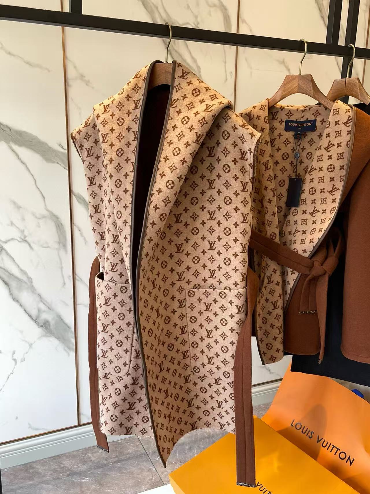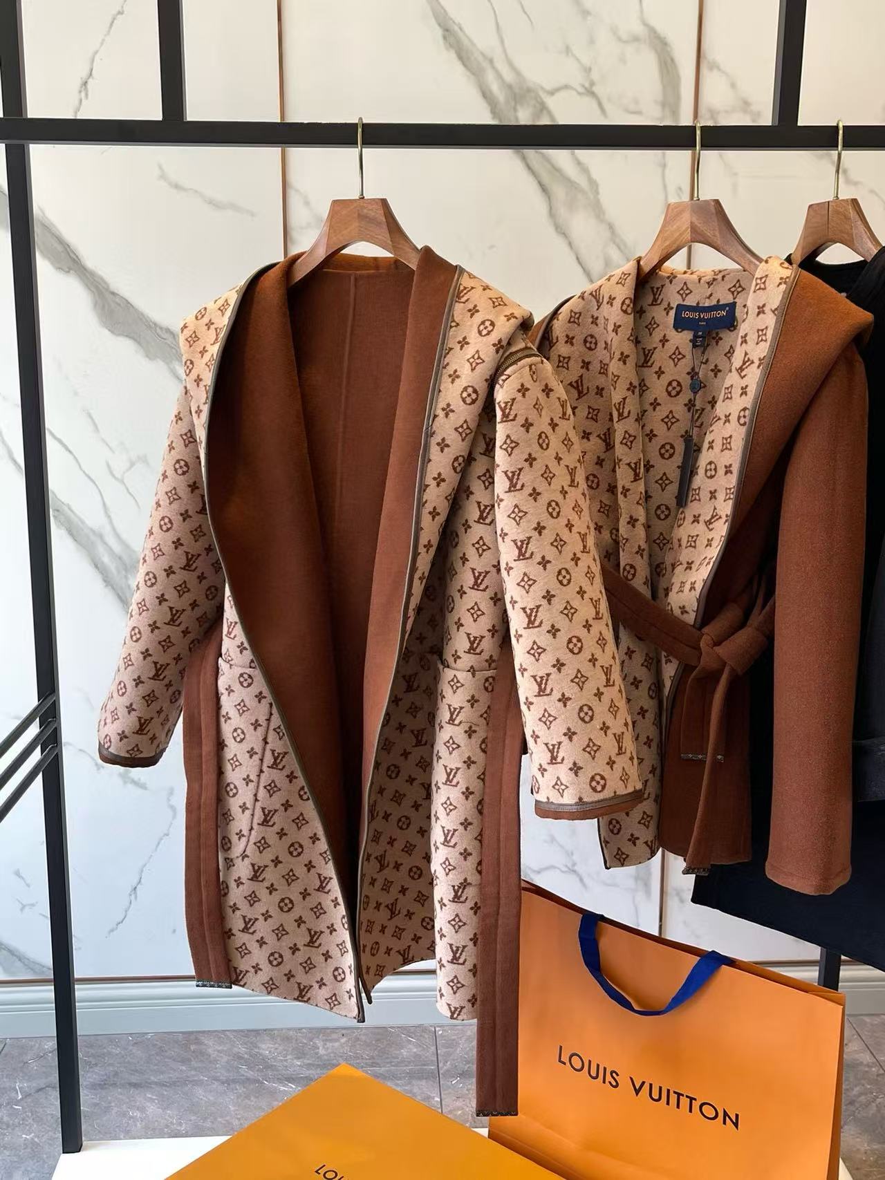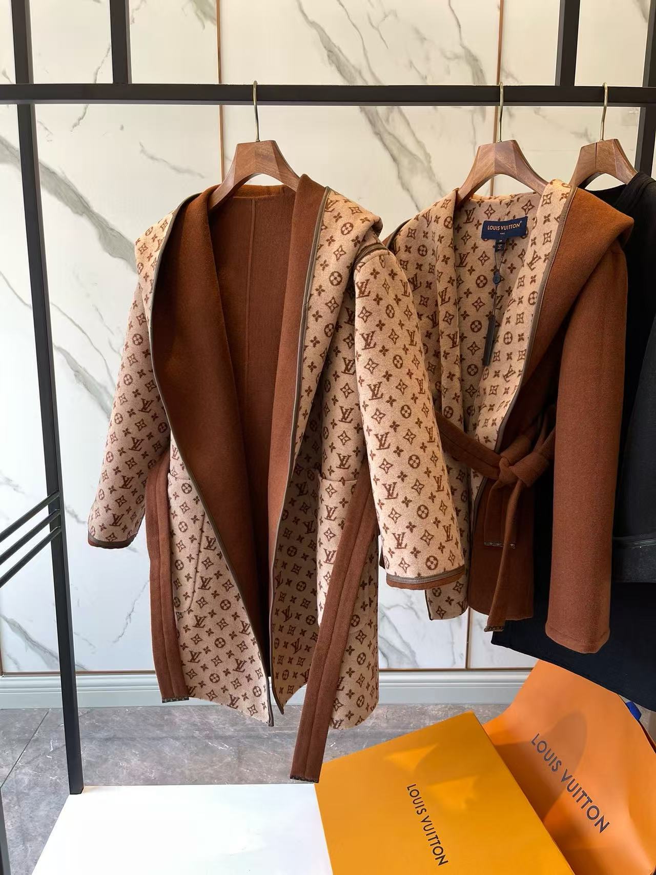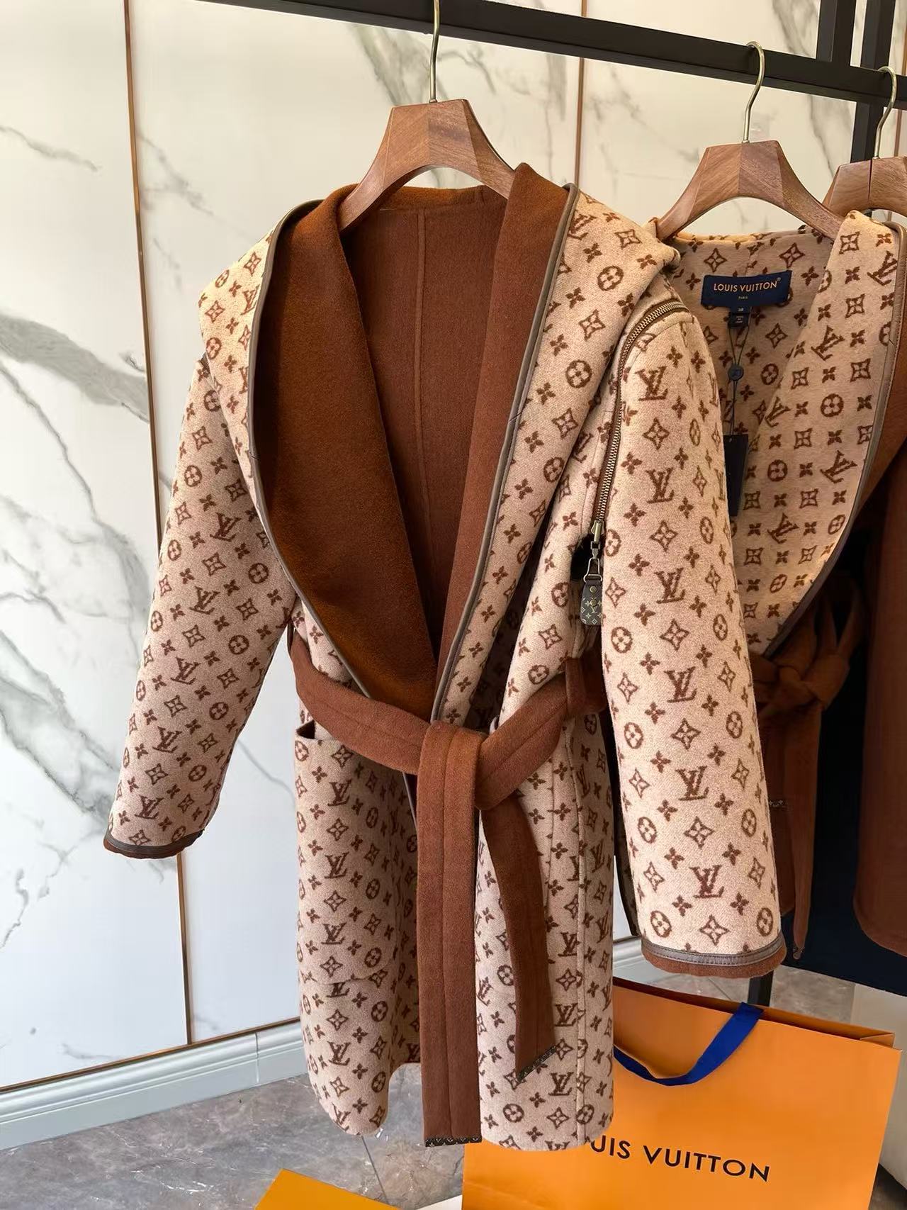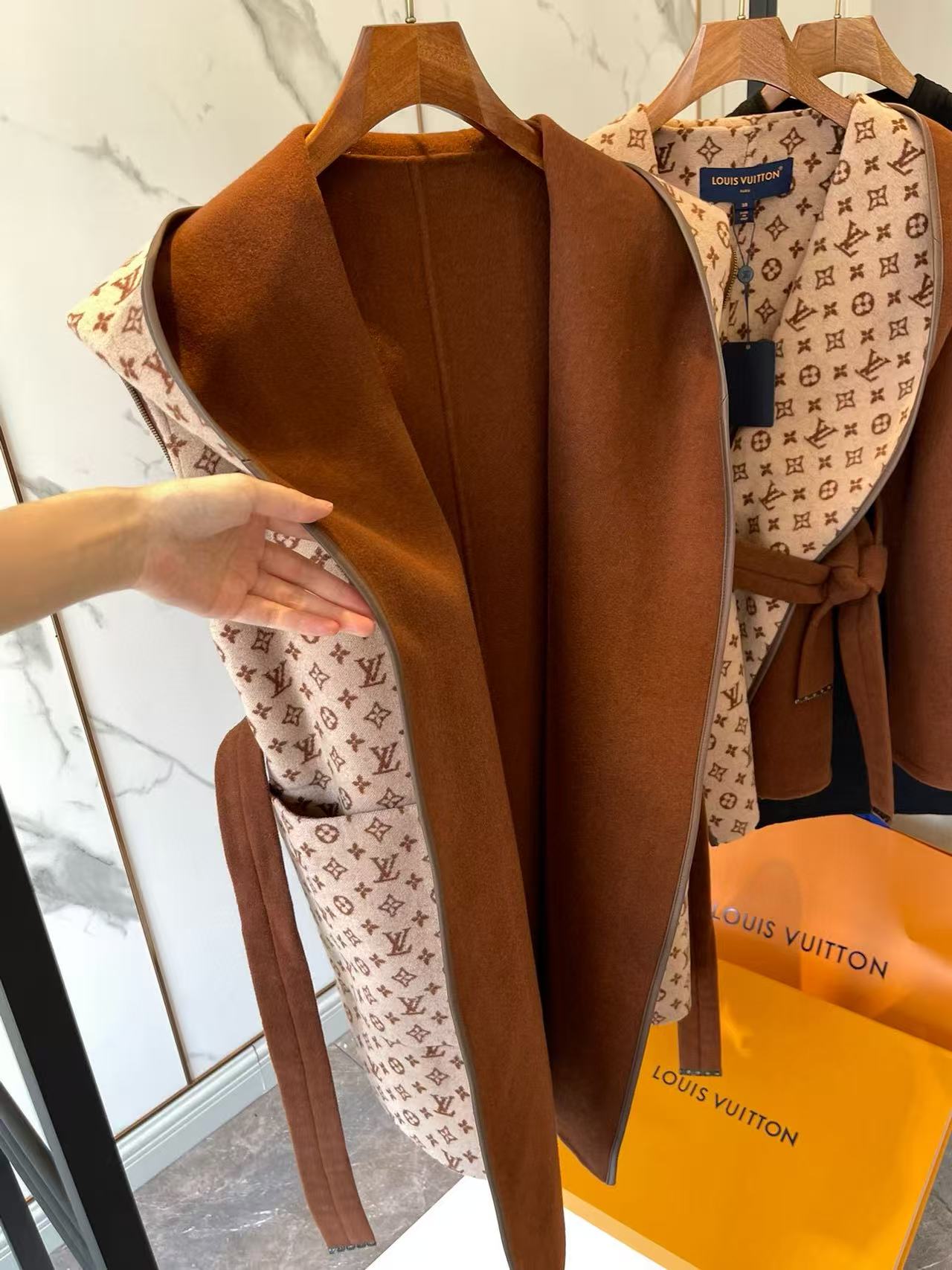 這款大衣的材質真的非常講究,使用了雙面 Monogram 絲毛混紡,主材料是 99%的綿羊毛和1%的桑蠶絲。摸起來柔軟、滑順又保暖,完全是那種頂級精品的奢華觸感。內裡的老花小 Logo 提花更是清晰又精緻,完全不是市面上那種模糊不清的普通貨色,每一個細節都完美對標專櫃!