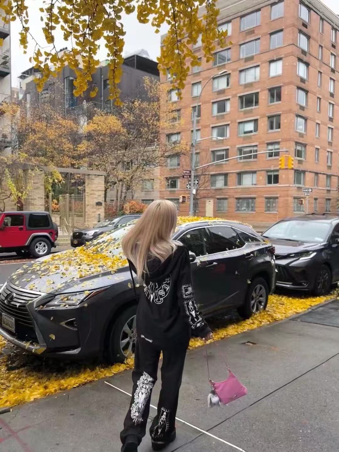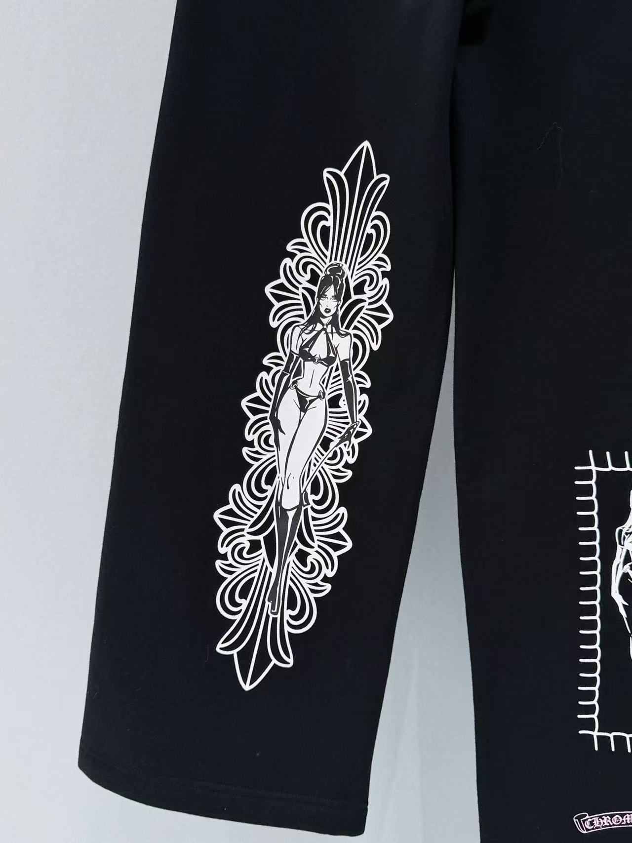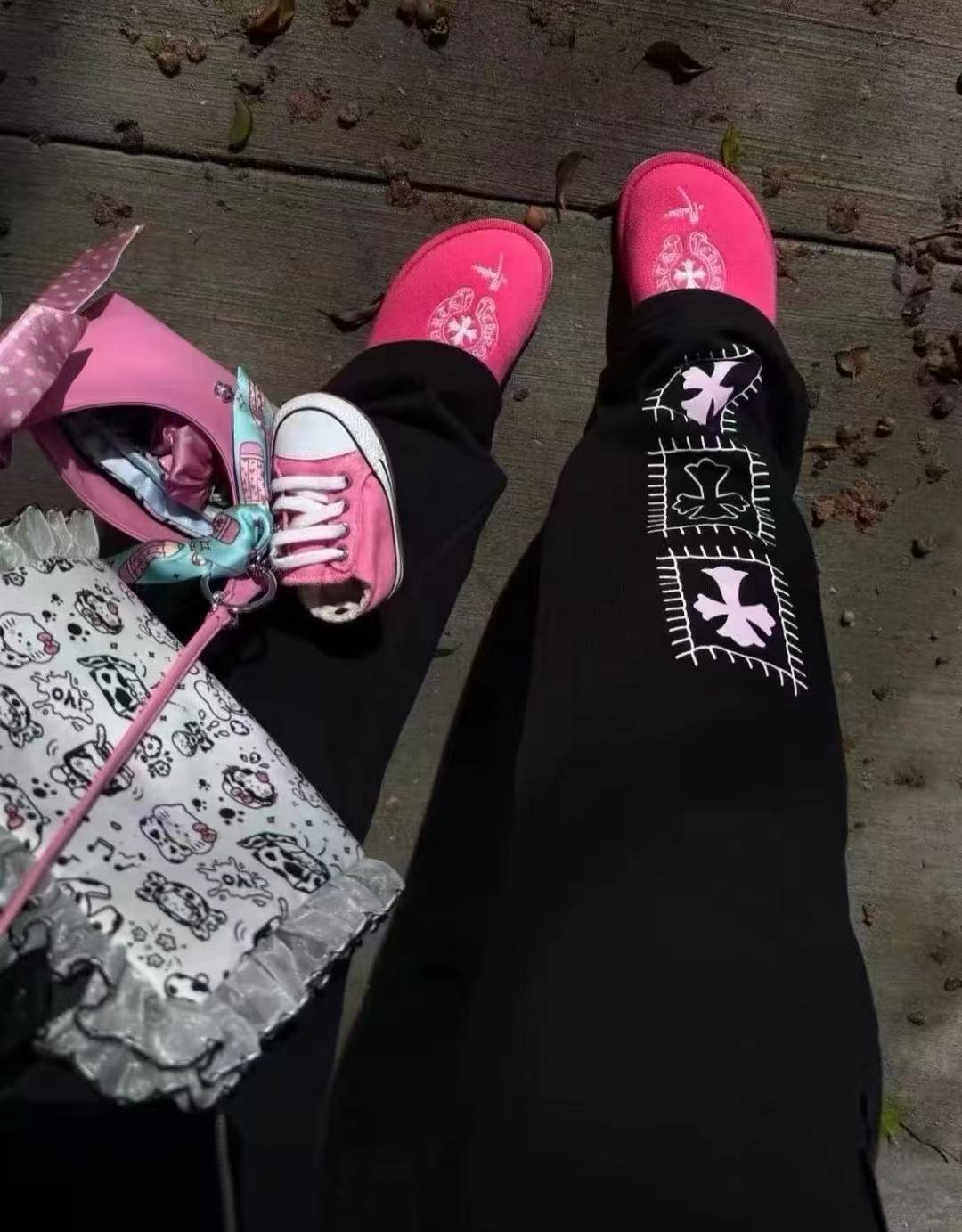 黑色運動版型隨性又俐落,整件褲子的靈魂就在於側邊與後方的十字架結合美少女圖案,黑色布料襯托出最吸睛的櫻花粉熱固油印花,這組對色真的非常精準,視覺衝擊力十足。
