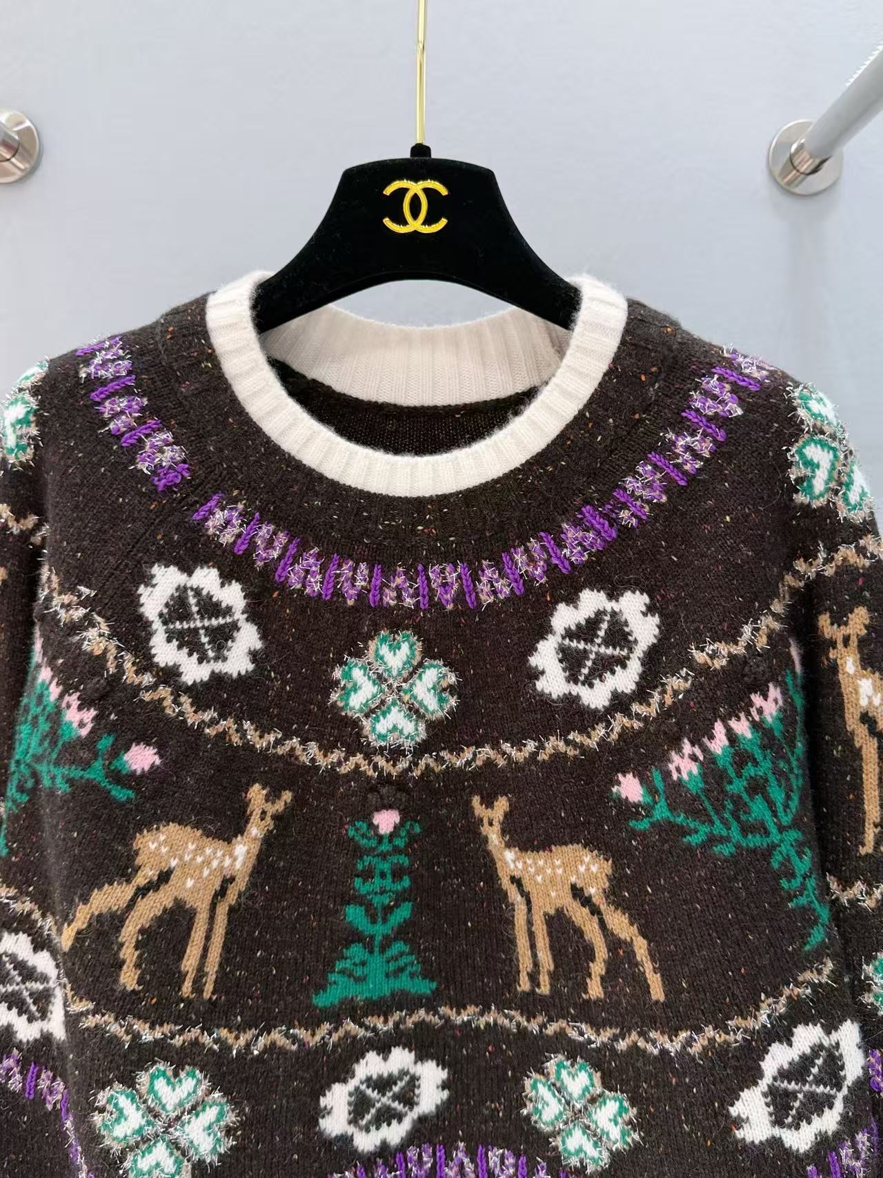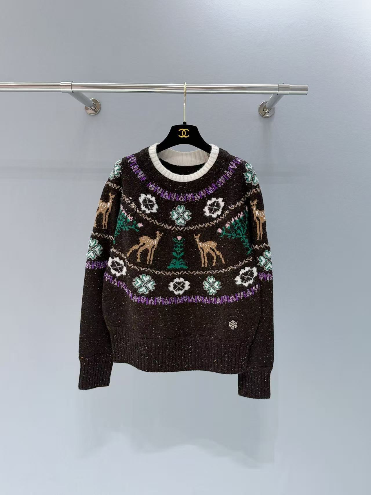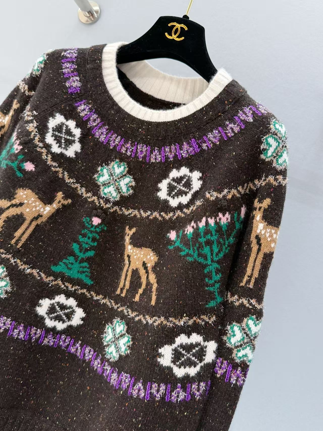 重點是環繞頸部向下延伸到胸前的北歐風鉤花圖案,穿插可愛小鹿、雙C字母徽標,與下擺的水鑽雙C別針互相輝映,滿滿品牌調性,穿上身瞬間變成人群焦點!
