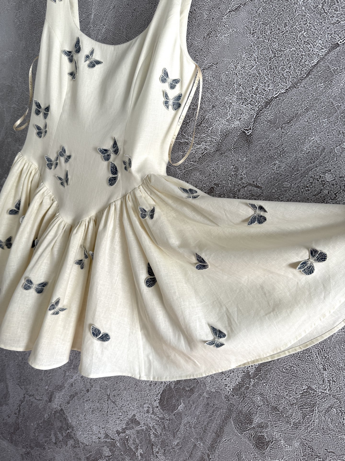 刺繡工藝:裙身上的蝴蝶採用重工水溶繡花,搭配車縫活動立體蝴蝶設計,使圖案不再只是平面呈現,而是像真的停駐在裙身,生動感十足、呼之欲出。
