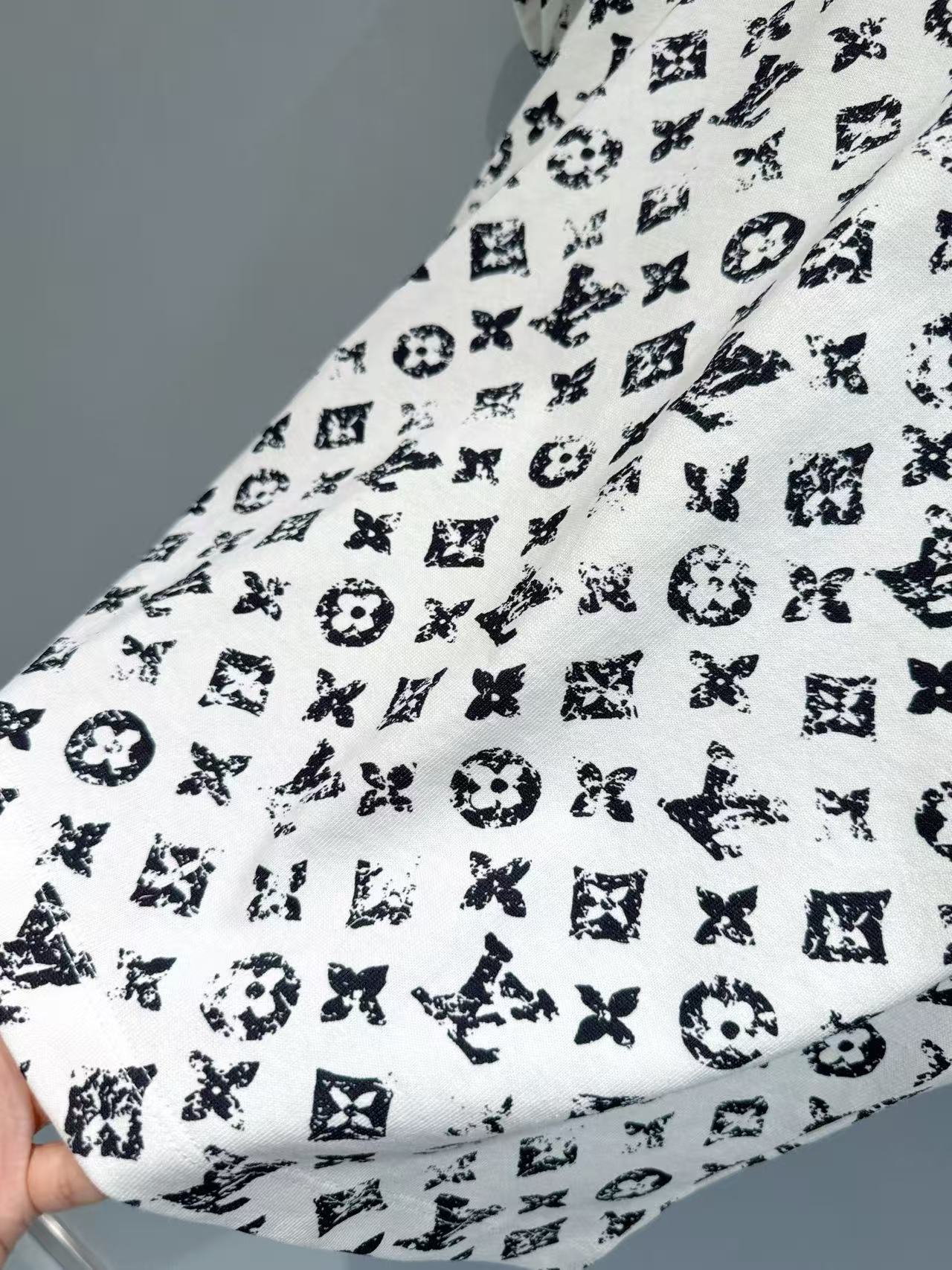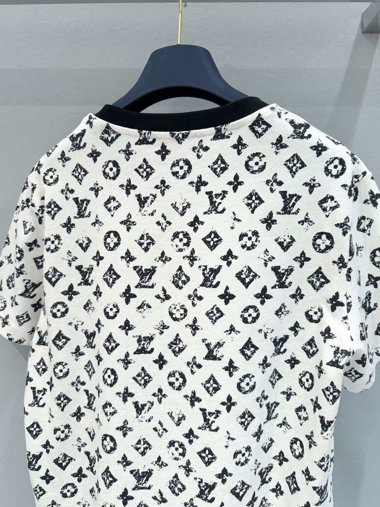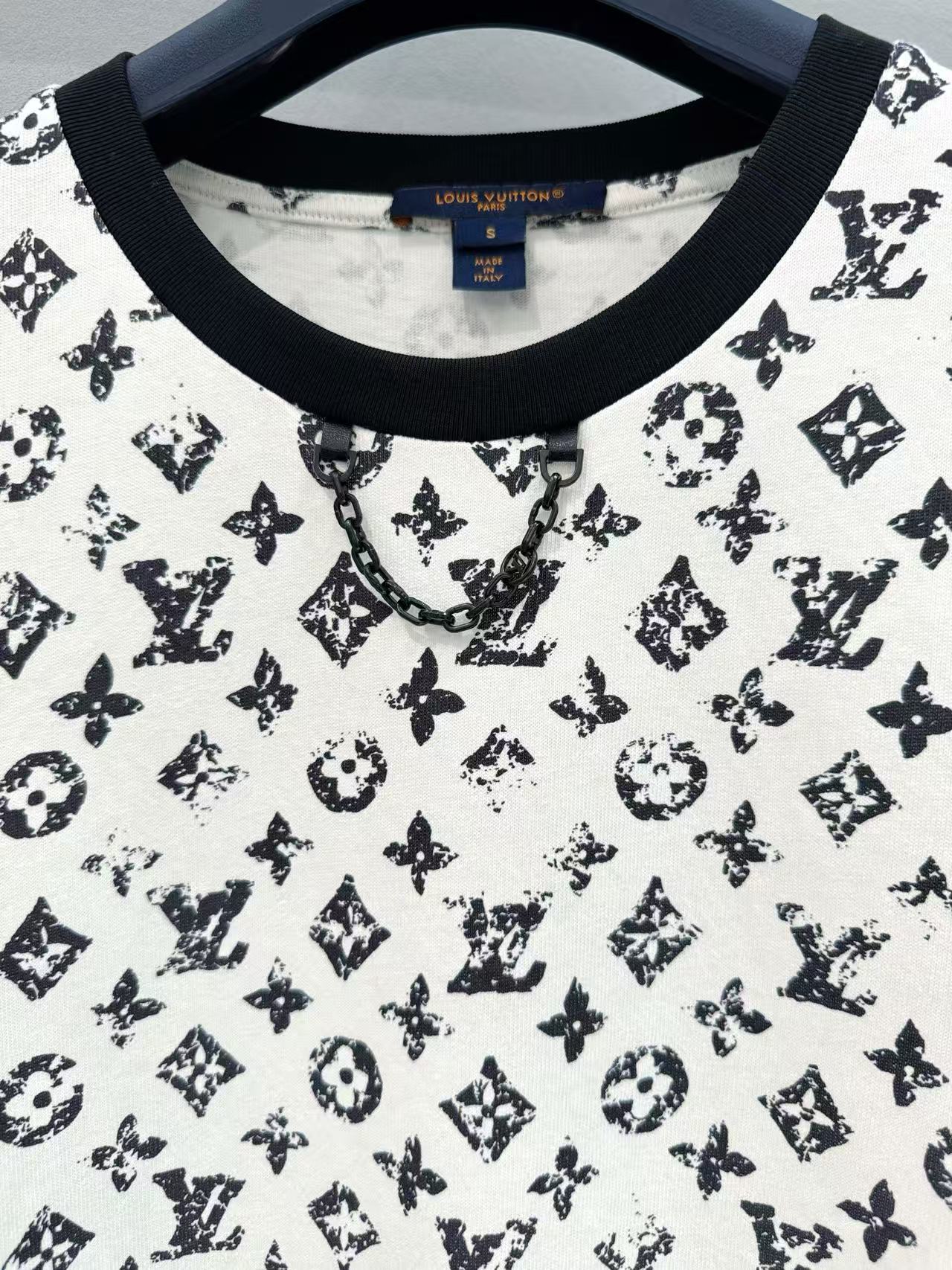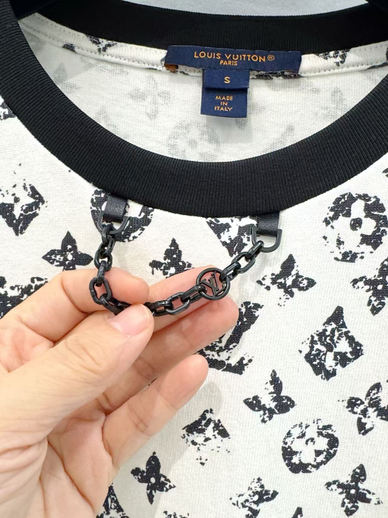 經典老花印花搭配滿版四葉草元素徽標,加入做舊磨花效果,讓整體呈現自然復古感,低調卻有型。領口素色包邊設計,加上字母鏈條細節點綴,讓簡單版型瞬間變得更有層次與質感。