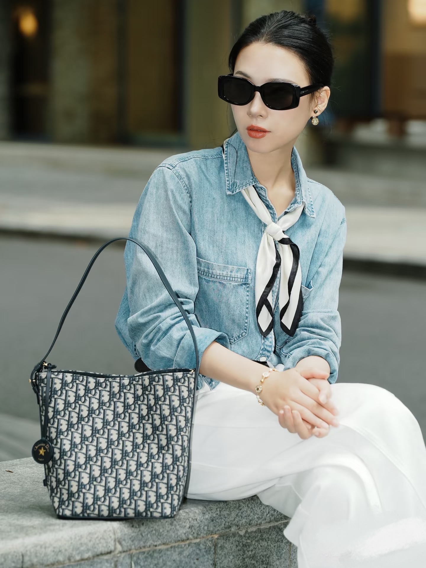 這款水桶包能輕鬆融入各種穿搭風格,搭配襯衫與牛仔褲展現法式隨性,或搭配洋裝與高跟鞋散發女性優雅氣息。藍色調的經典印花既耐看又充滿季節感,讓整體造型更顯高級。