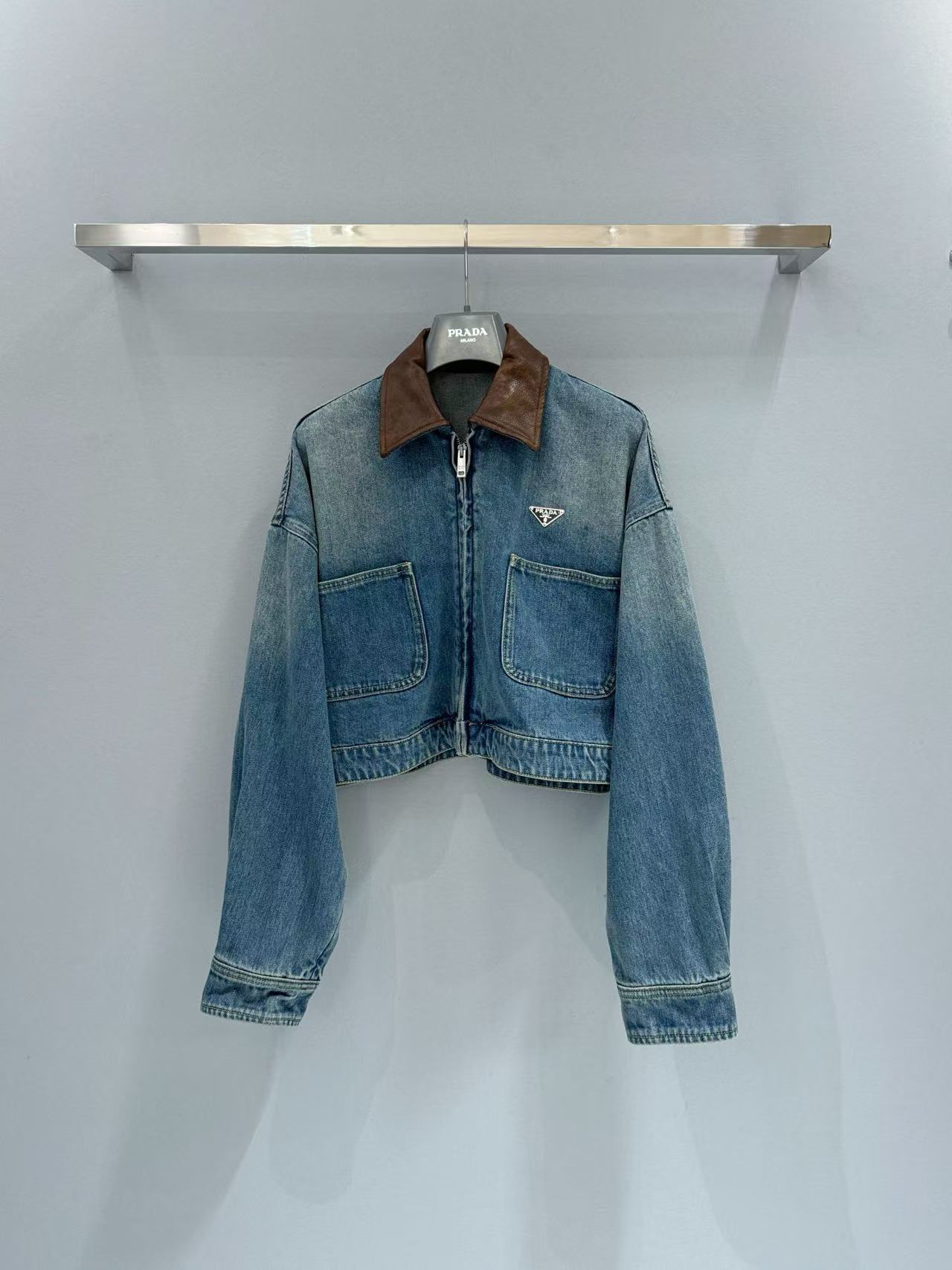 短版版型拉高身形比例,俐落又顯瘦。領口拼接棕色皮革細節,讓整體層次更豐富,也瞬間提升了高級感,搭配深藍水洗牛仔,更突顯品牌的精緻質感。