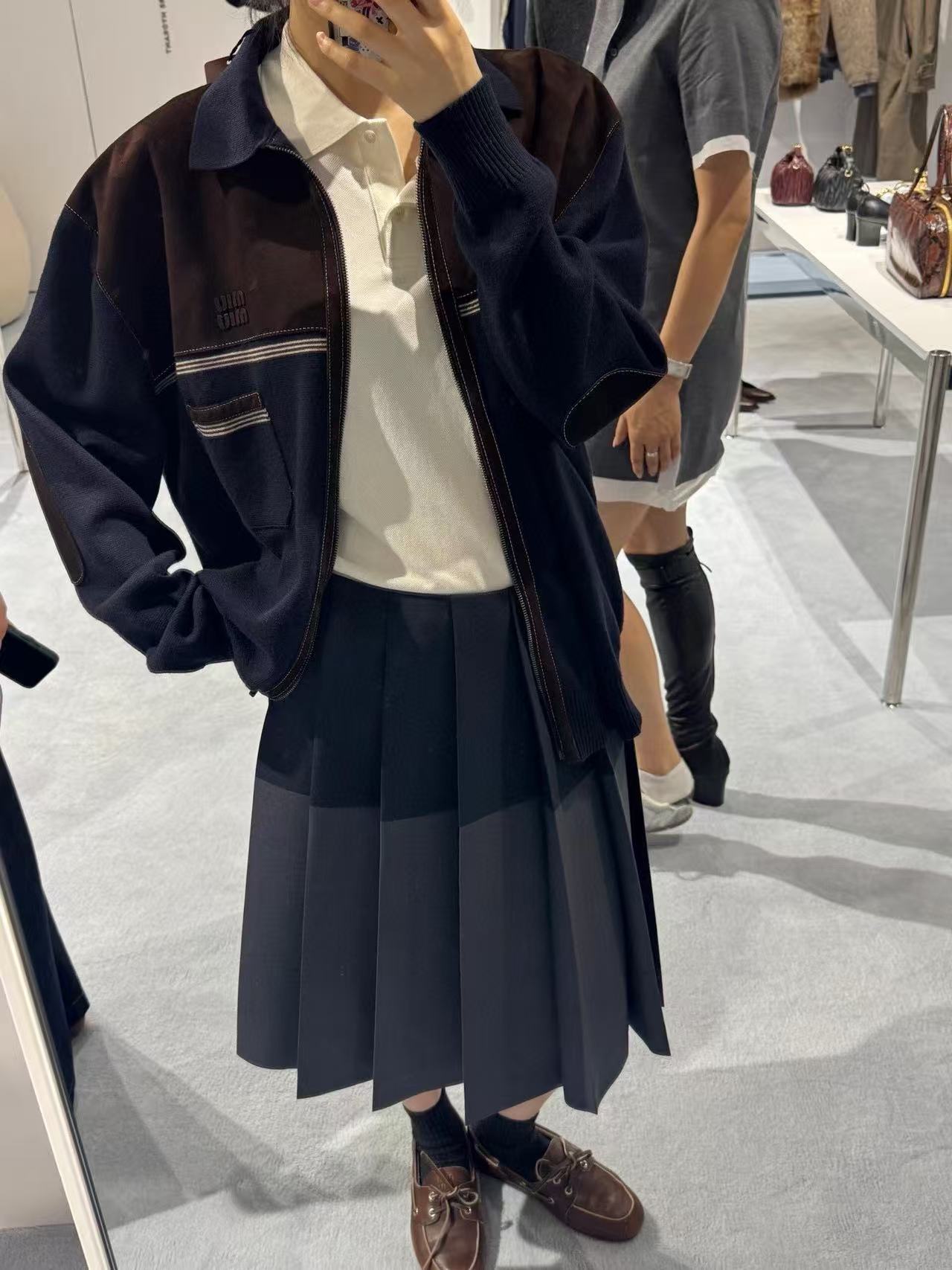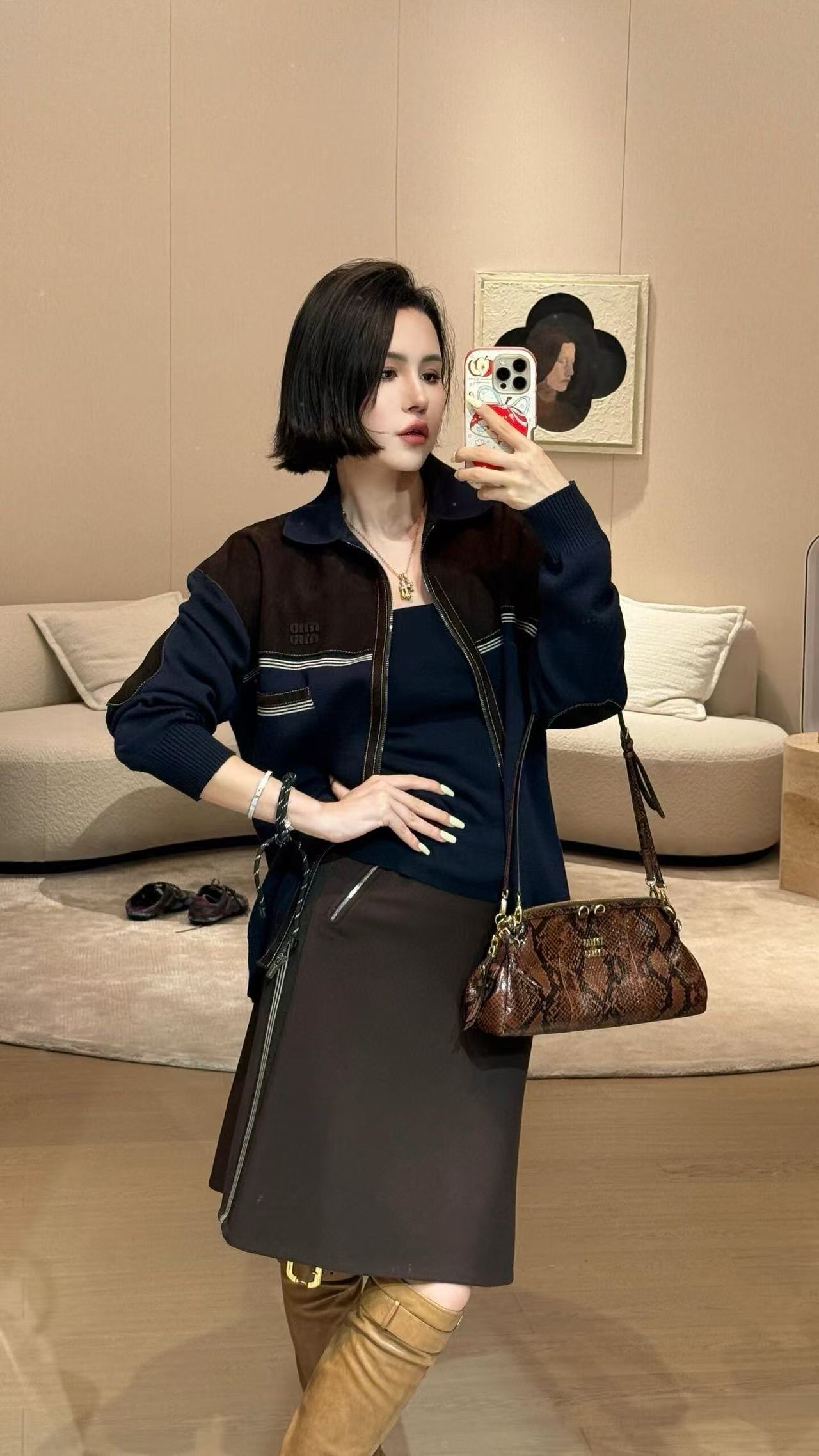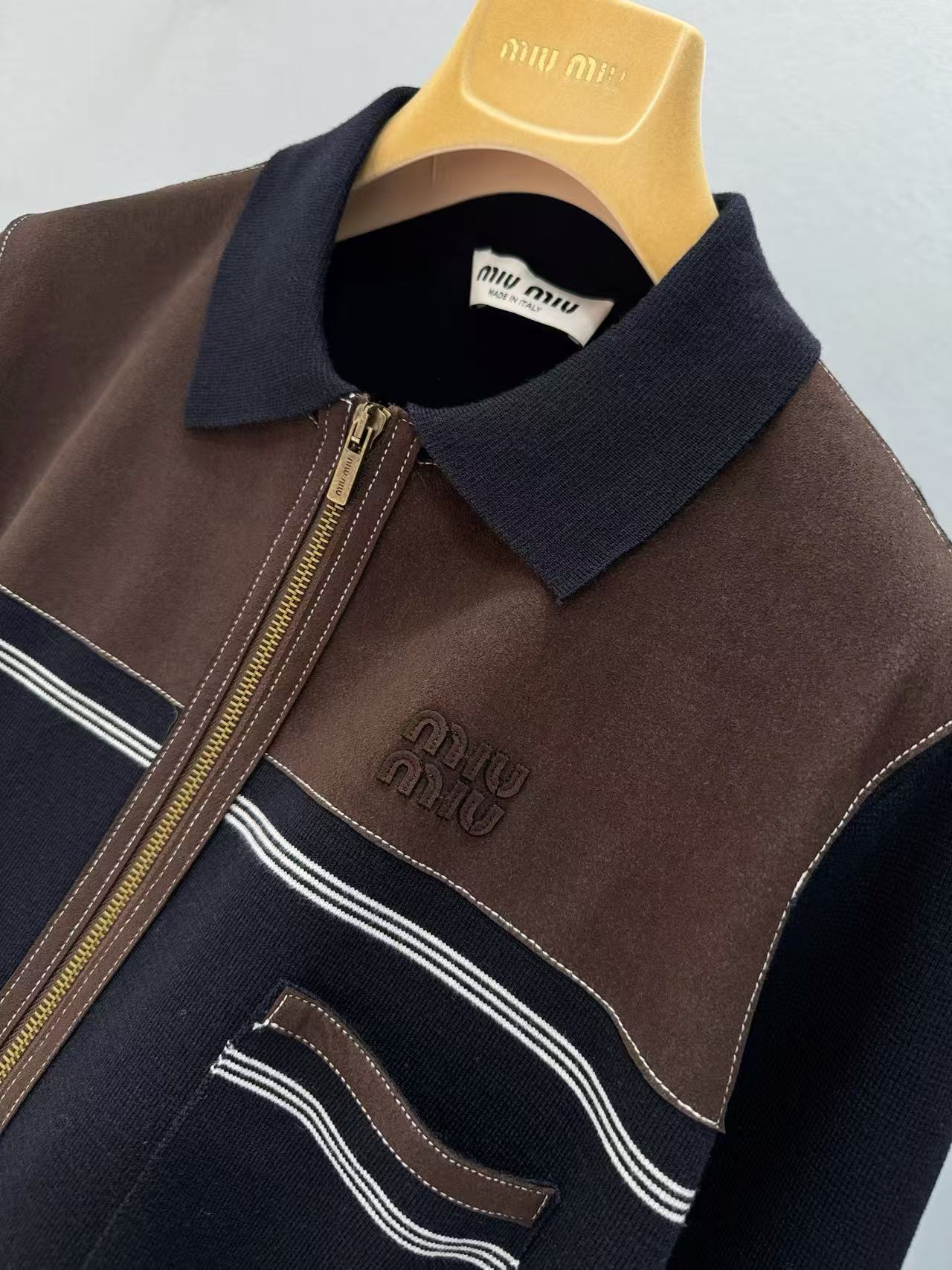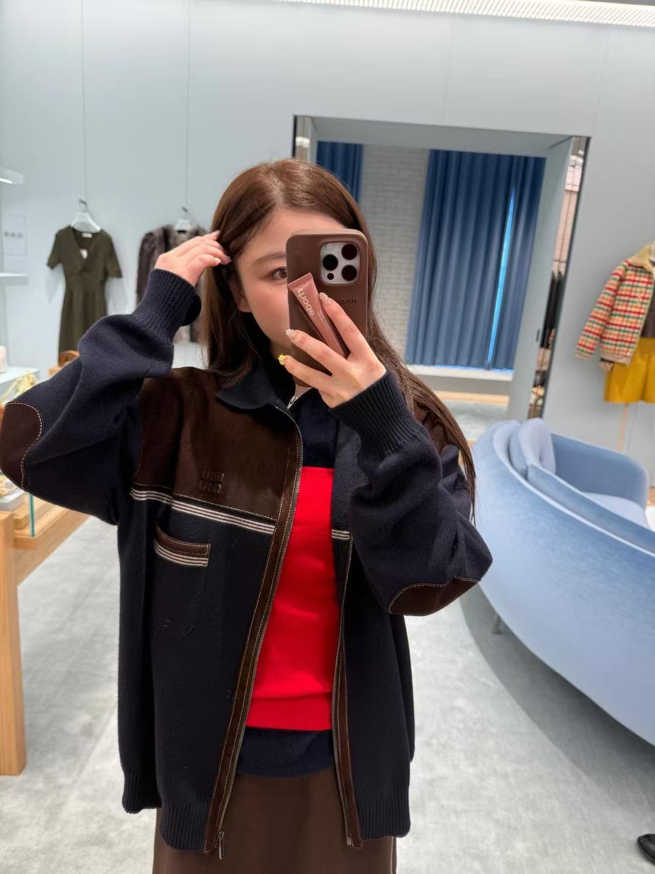 2025早秋 Miu家 羊毛拼麂皮拉鍊針織開衫