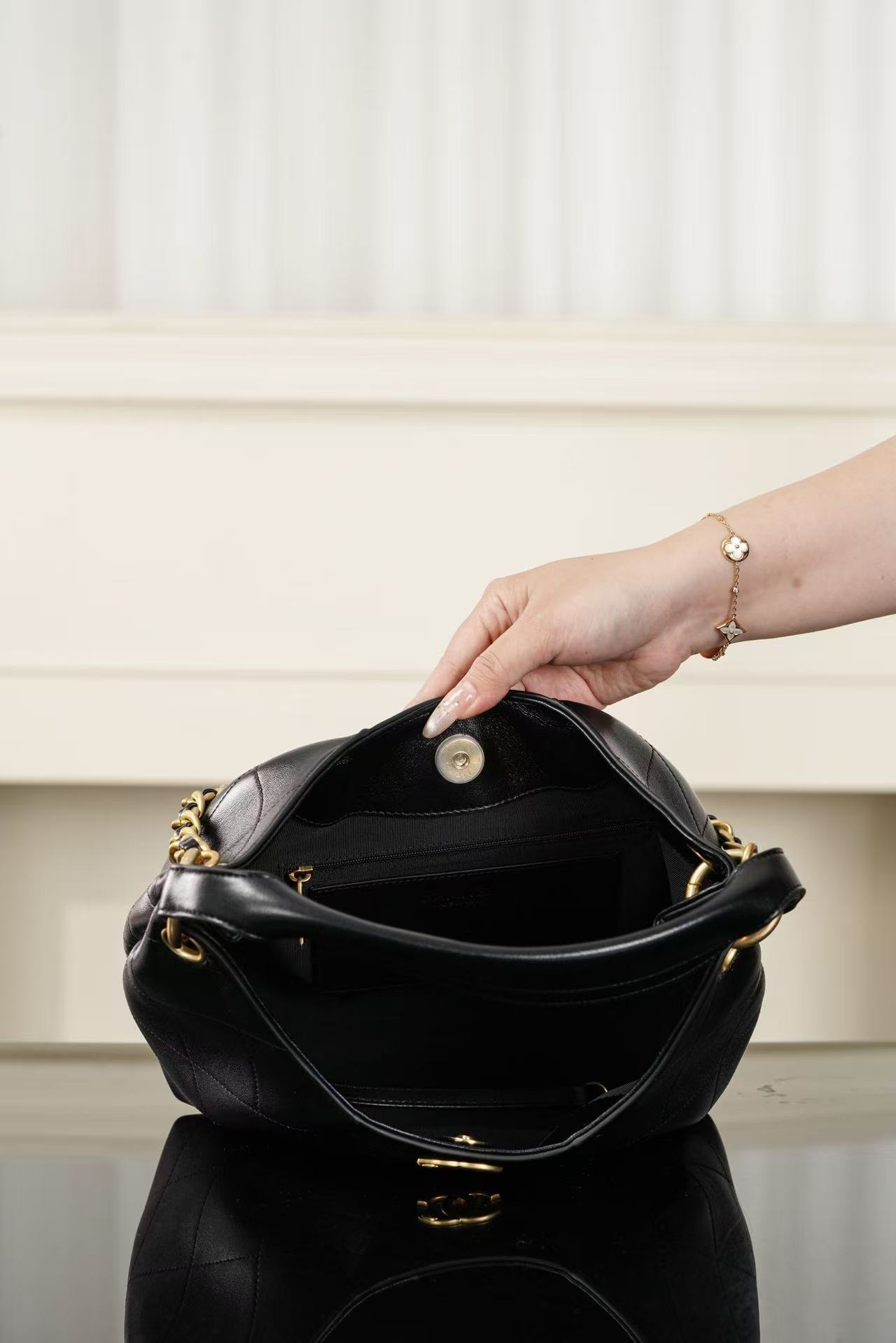 內部空間寬敞,輕鬆收納長夾、美妝袋與各式日常雜物,體現出精品對「美觀與機能並行」的極致追求。