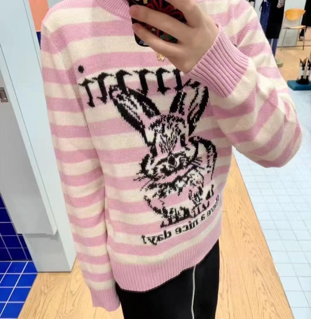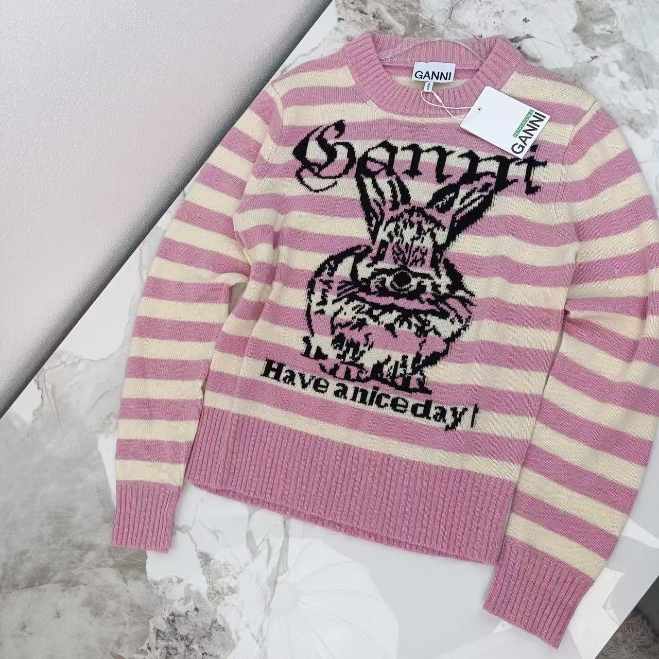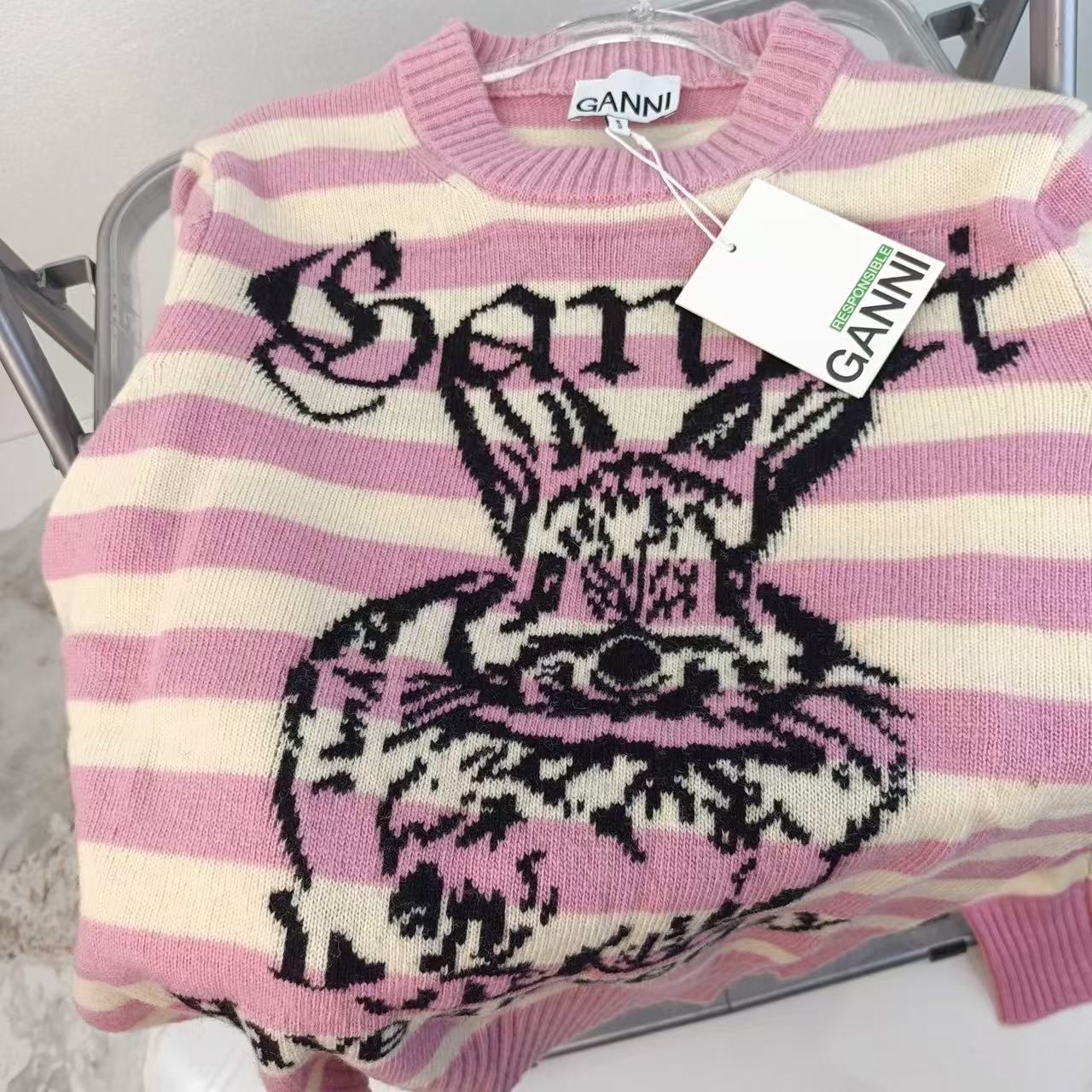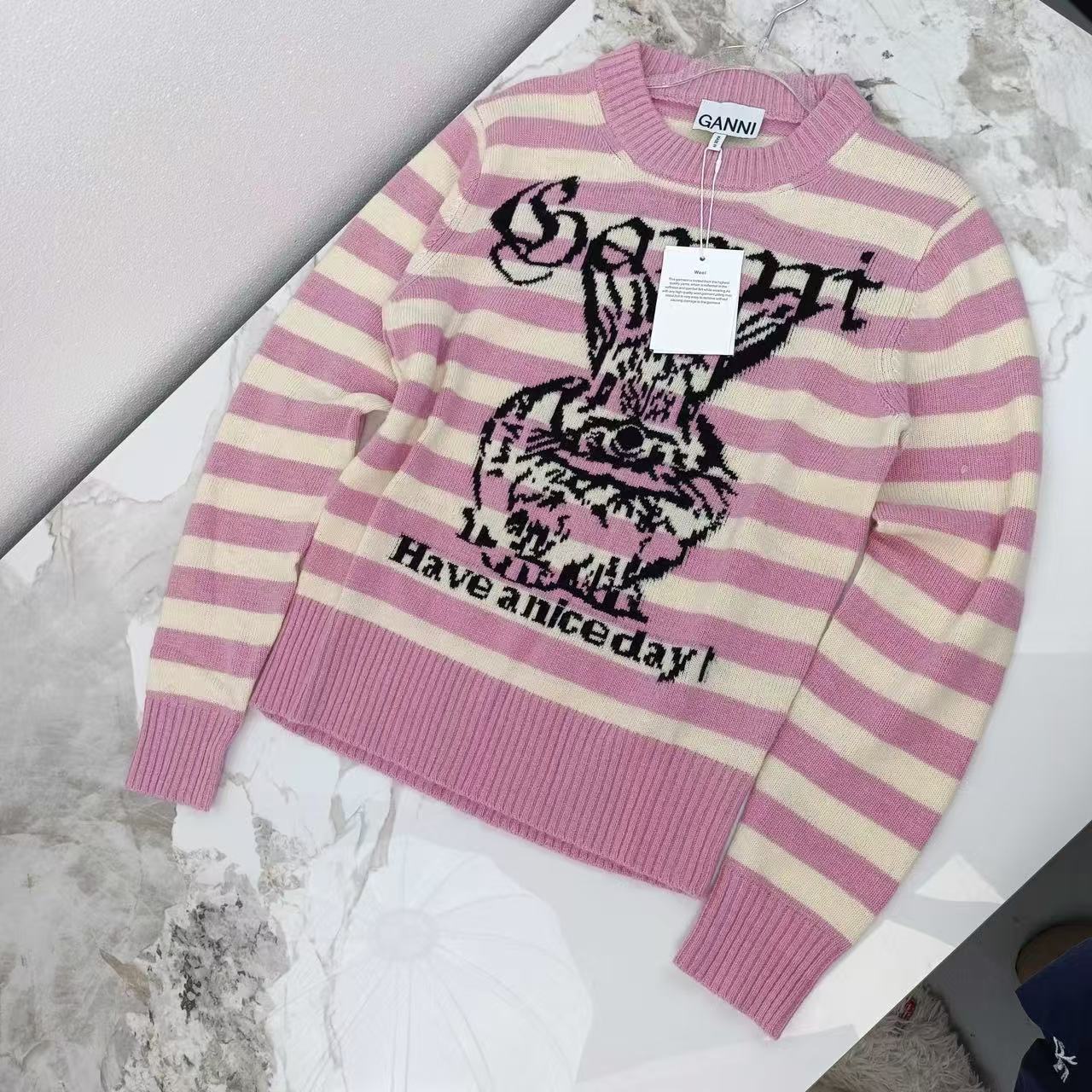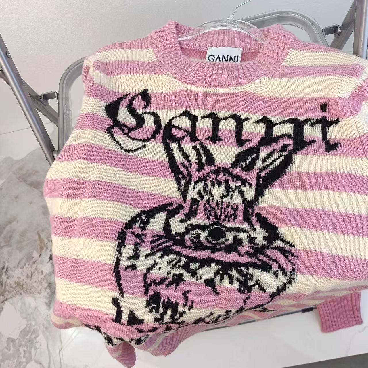 2025早秋新品 Ganni家 兔子條紋粉色羊毛毛衣
