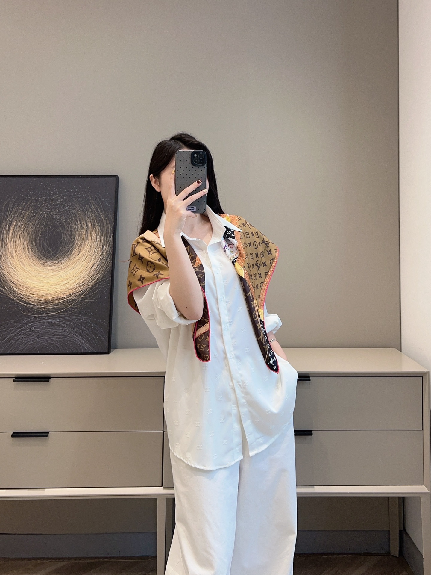 除了穿搭用途外,這條方巾也非常適合 裝裱成畫作,掛在家中或辦公室空間,為環境增添一份時尚與藝術兼具的氛圍。