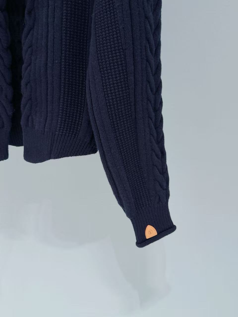 麻花紋理立體有層次,搭配皮扣設計超級精緻,袖口跟下擺的皮質點綴直接把細節拉滿,低調奢華感爆表。