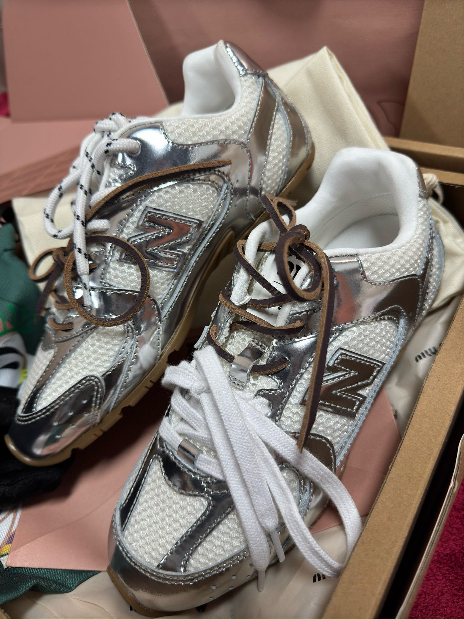 Miu X NB聯名款530SL鏡面銀牛皮運動鞋