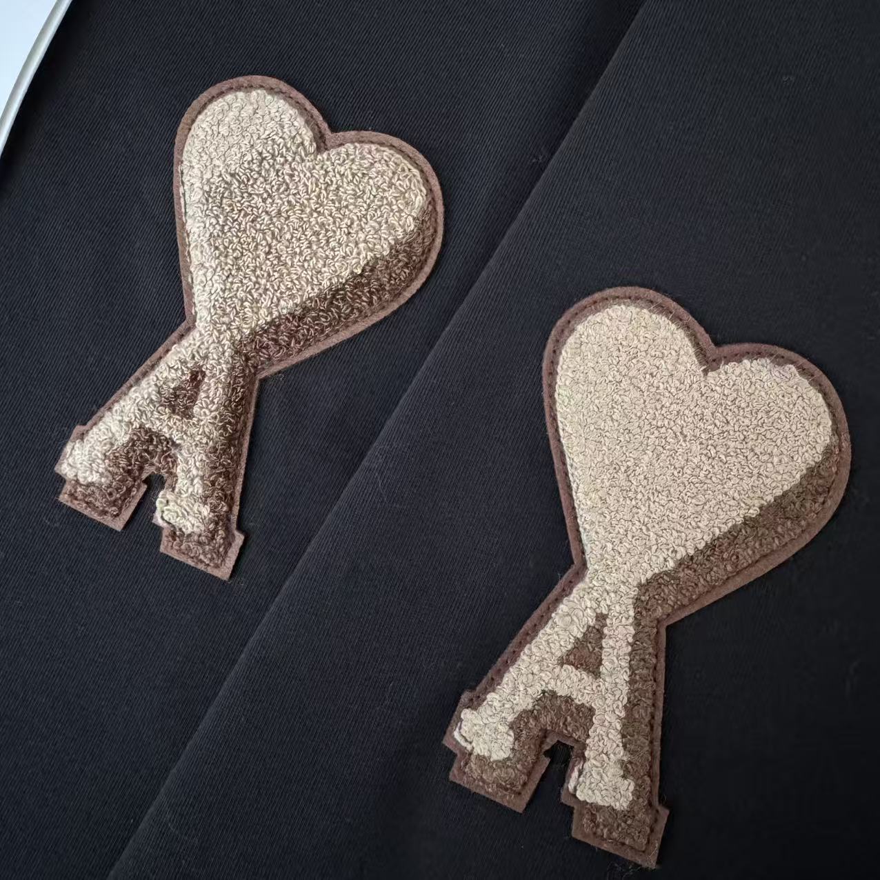 設計核心聚焦於胸前標誌性的金色大愛心,不同於傳統的平鋪印花,這次採用了質感極佳的金色毛巾圈(Chenille)繡花工法,讓標誌在深邃的純黑底色上呈現出立體且溫潤的光澤,展現出品牌難得一見的高級感。