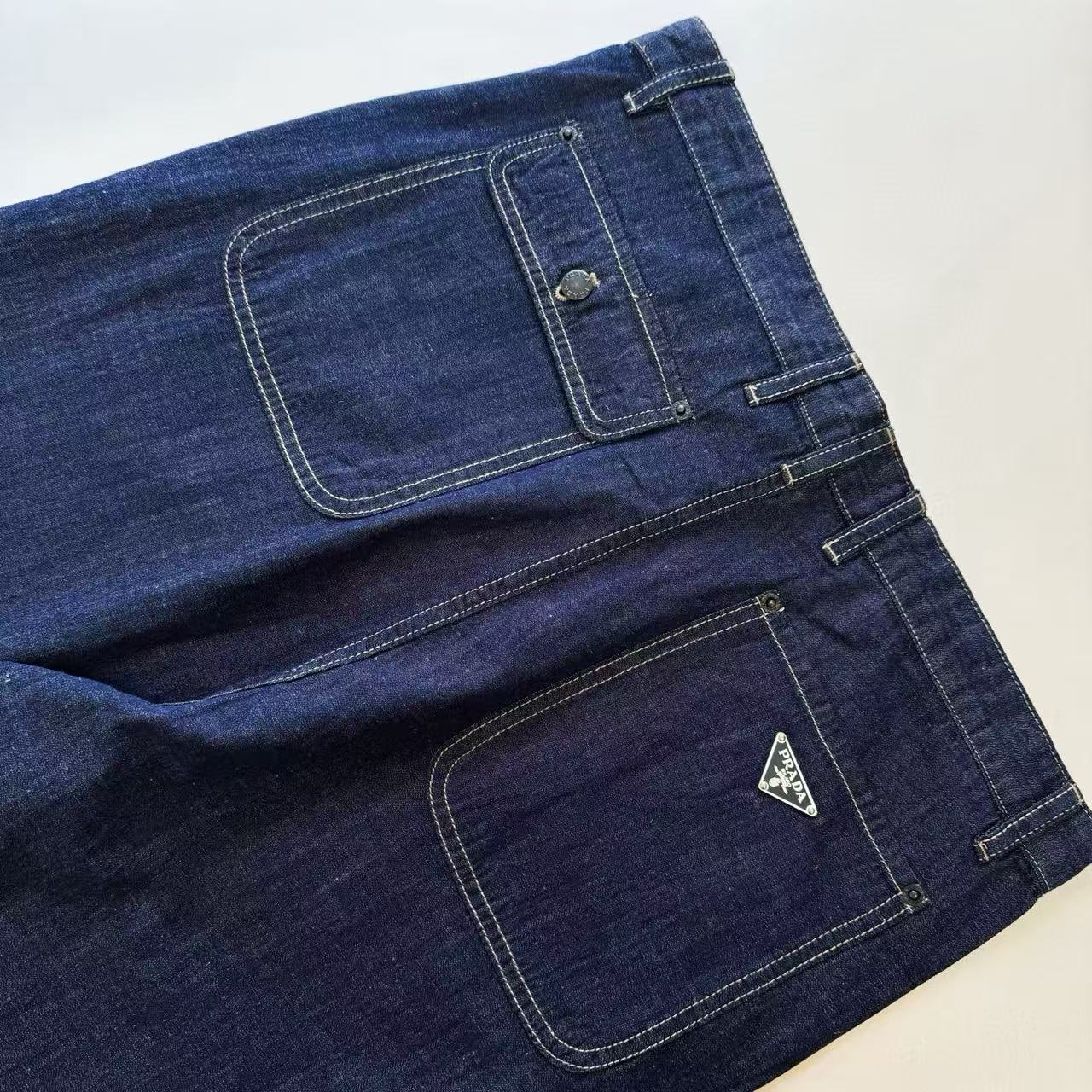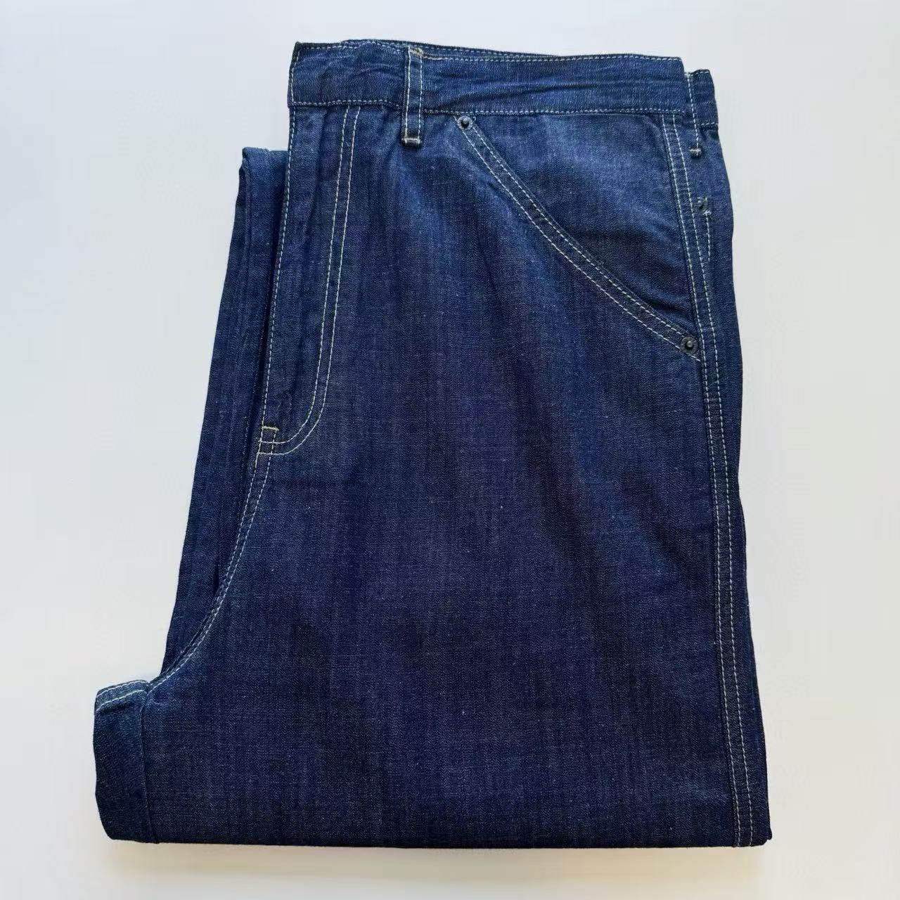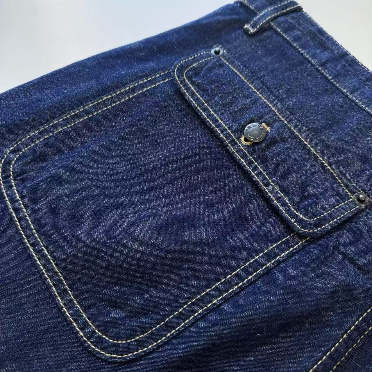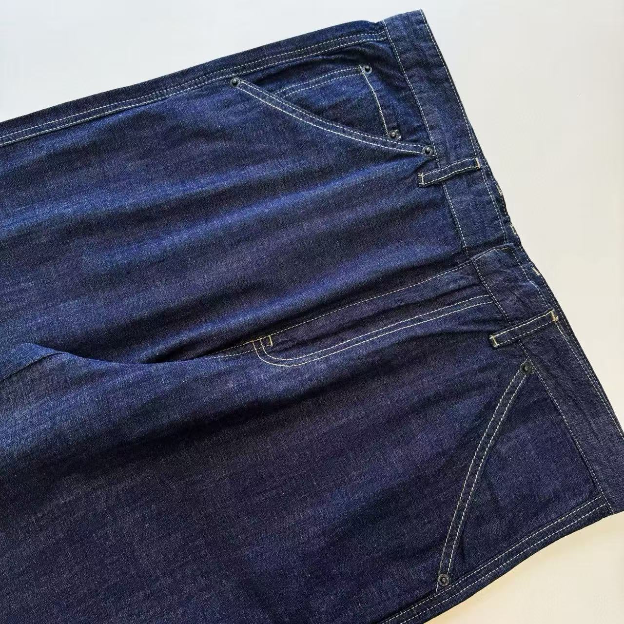 整體採用小型模板機定位車縫(又稱畫圓機),確保每一針線都整齊乾淨。褲身多處撞色粗針明線,不僅提升視覺層次,也展現出工裝風的粗獷感。