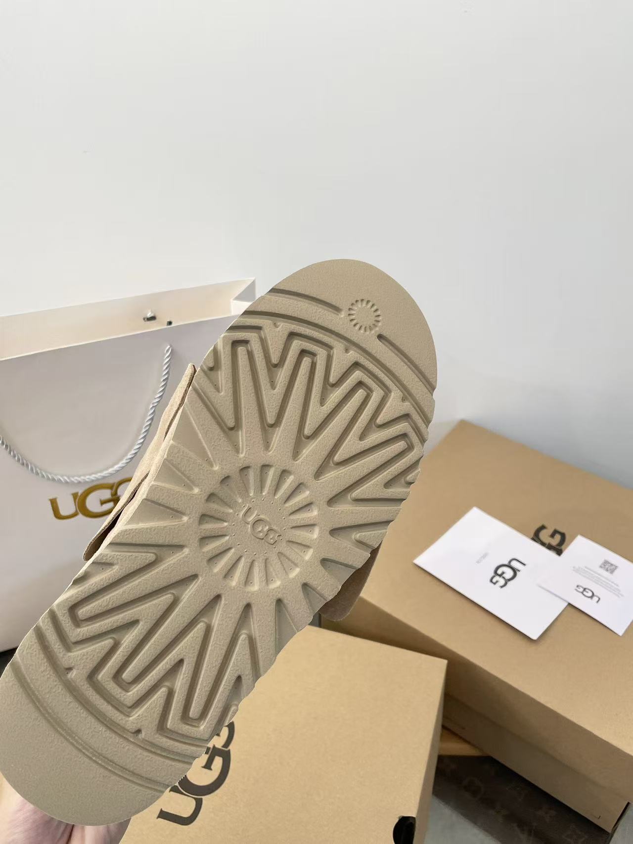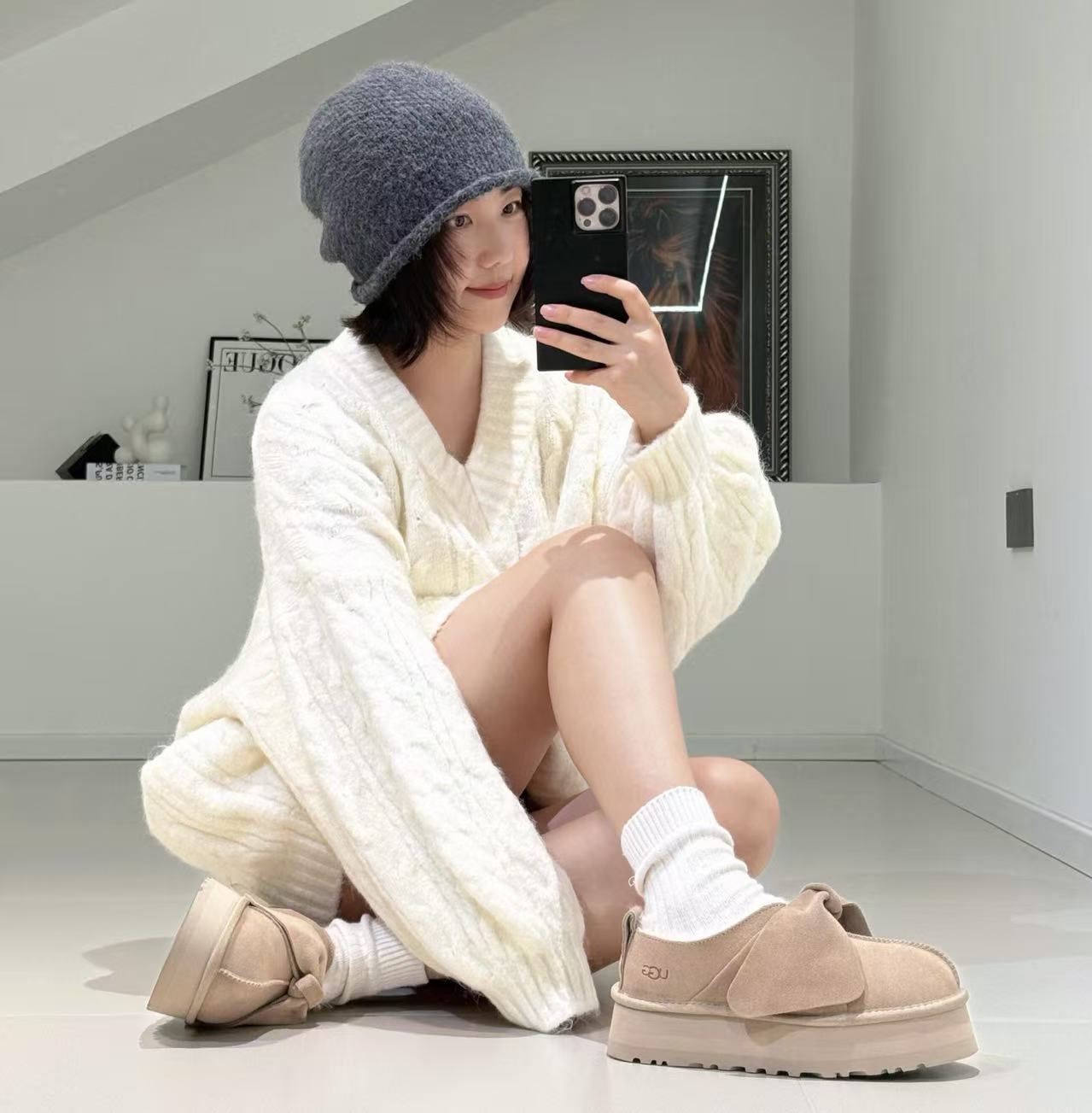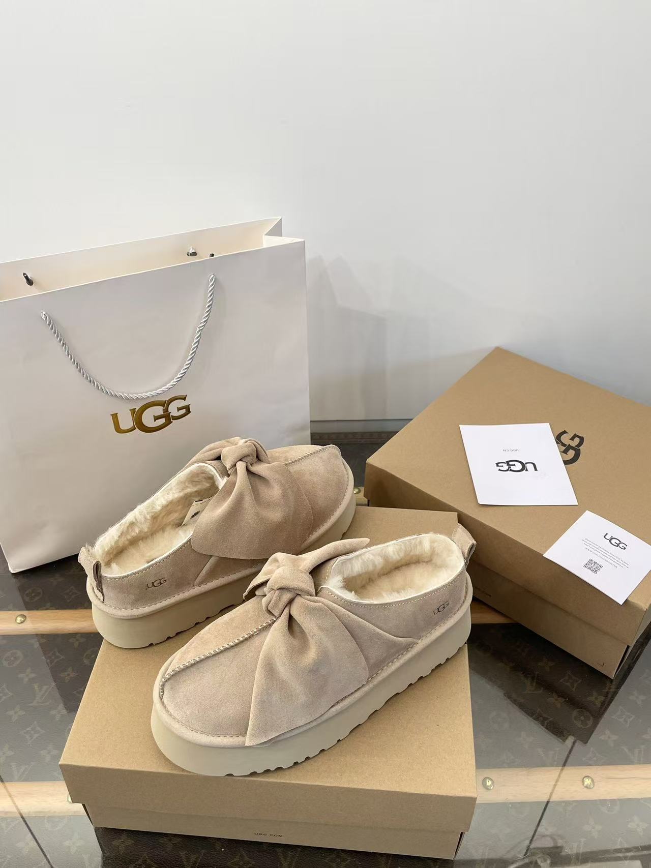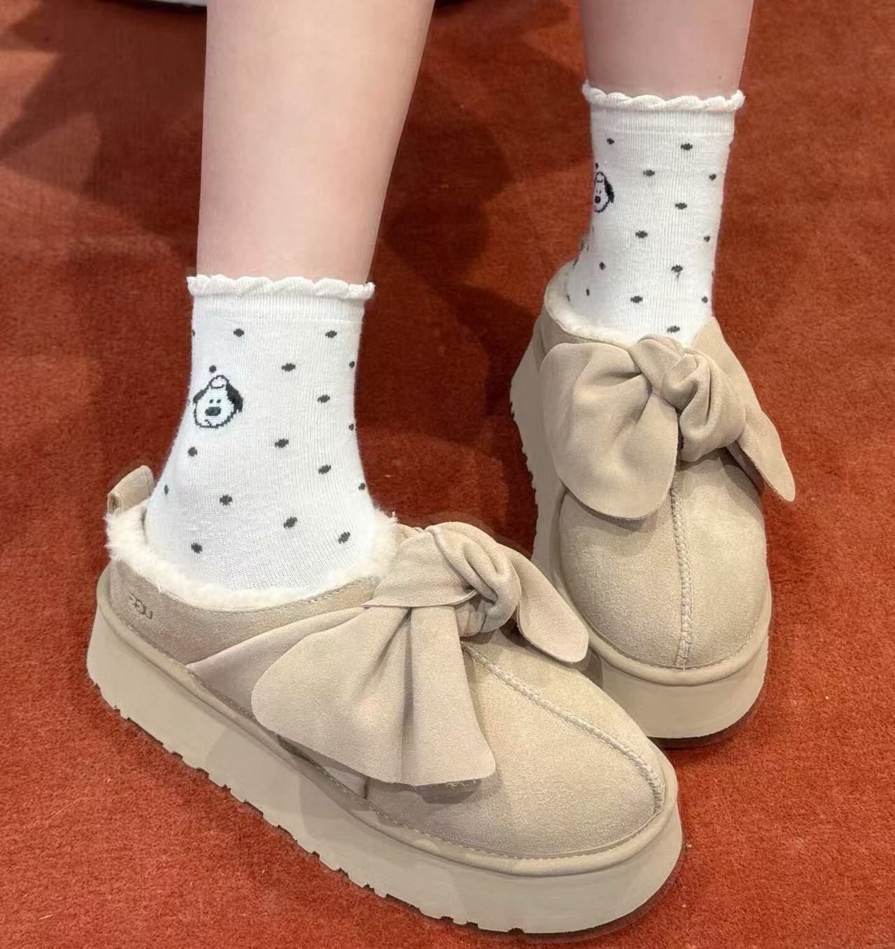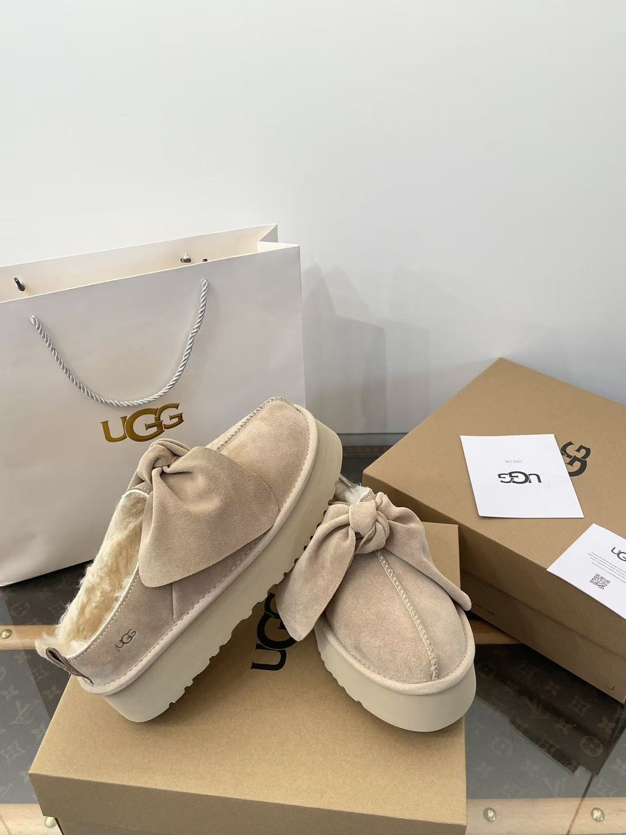 UGG 本季將經典的一腳蹬設計與誇張的蝴蝶結元素結合,推出了這款兼具溫暖與時尚感的厚底毛毛鞋。