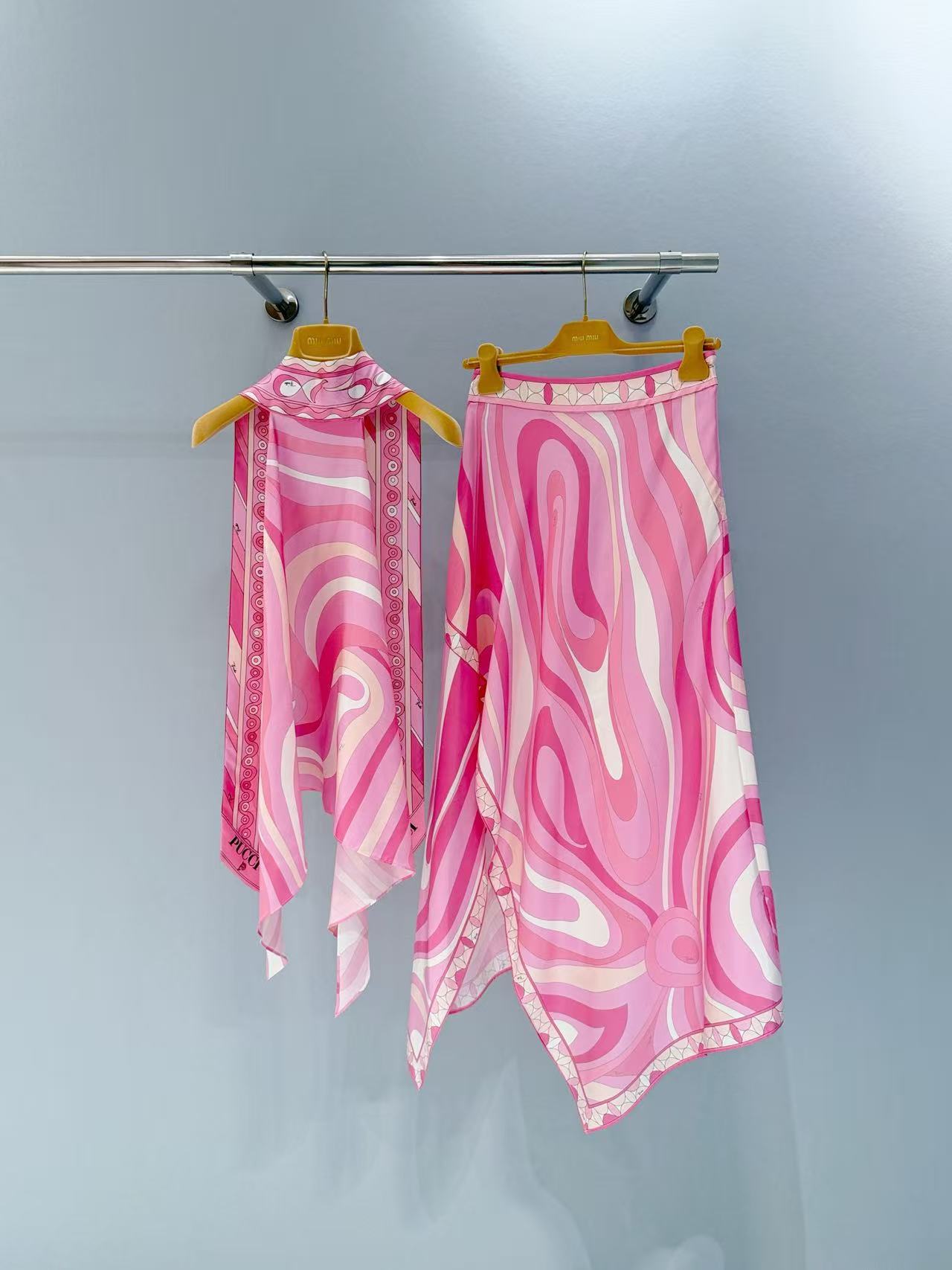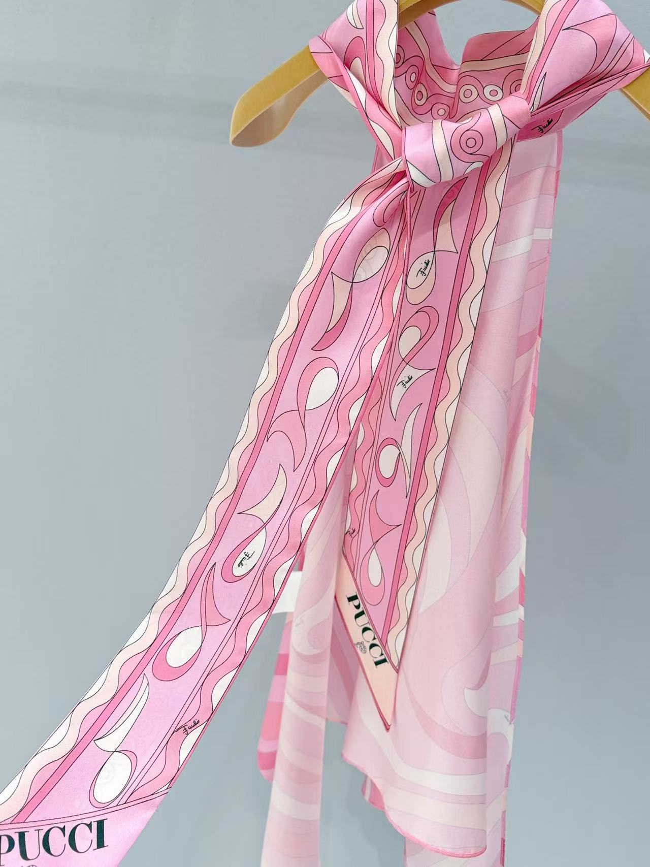 標誌性幾何漩渦噴繪: 採用高精密數位印染技術,將粉、橘、白相間的圖騰還原得色彩飽滿。印花色彩與絲綢光澤完美融合。