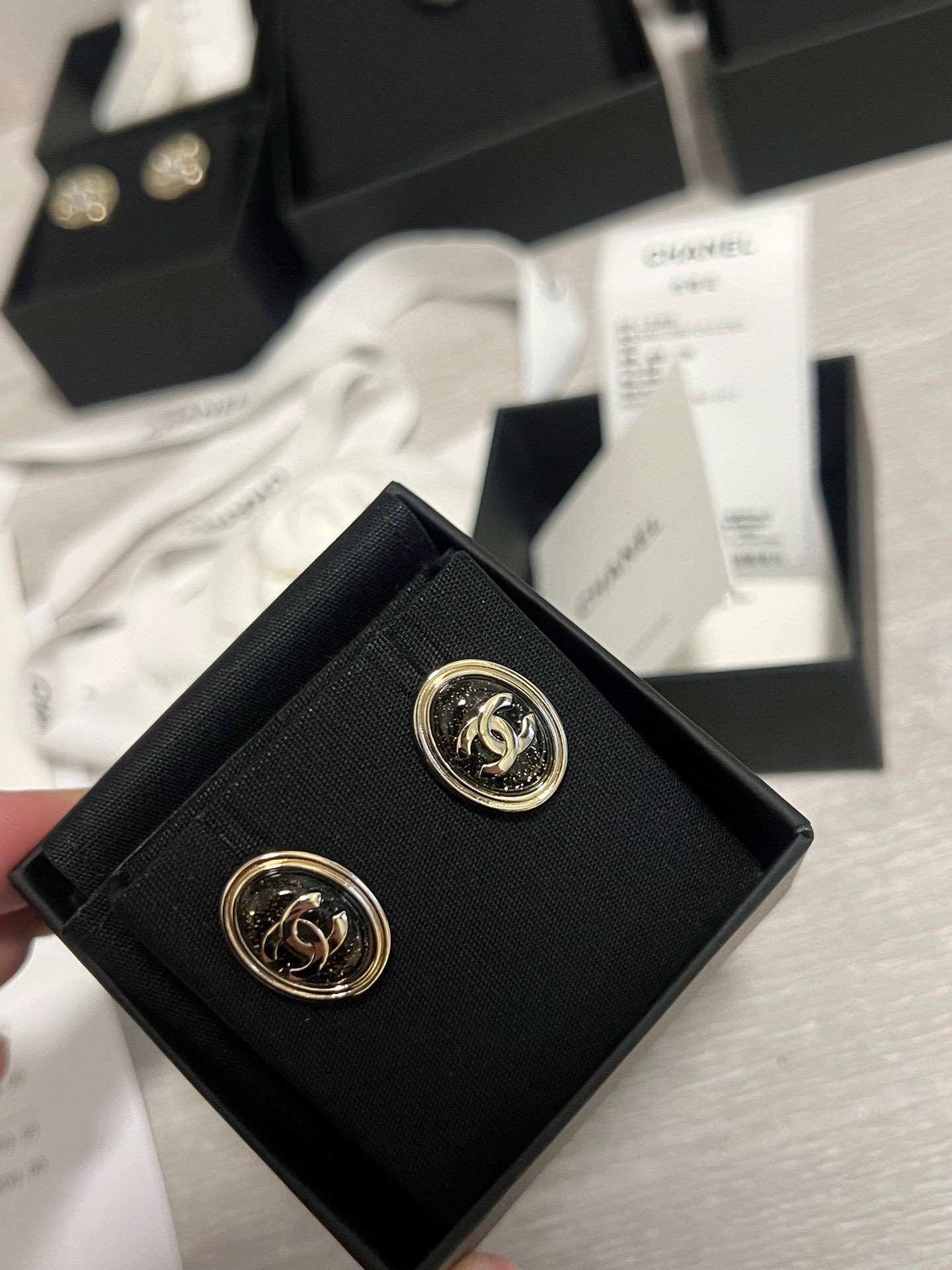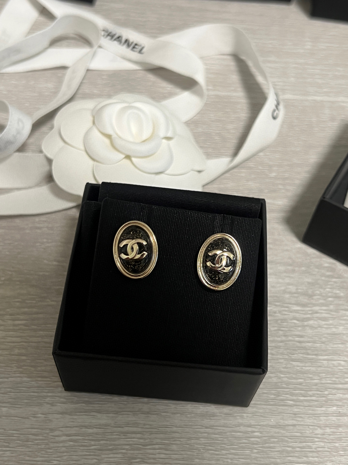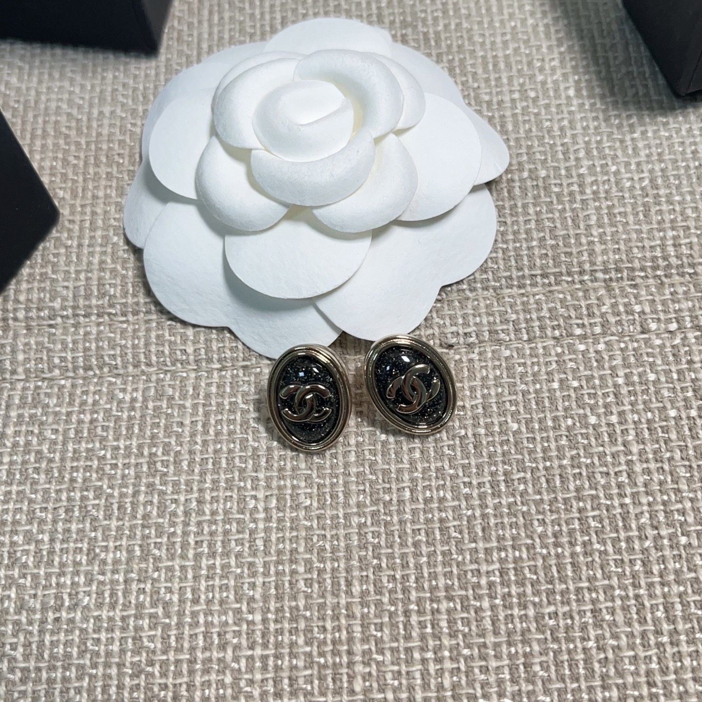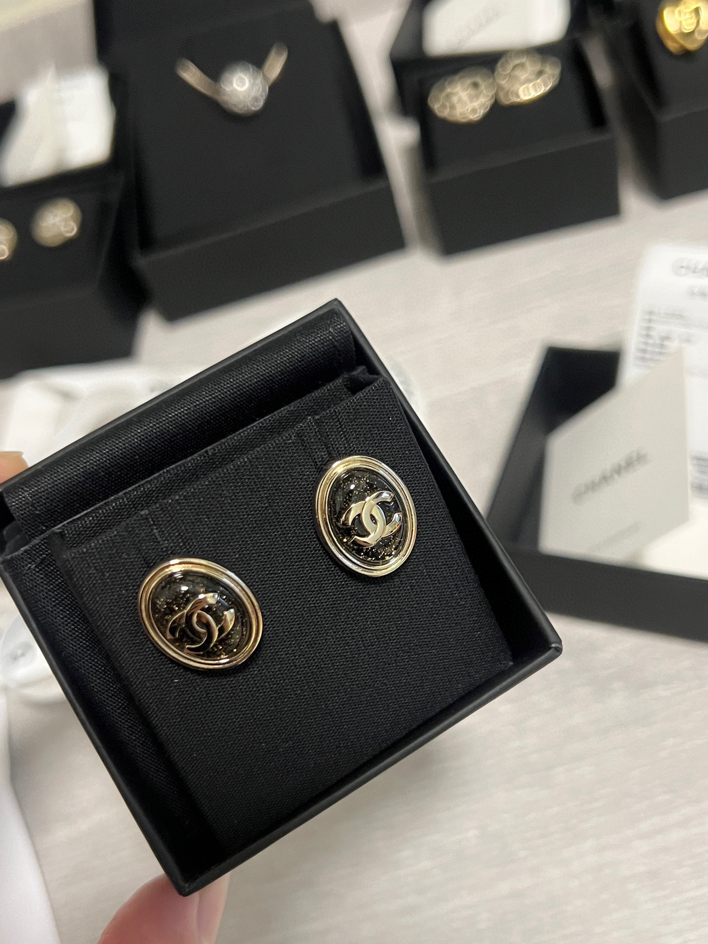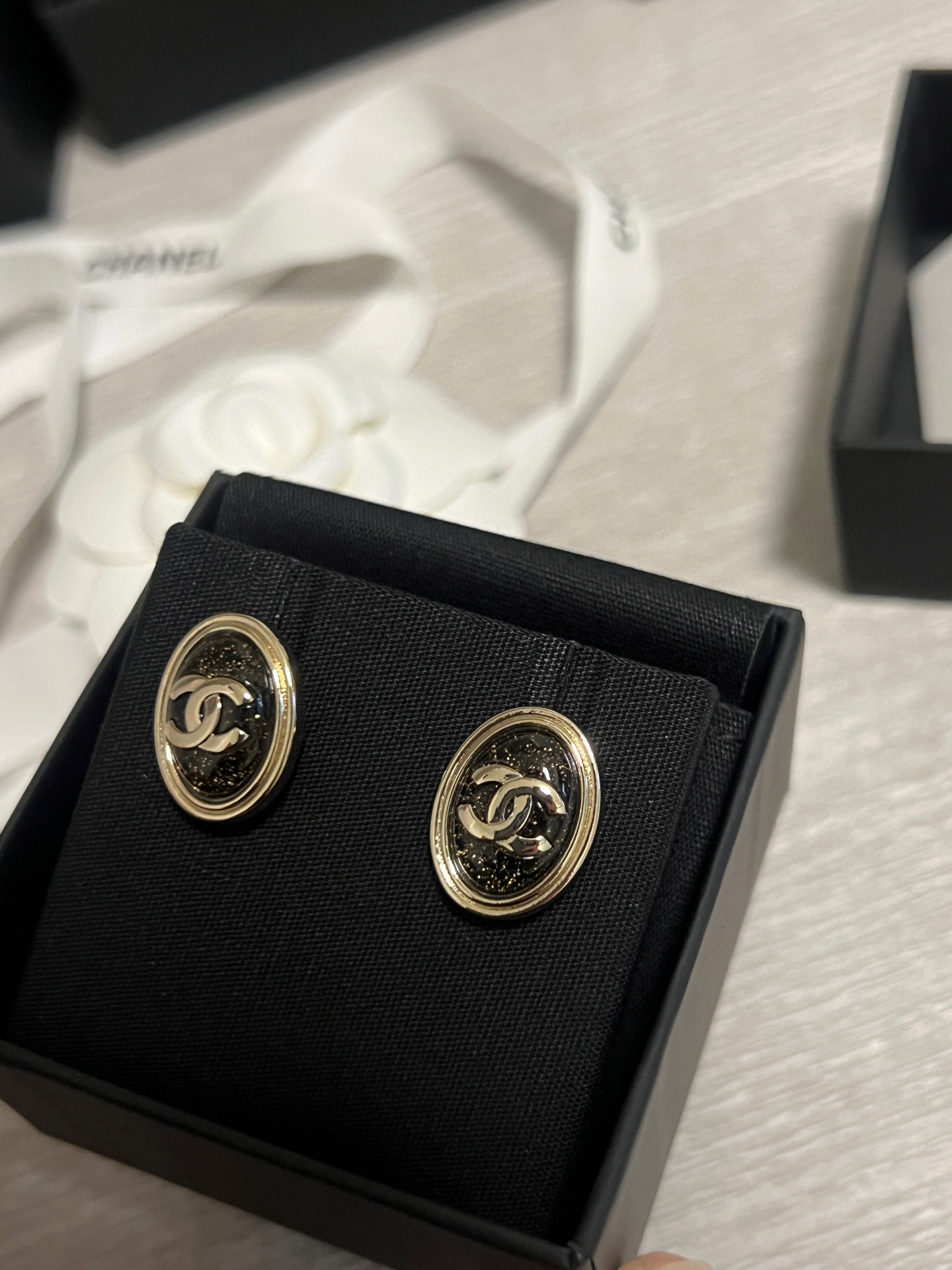 黑石中隱隱閃耀著金色細閃,如同夜空裡最閃爍的星光,低調卻奪目,越看越迷人。橢圓造型優雅大氣,不論是日常出門還是正式場合都能完美駕馭,整體散發出一種「靜靜地在發光」的高級氛圍。