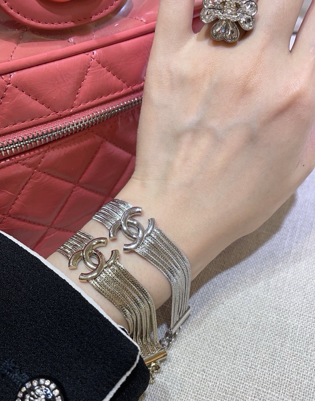 這條手鍊的設計超用心!正面是亮面經典的雙C Logo,背面則是充滿設計感的熔岩紋路,兩面戴都好看!而且完全不用鑽石,就已經閃閃發光,超級吸睛!