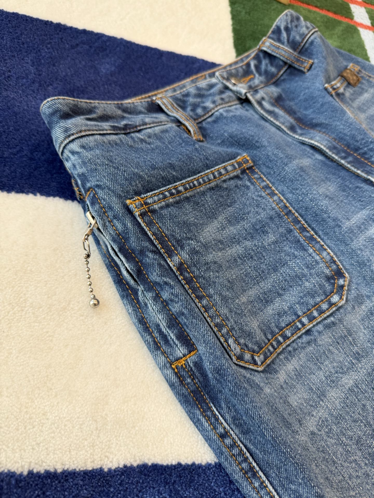 選用進口復古丹寧布,布性扎實卻不厚重,手感帶有自然挺度與柔軟度。穿起來不僵硬,卻能維持褲型線條,垂墜感表現非常好。
