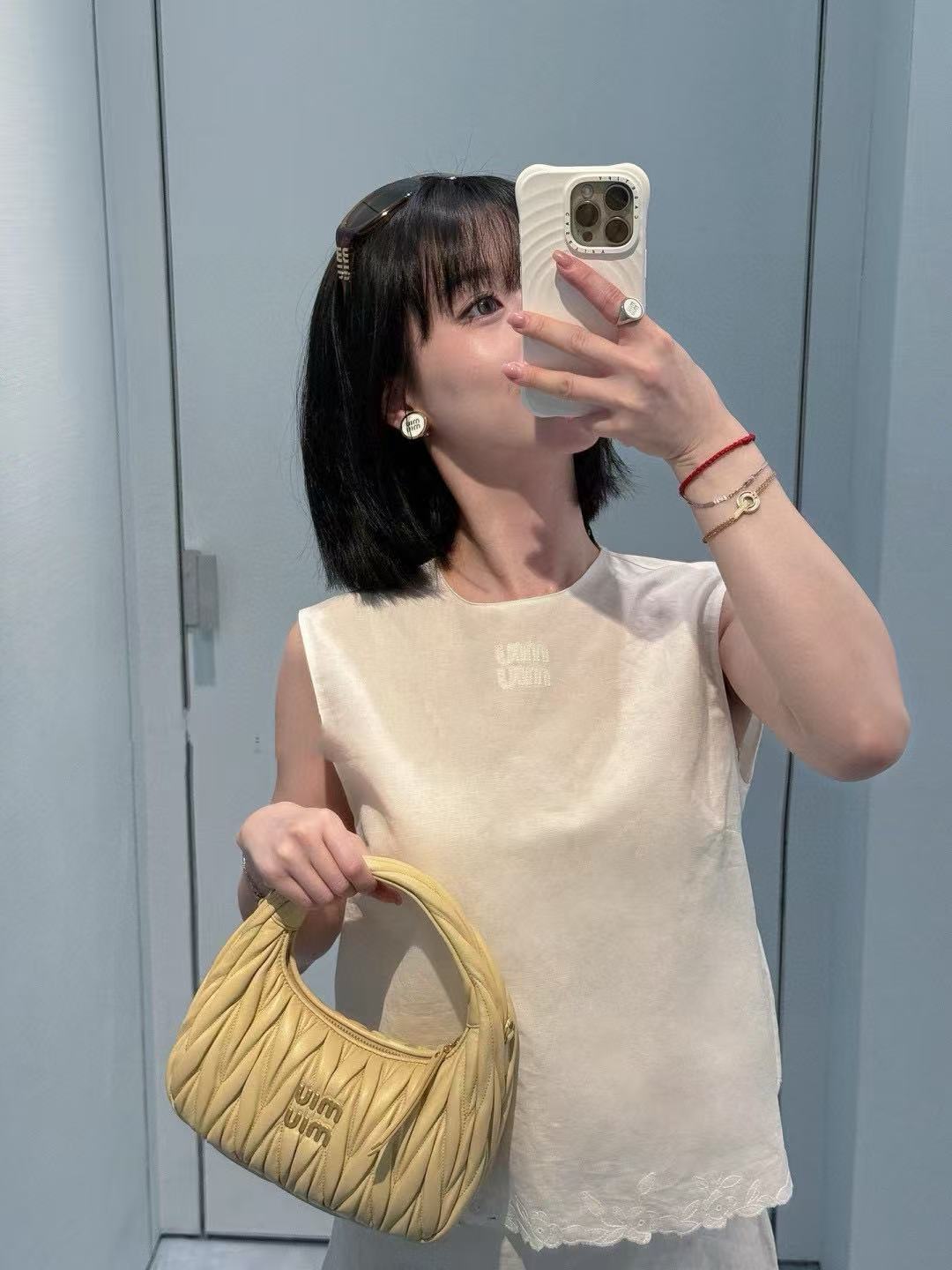 背心以細膩的刺繡圖案為亮點,結合 Miu 標誌性的簡約設計,呈現高級又不失個性的時尚感,完美展現品牌獨特美學。