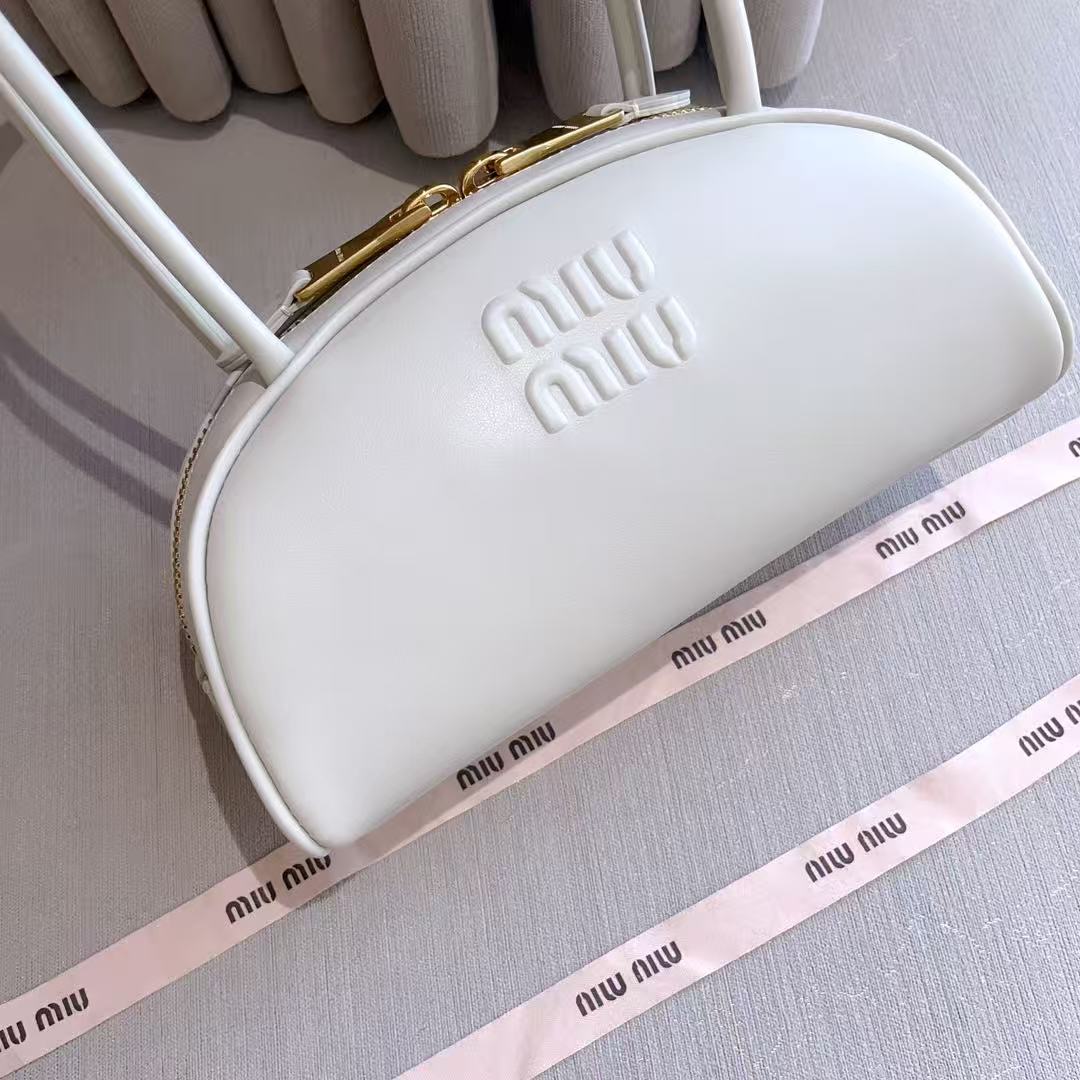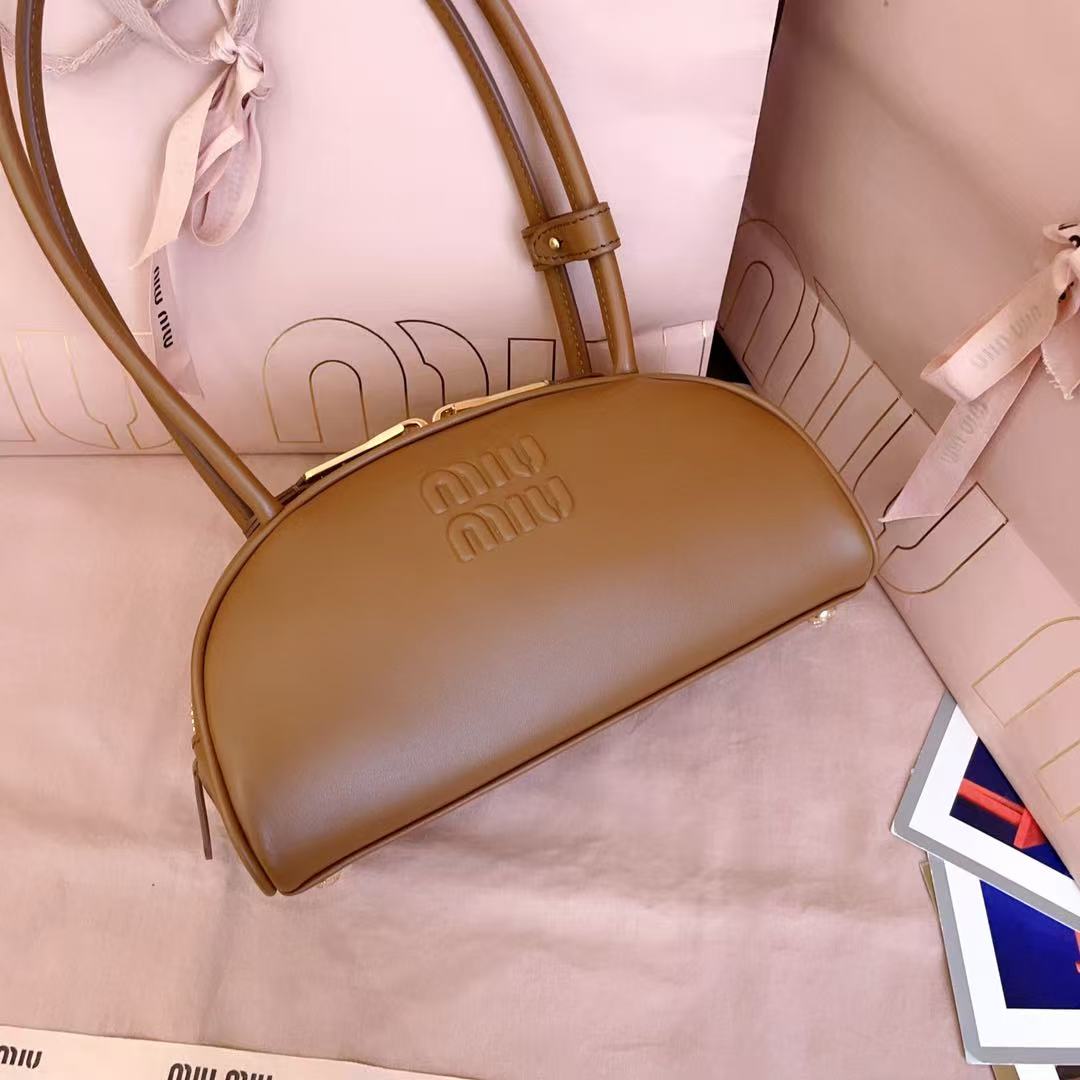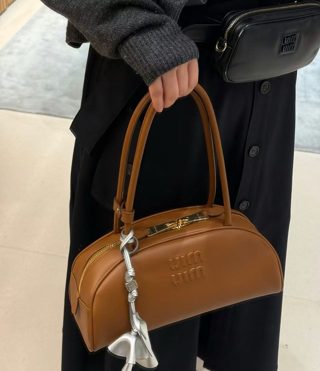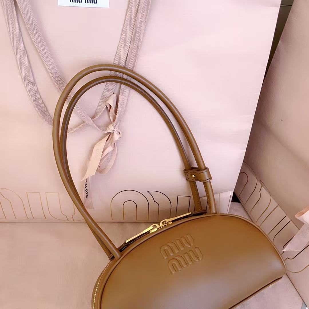 結構化半圓設計: 採用高難度的立體成型工藝,確保包身在空載狀態下依然能維持圓潤有型的線條,不會輕易扁塌。正面點綴經典的 miu標誌性 Logo,低調彰顯品牌辨識度。