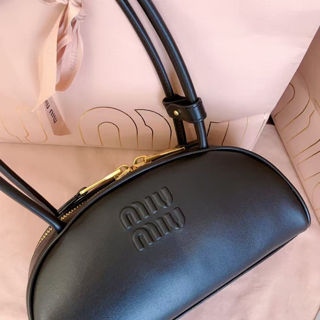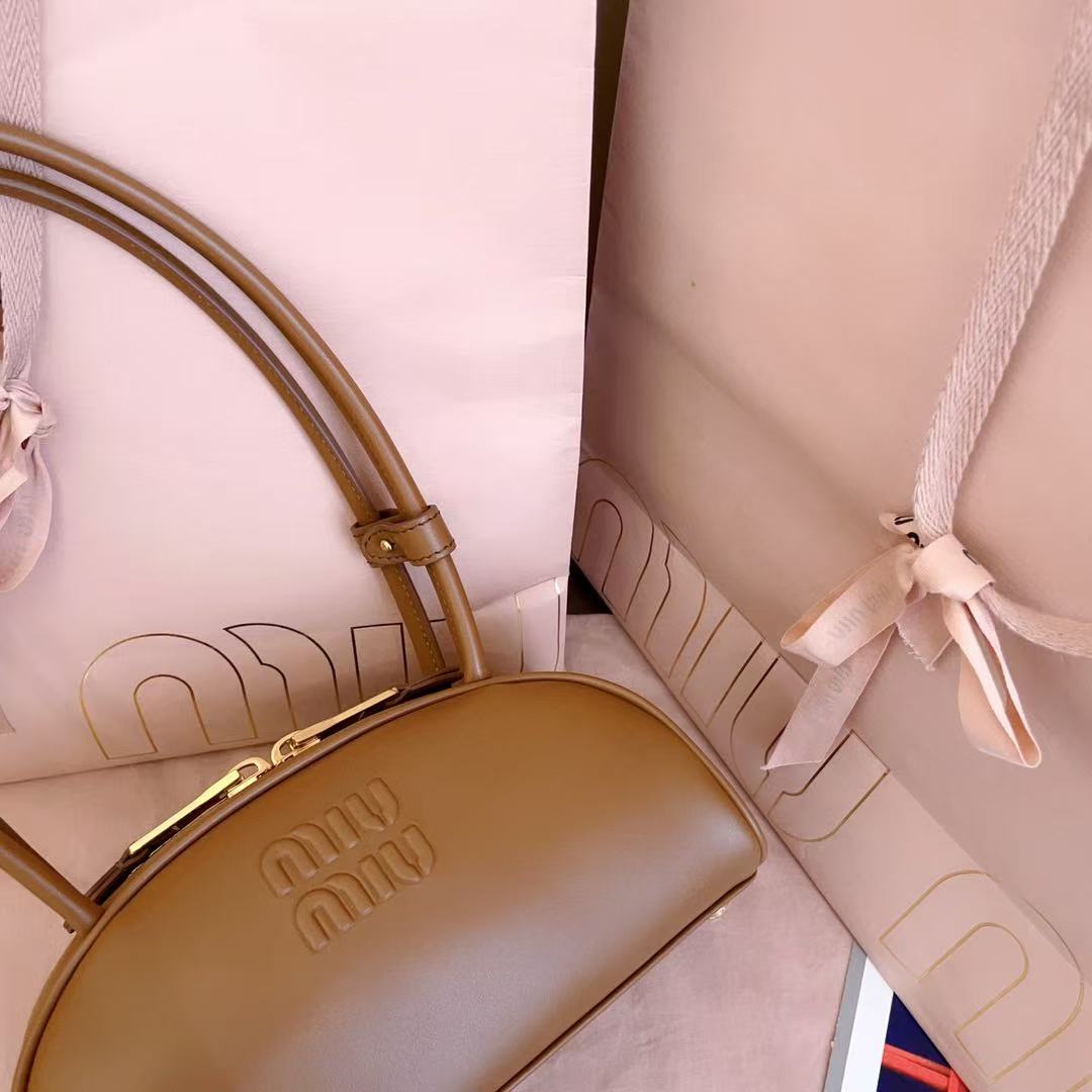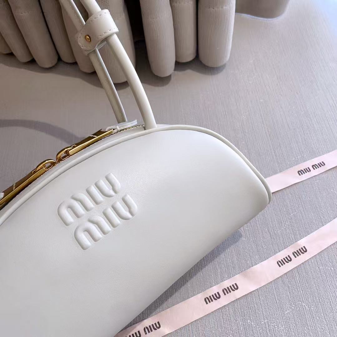 結構化半圓設計: 採用高難度的立體成型工藝,確保包身在空載狀態下依然能維持圓潤有型的線條,不會輕易扁塌。正面點綴經典的 miu標誌性 Logo,低調彰顯品牌辨識度。