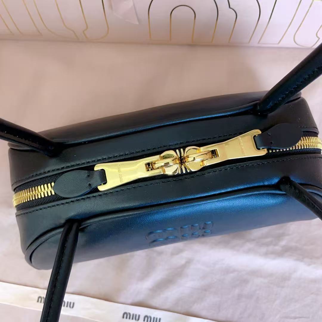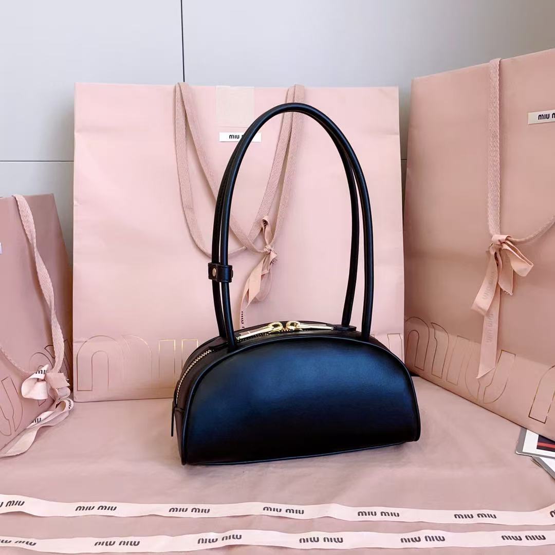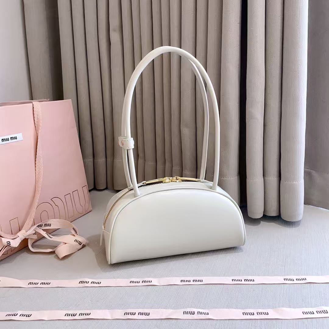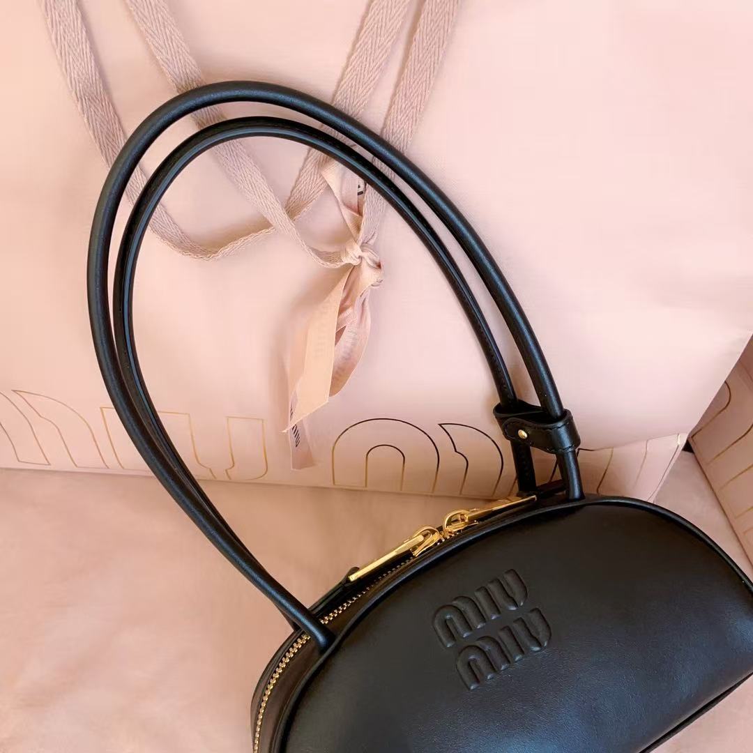 結構化半圓設計: 採用高難度的立體成型工藝,確保包身在空載狀態下依然能維持圓潤有型的線條,不會輕易扁塌。正面點綴經典的 miu標誌性 Logo,低調彰顯品牌辨識度。