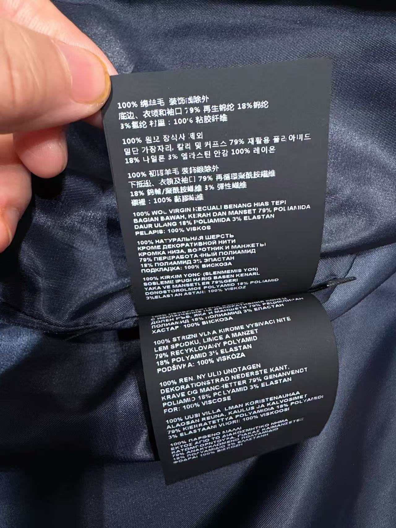 採用定製色織綿羊毛材質,觸感柔軟又有挺度,保暖與透氣兼具。近看可以發現做工非常細緻,無論是領口拼接還是袖口收邊,都展現了高品質細節。