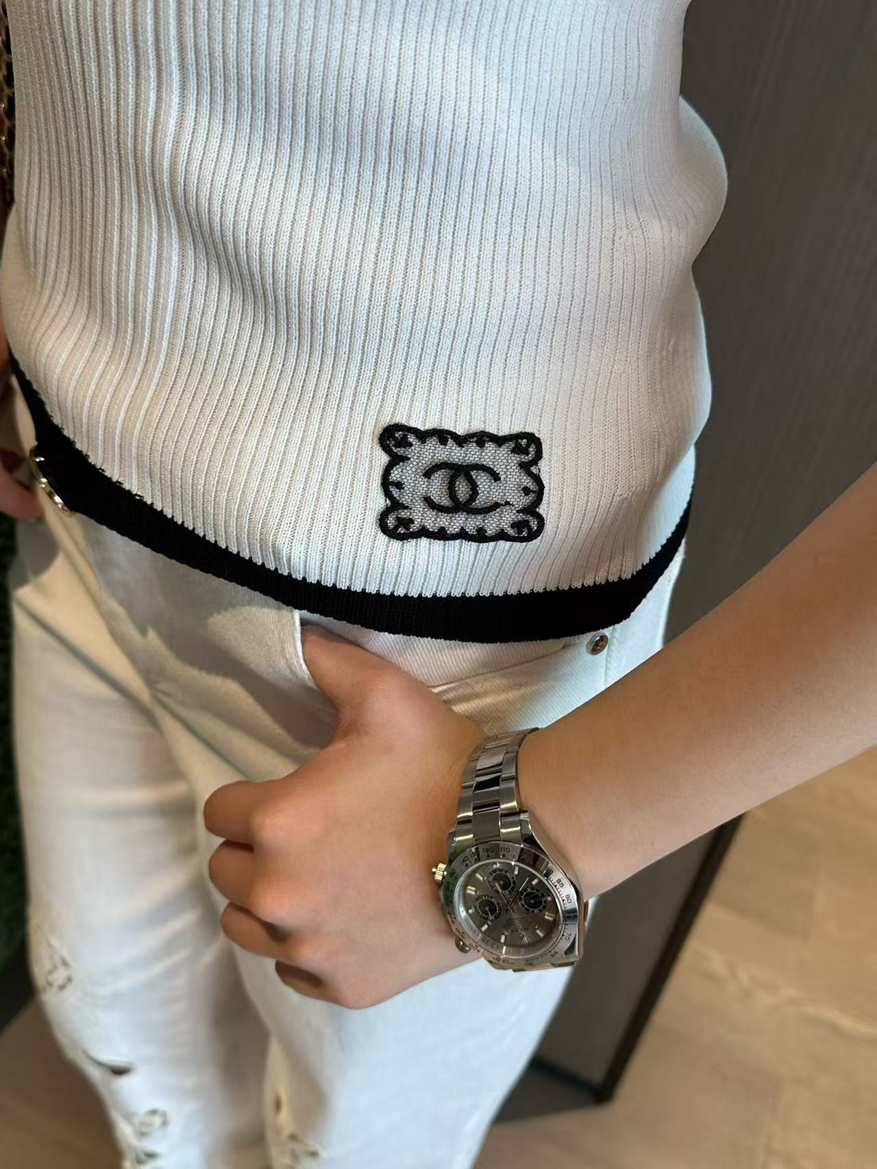 撞色飾邊:背心採用了經典的黑白撞色飾邊,這個設計不僅充滿了標誌性風格,也讓整件衣服看起來更加精緻、俐落。