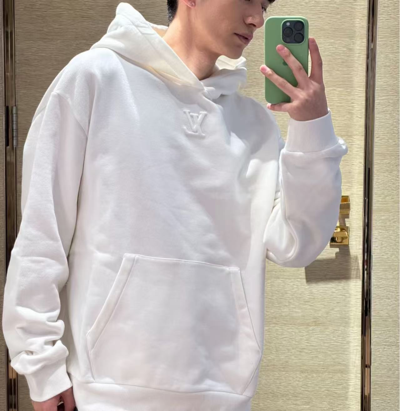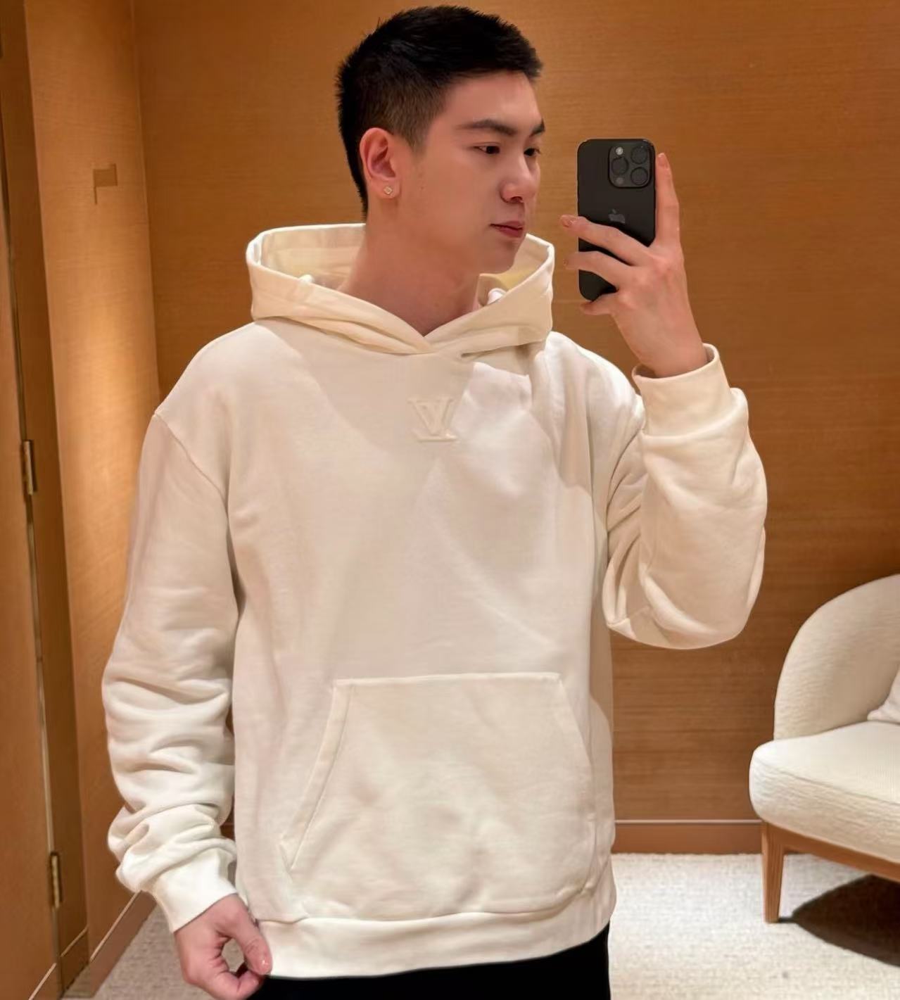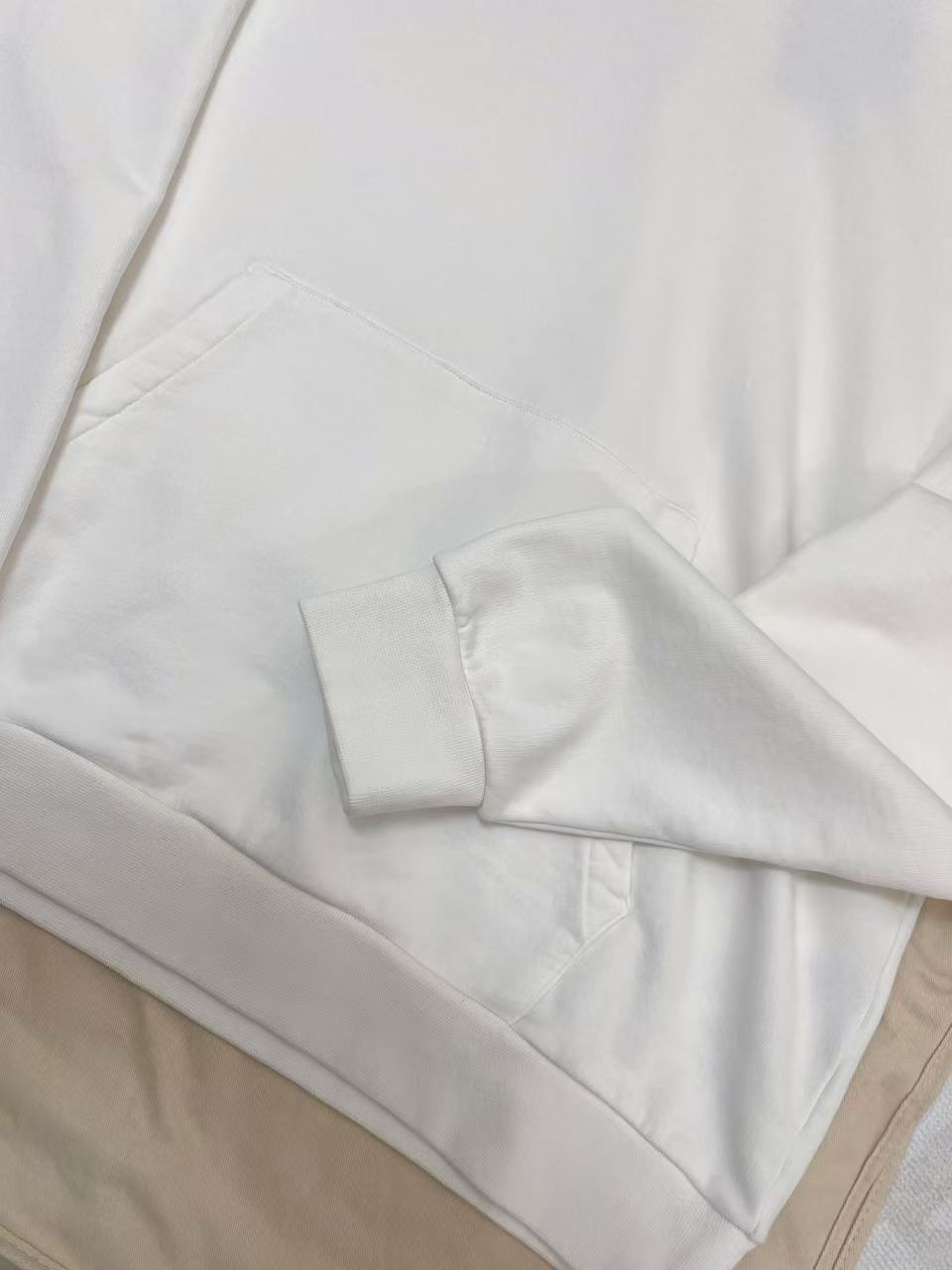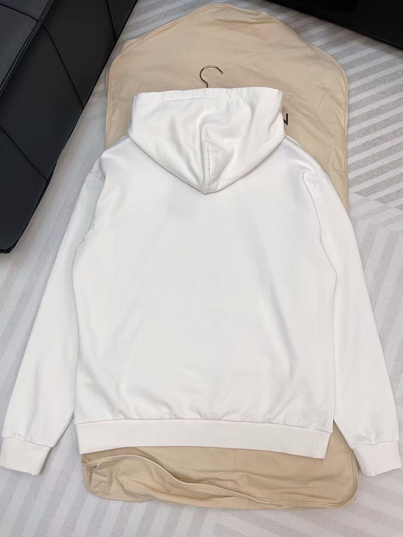 標誌性連帽衫始終是精品休閒穿搭中的常青單品。這款連帽衫將運動服的隨性與高級時裝的細緻完美融合,呈現出俐落且具備層次感的視覺效果。