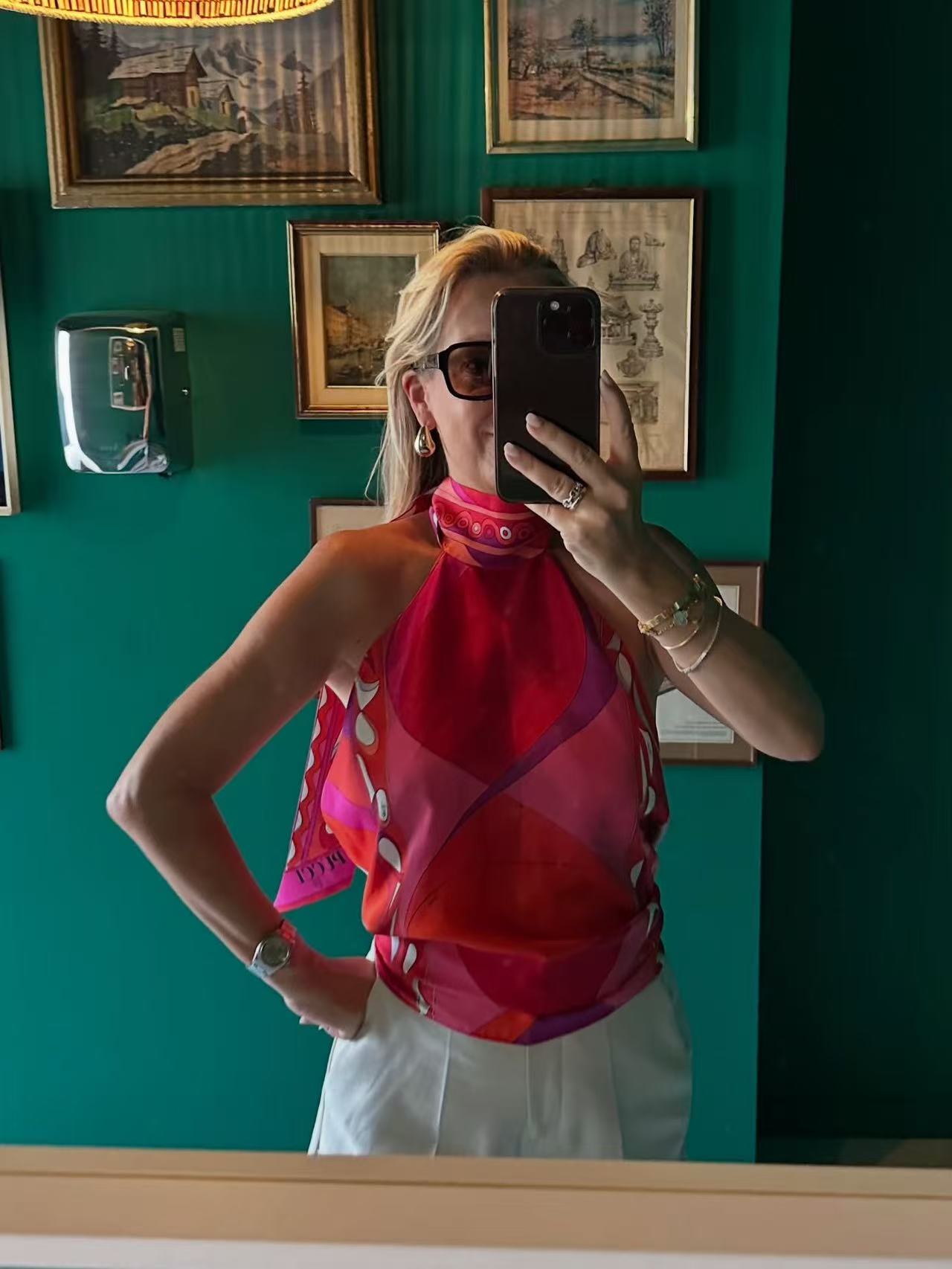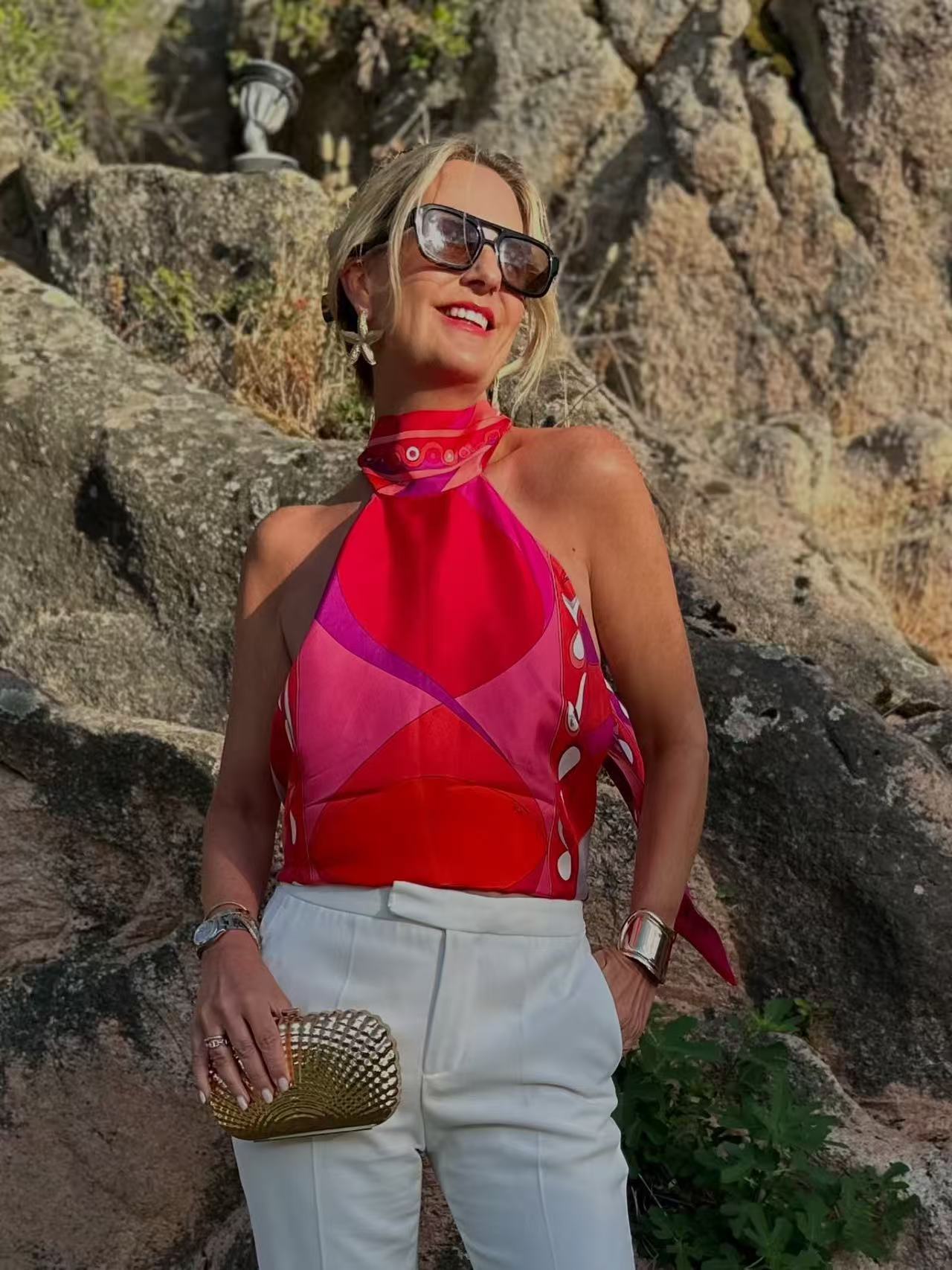 P家 紅色漩渦掛脖真絲上衣