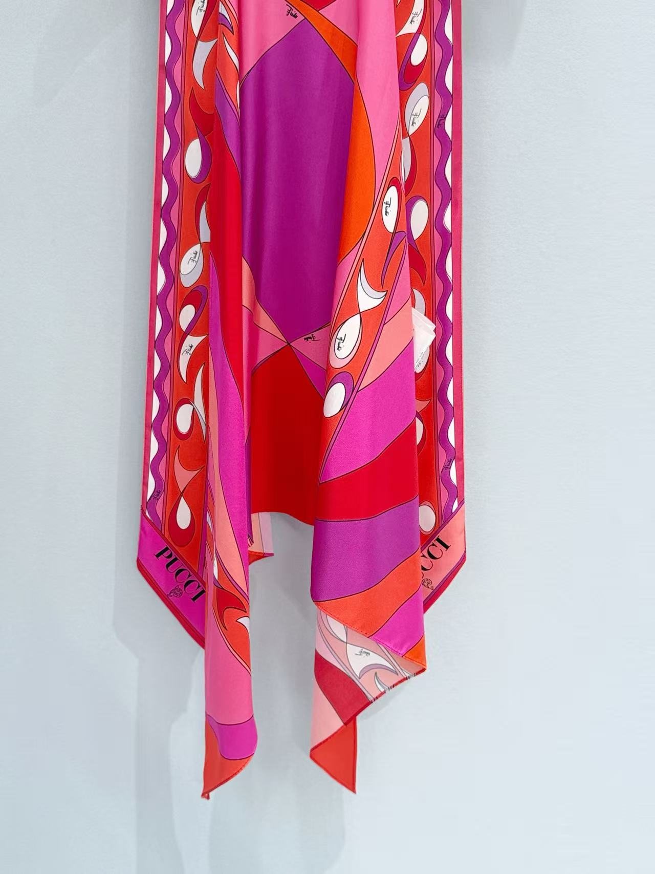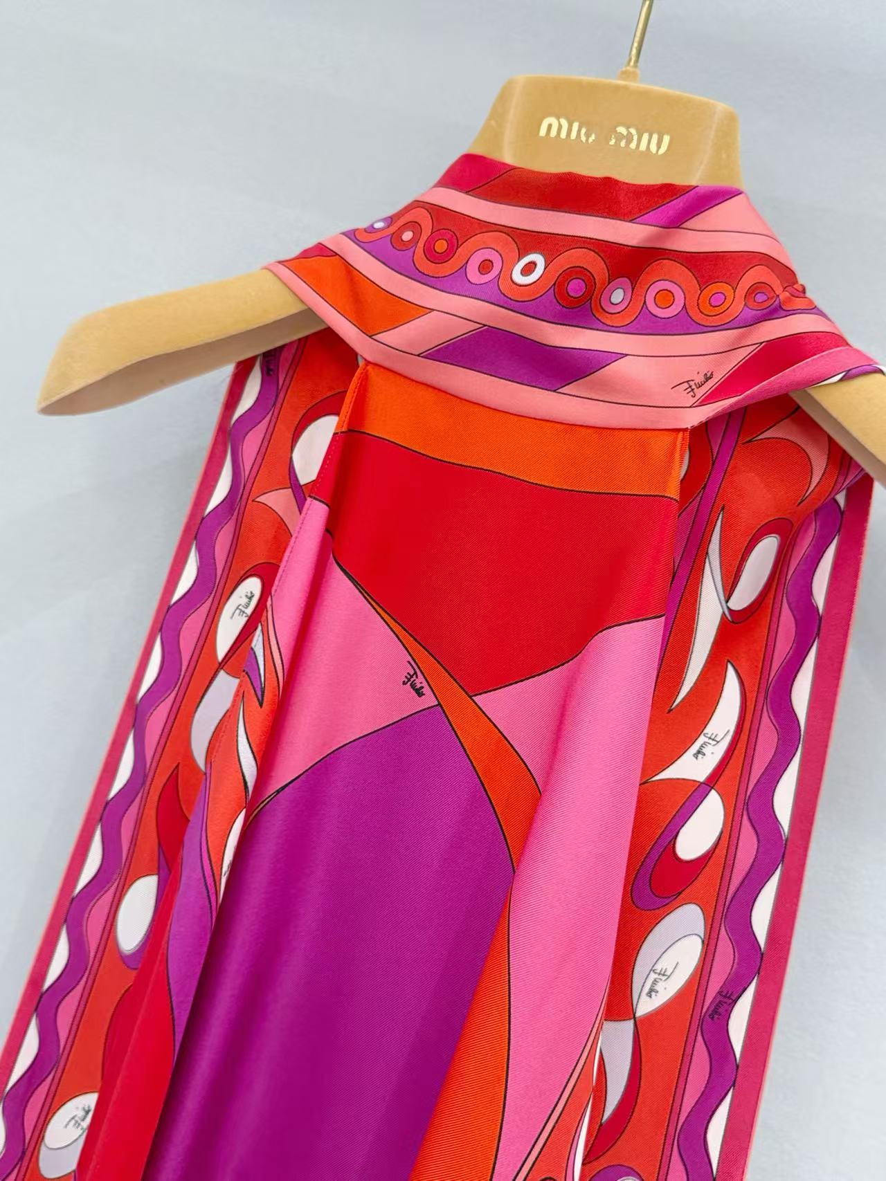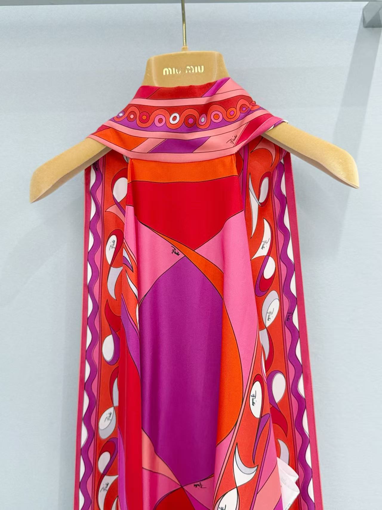 標誌性幾何漩渦噴繪: 採用高精密數位印染技術,將複雜的幾何線條還原得色彩飽滿、層次分明。印花色彩與絲綢光澤完美融合,展現出藝術品等級的視覺張力。