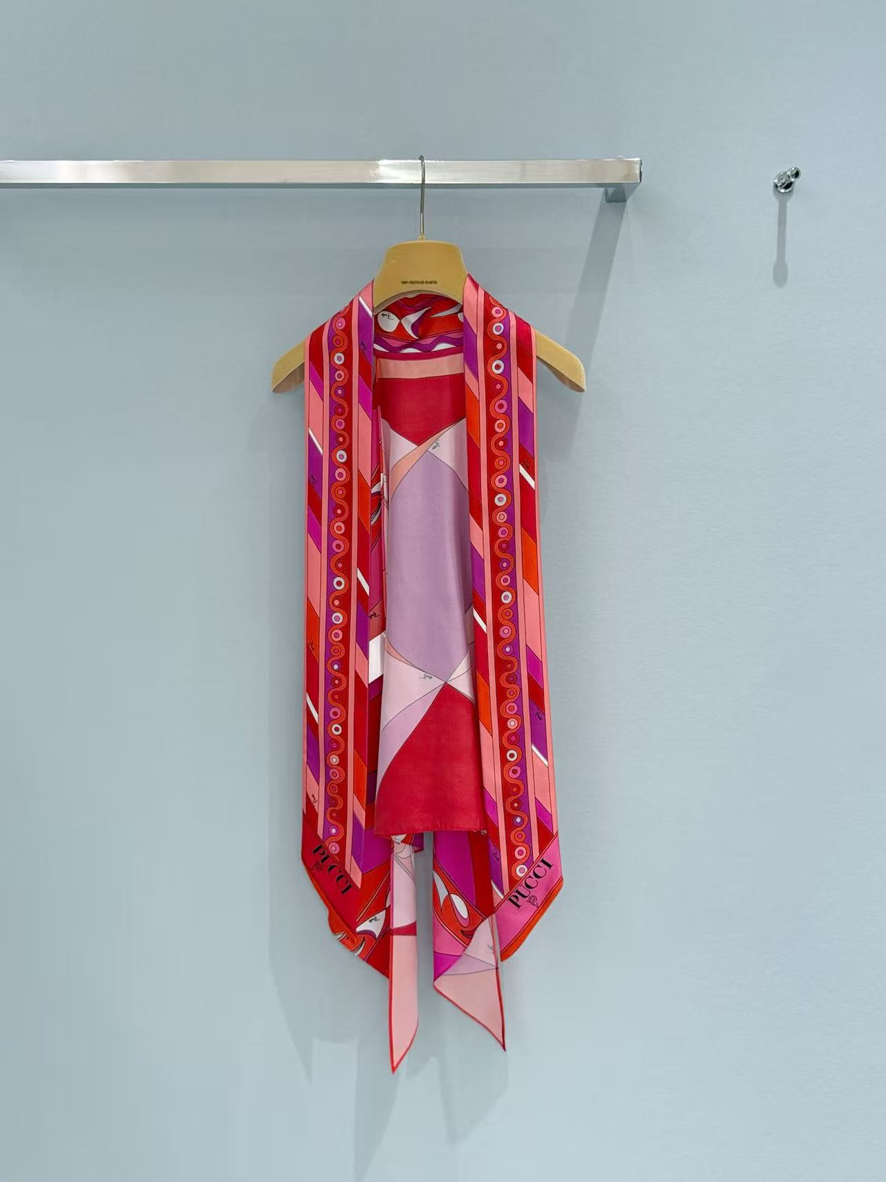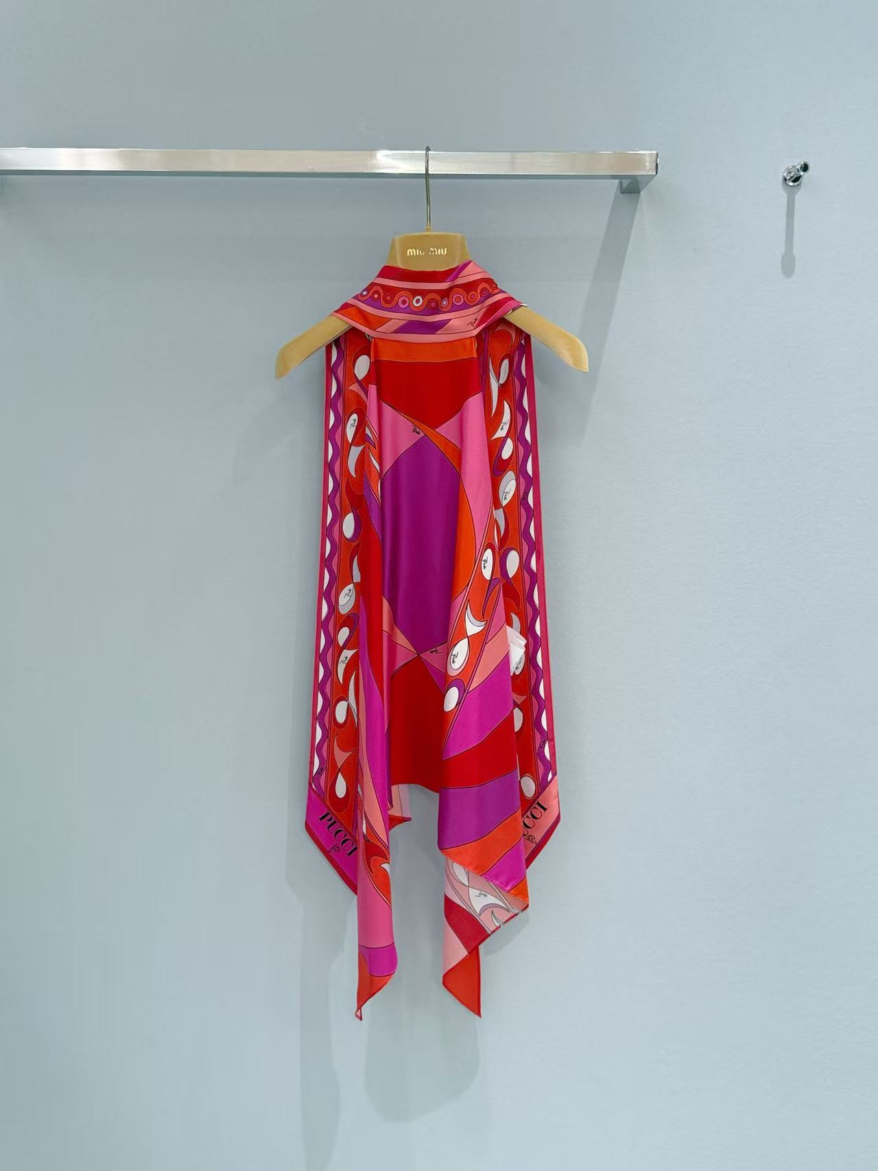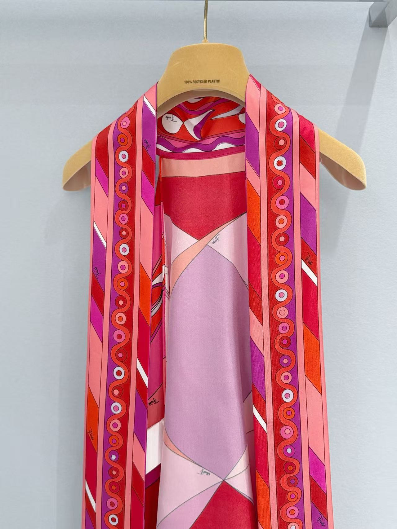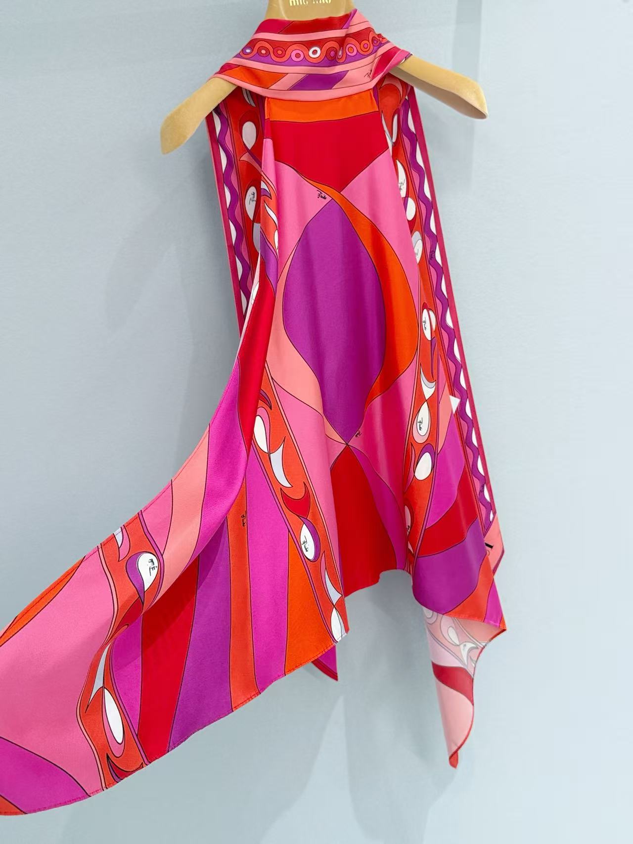 標誌性幾何漩渦噴繪: 採用高精密數位印染技術,將複雜的幾何線條還原得色彩飽滿、層次分明。印花色彩與絲綢光澤完美融合,展現出藝術品等級的視覺張力。