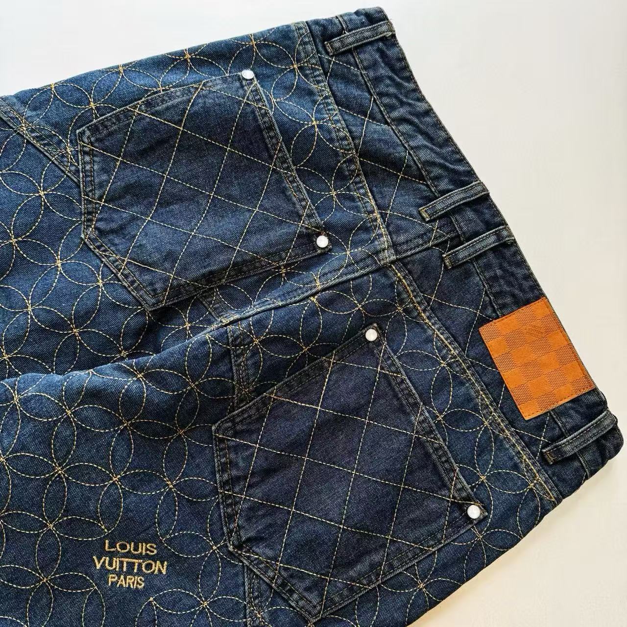 此工藝透過極細針腳與高密度排列,形成細如米粒的立體圖案,從遠看是整齊圖樣,近看又能感受到一針一線的細膩紋理。每件褲子耗時極長,完全展現出高端刺繡工藝的極致。