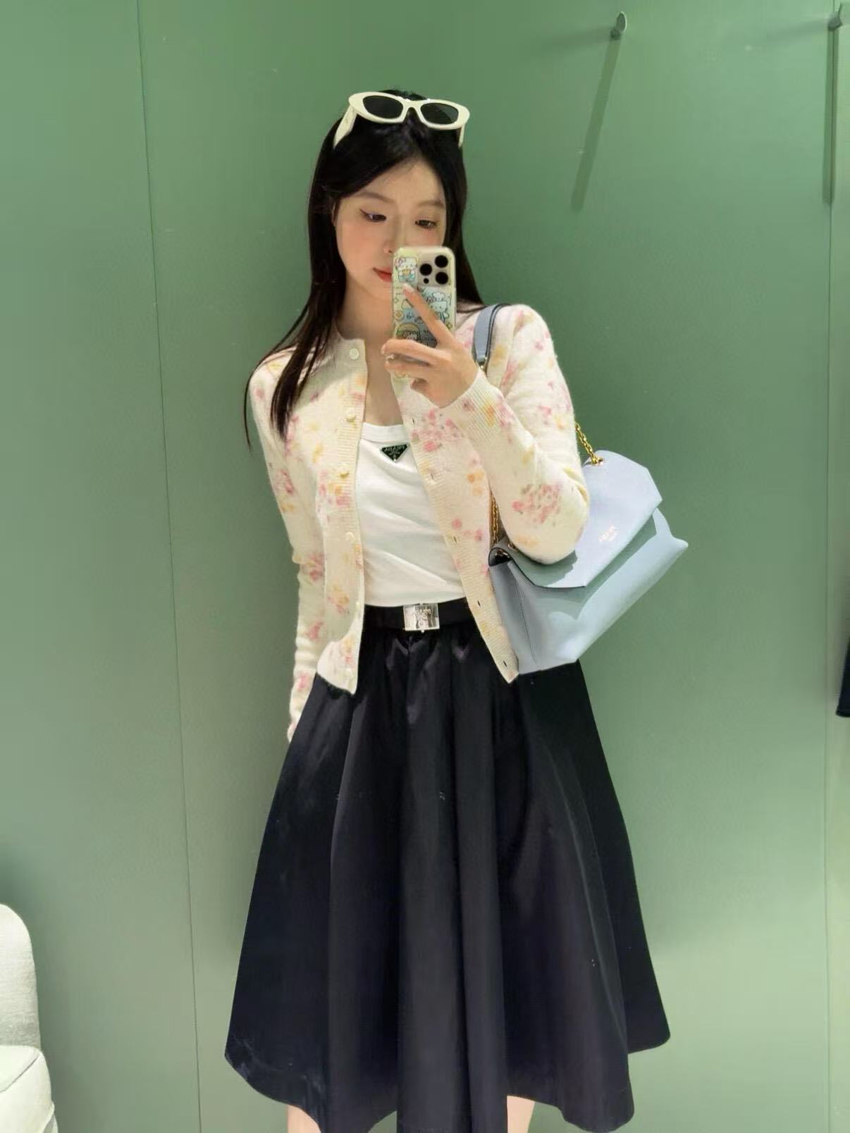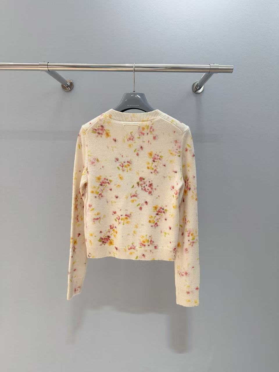 這件針織開衫以柔和米白作為底色,搭配酸性數位印花的小碎花,帶有一種清新又靈動的氛圍。