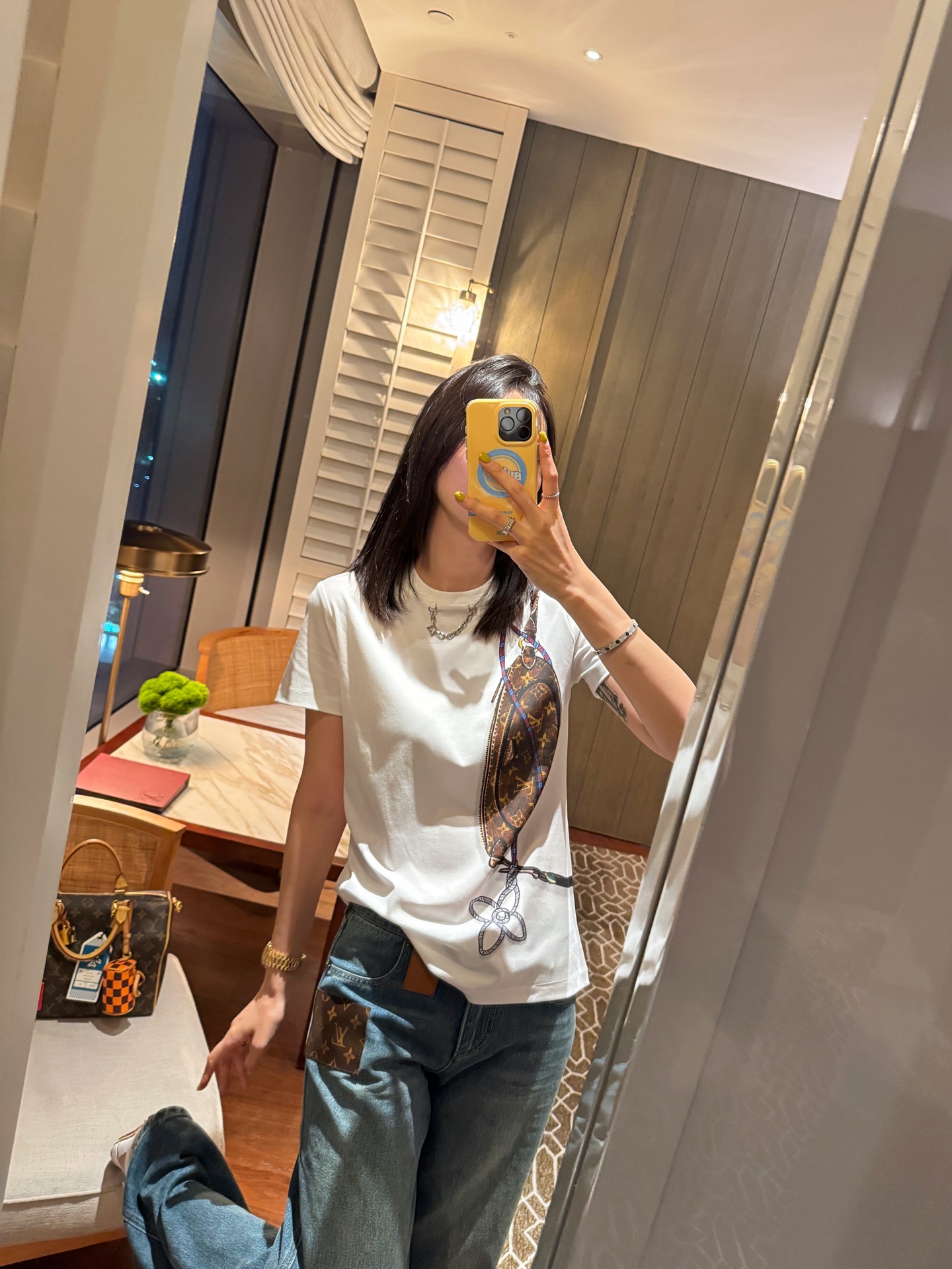 這款設計真的太有意思了——右側肩部以「Keepit 腰包」為靈感,結合 Damier 格紋錯視效果圖案,讓整件 T 恤多了一份層次感與玩味。再加上以繽紛繩索勾勒出 Monogram 花卉圖案,整體視覺充滿活力與個性。