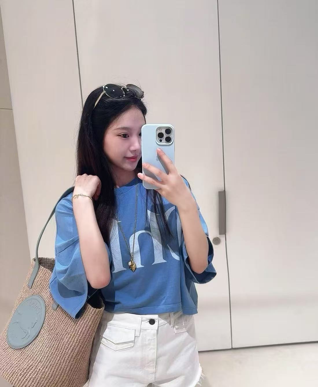 衣長設計得剛剛好,稍微舉手就能露出腰線,搭配高腰牛仔褲或妳之前看中的 Pucci 迷幻漩渦長裙,瞬間拉長腿部比例,顯高又顯瘦。