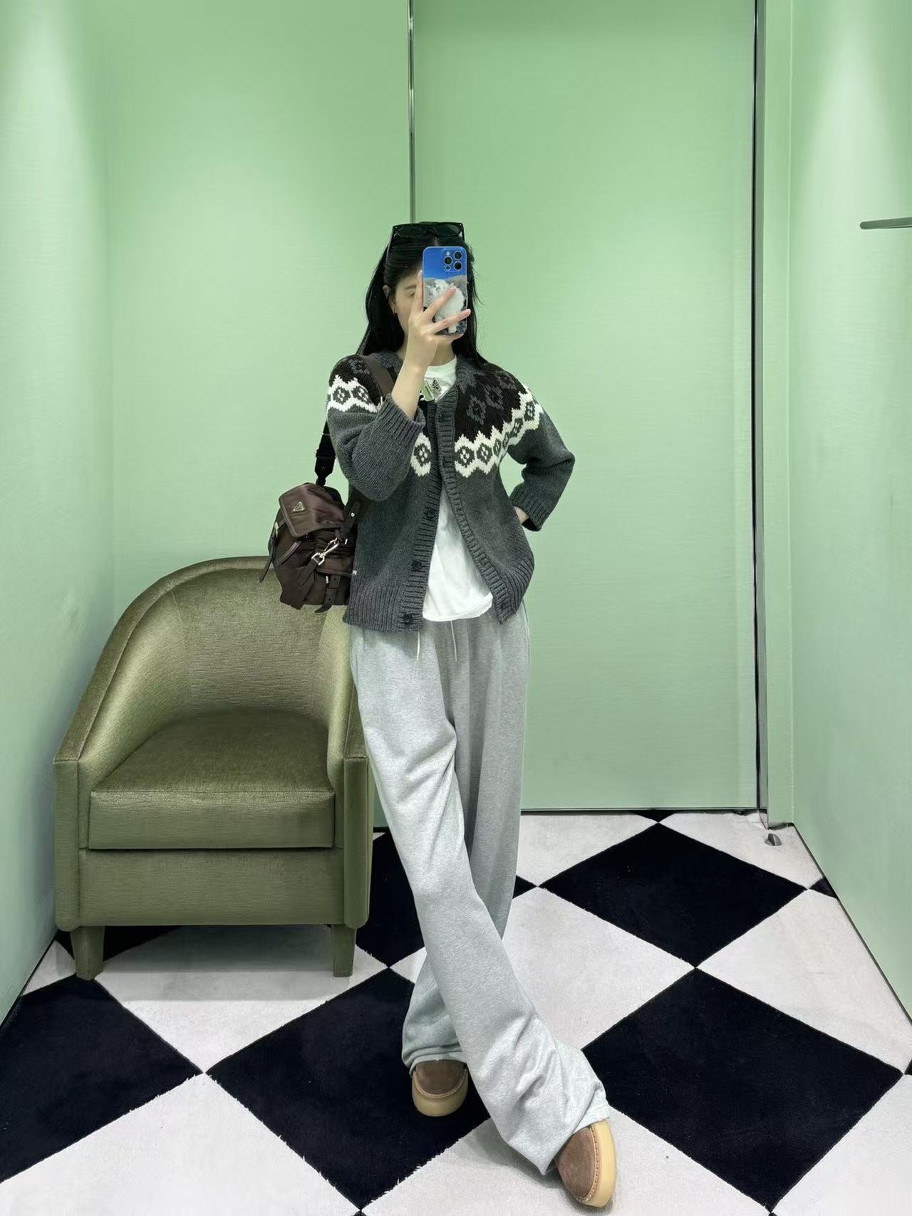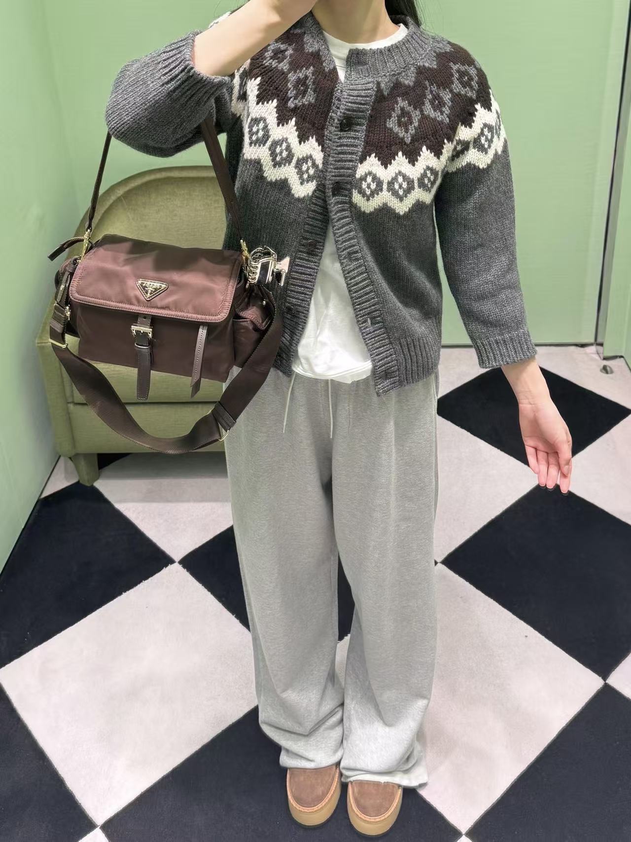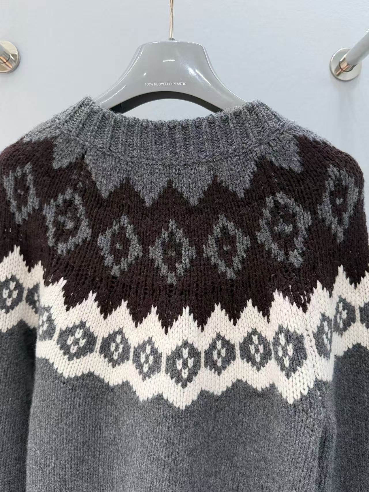 配色質感滿分: 以沉穩的深灰色為底,疊搭上棕色與白色的經典費爾島幾何花紋。這種北歐風的圖騰自帶一股高級又鬆弛的氛圍感,隨便一套都時髦!