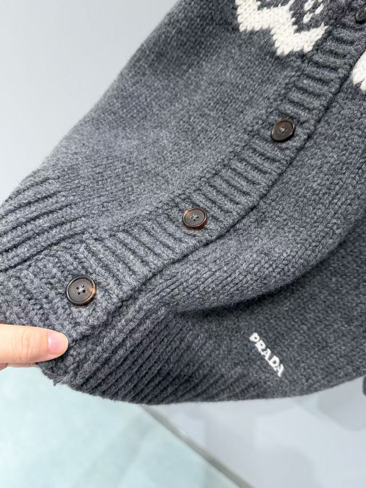 品牌識別度: 門襟搭配簡約的黑色鈕扣,下擺處低調地綴有品牌徽標,雖然設計簡單,但一眼就能看出這是 P家的風格,簡約裡藏著滿滿的辨識度!